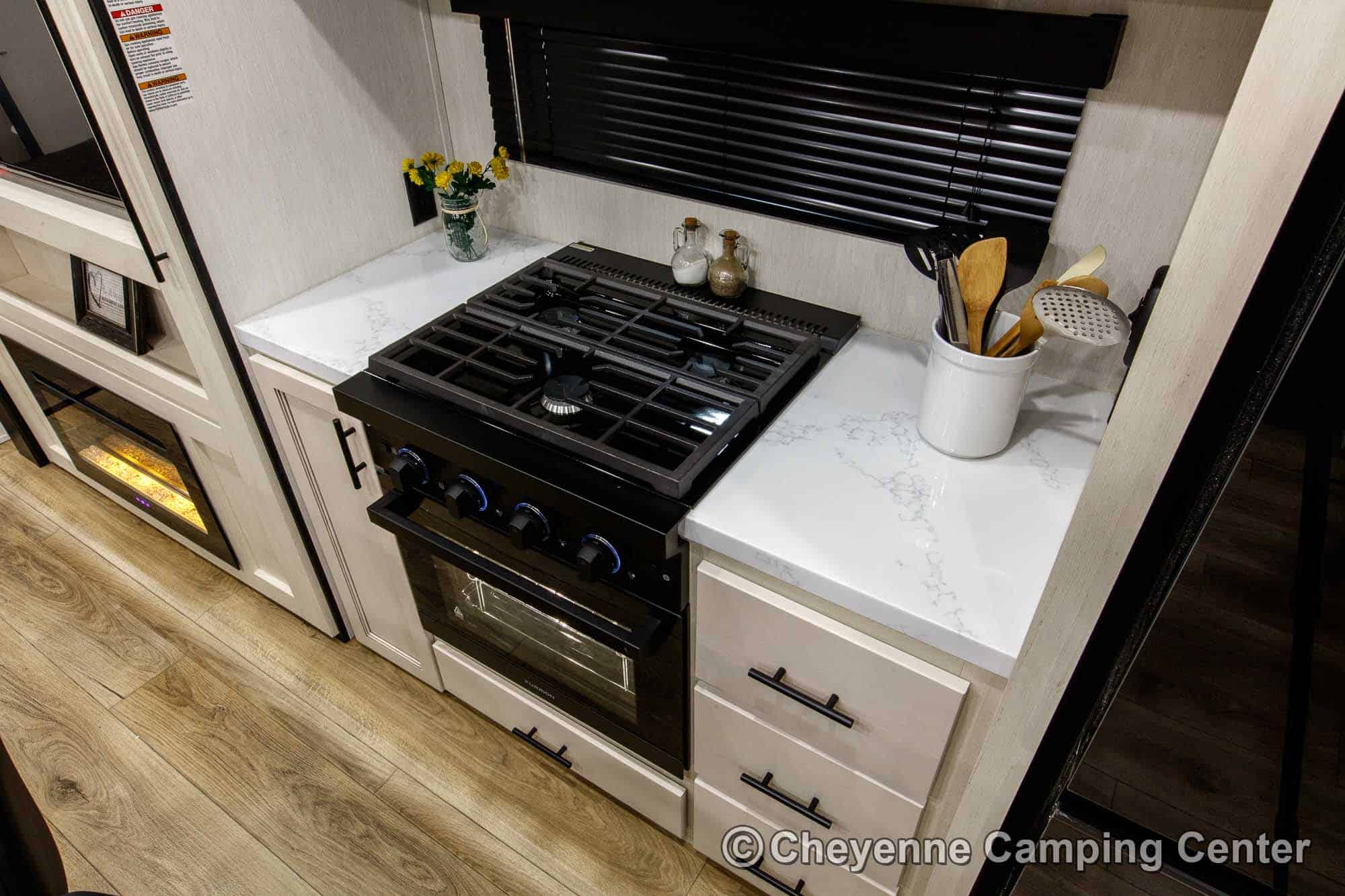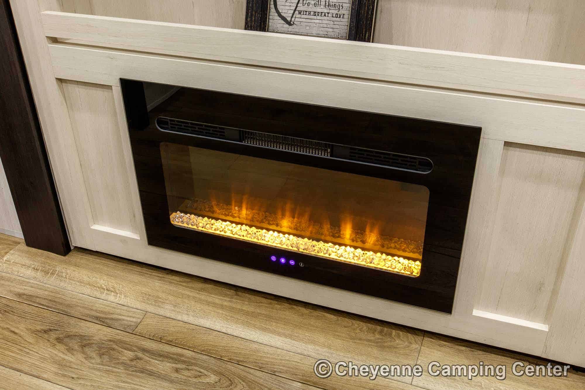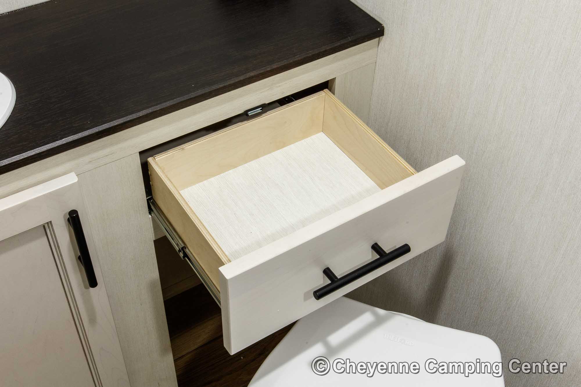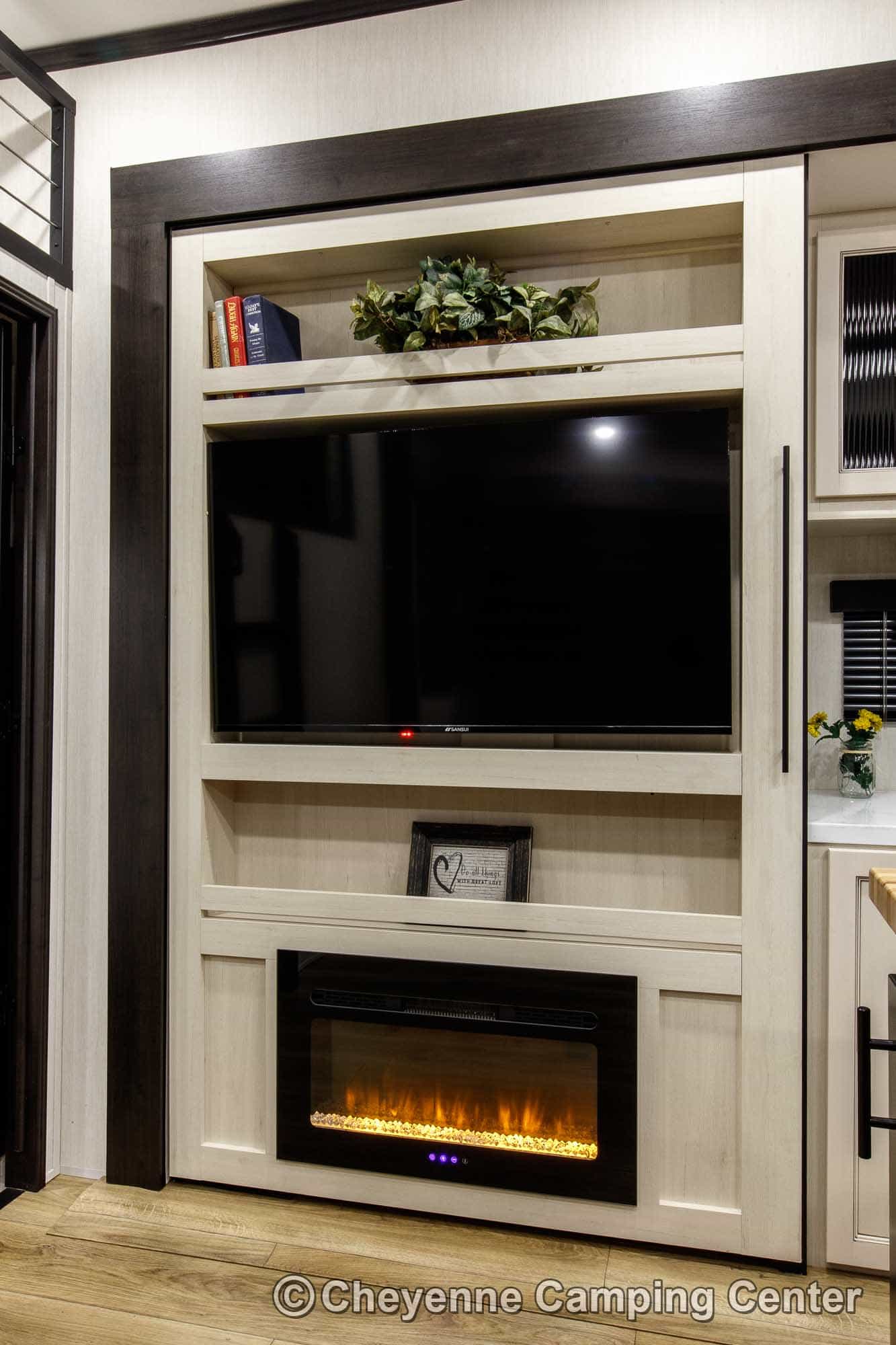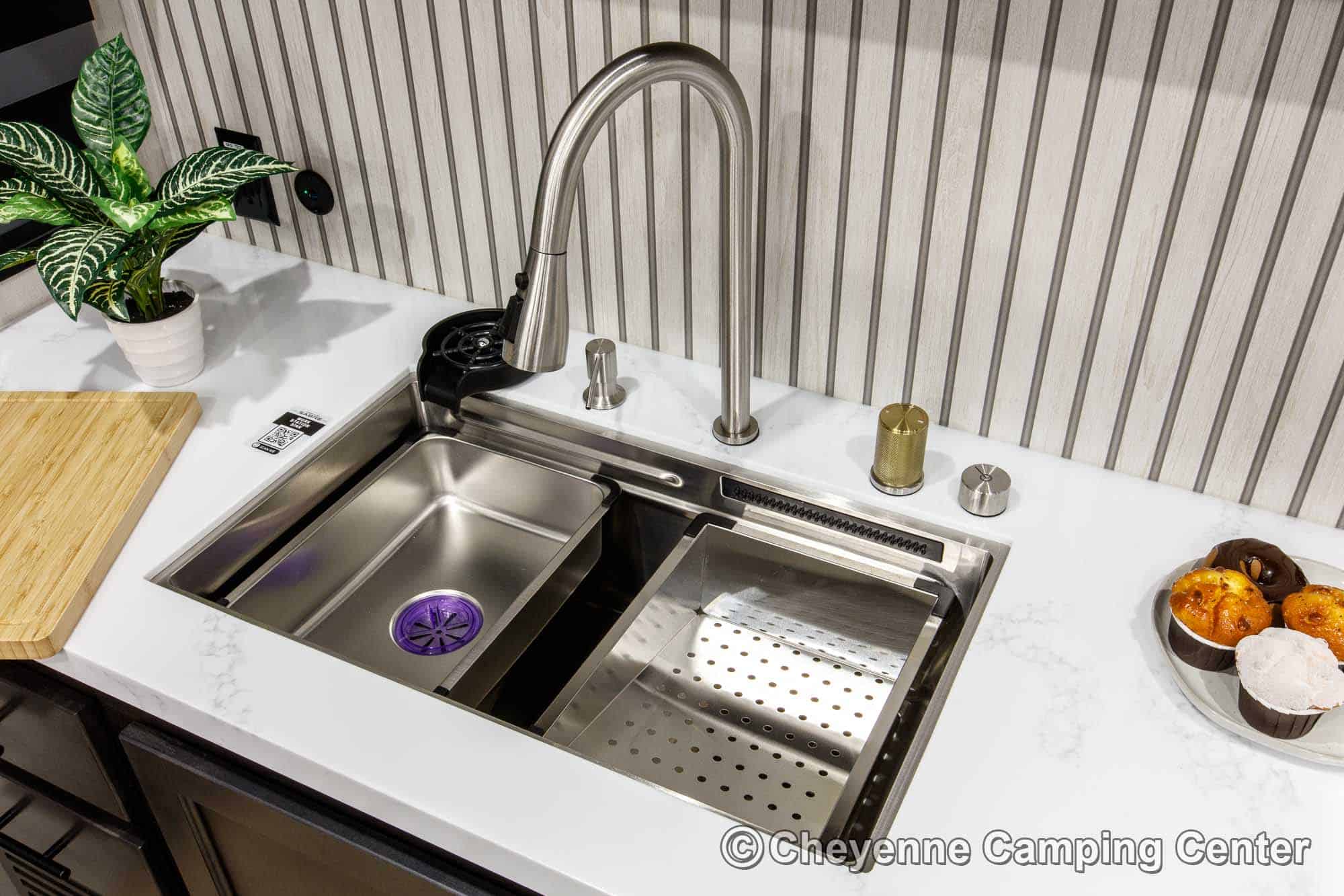 Step inside the 36DBB and prepare to be impressed. This two bedroom fifth wheel delivers the features and finishes of a luxury coach at an affordable price. The stunning kitchen is designed for both style and functionality, featuring a butcher-block dining island with four chairs and an extension, solid-surface countertops, and abundant counter space. You’ll have plenty of storage with numerous cabinets, drawers, and a huge hidden pantry cleverly tucked behind the entertainment center. Cooking is a breeze with a large oven, microwave/convection oven combo, residential-style refrigerator, workstation sink, and a full-size pull-out trash can that adds everyday convenience.