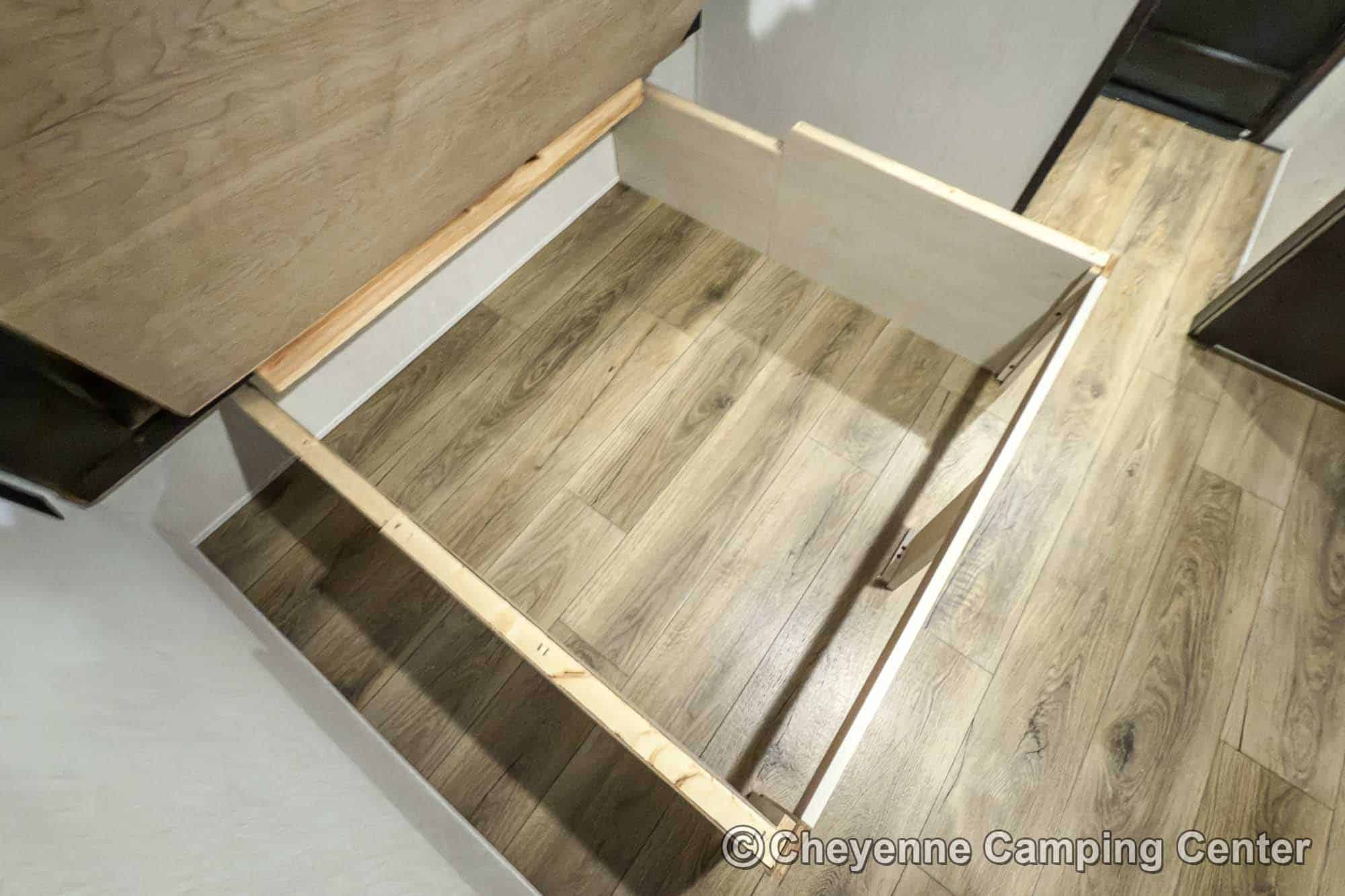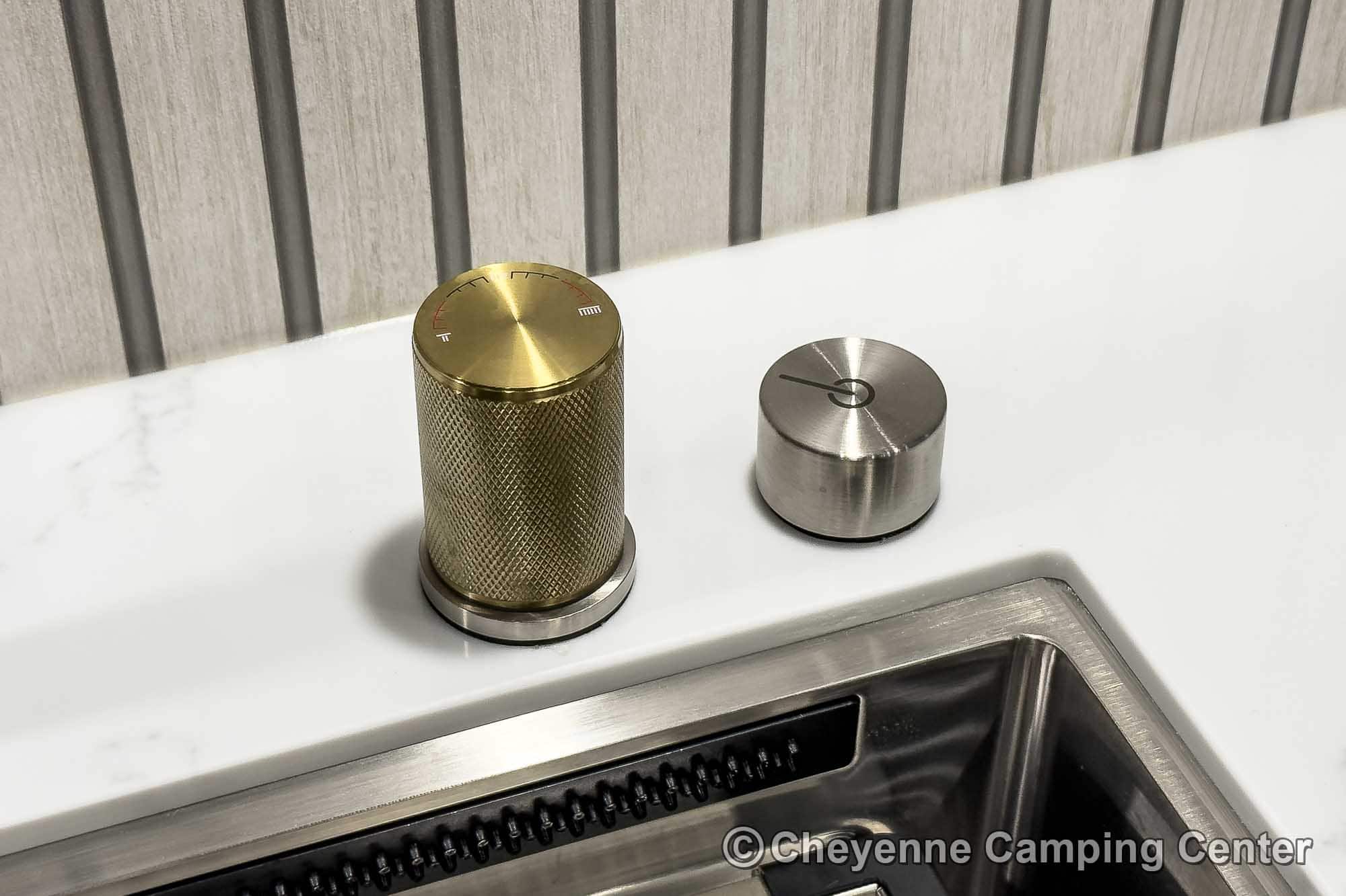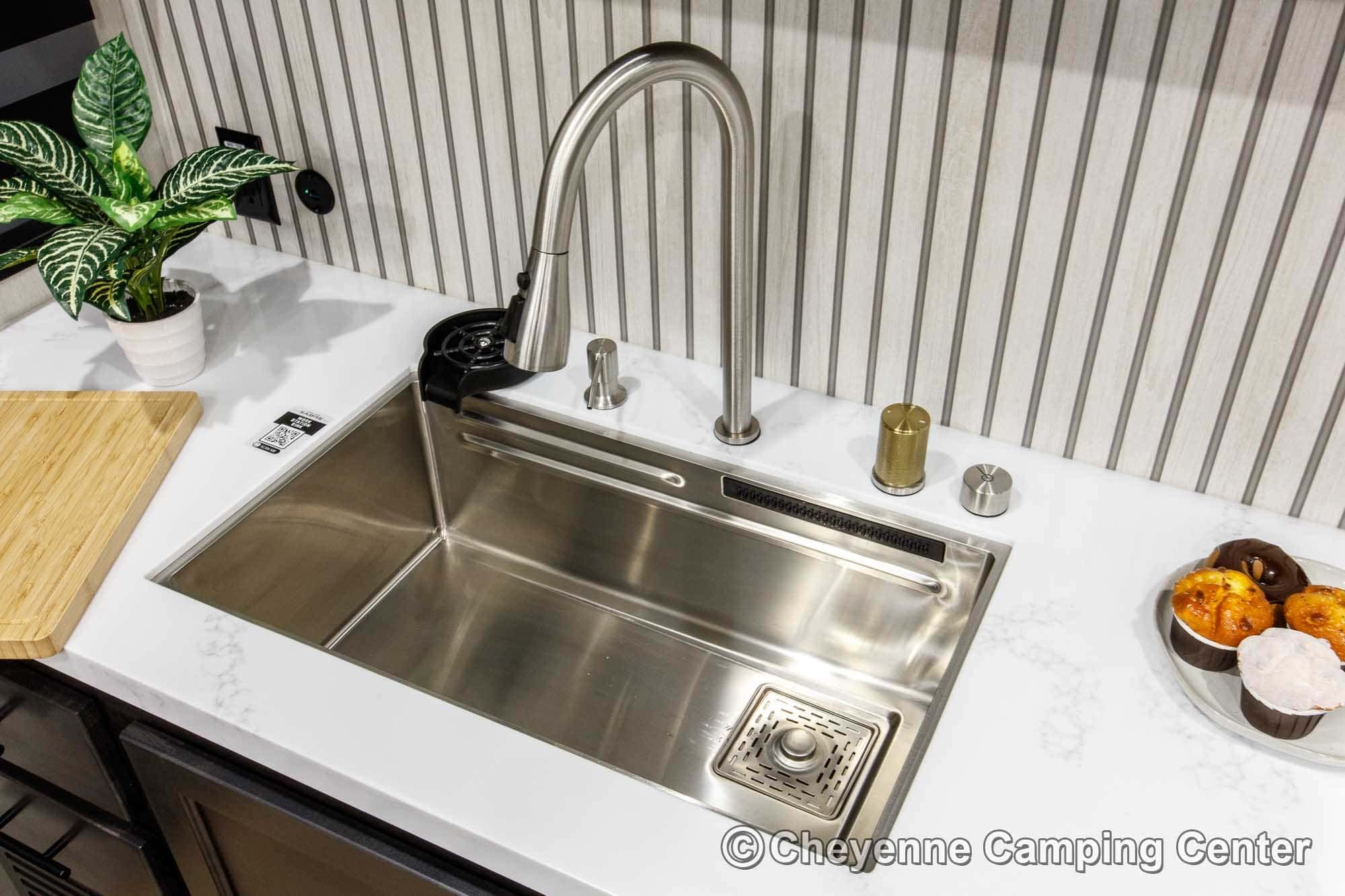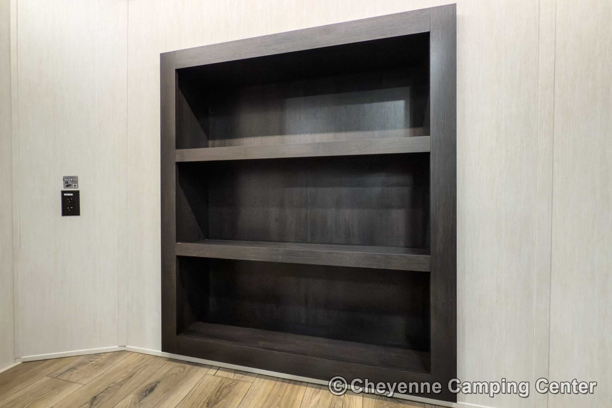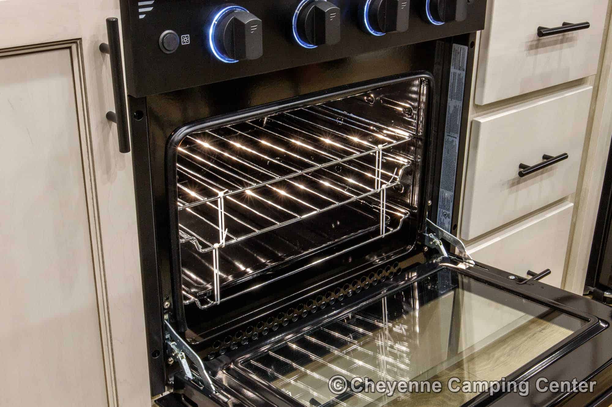 Step inside the 36DBB and prepare to be impressed. This two bedroom fifth wheel delivers the features and finishes of a luxury coach at an affordable price. The stunning kitchen is designed for both style and functionality, featuring a butcher-block dining island with four chairs and an extension, solid-surface countertops, and abundant counter space. You’ll have plenty of storage with numerous cabinets, drawers, and a huge hidden pantry cleverly tucked behind the entertainment center. Cooking is a breeze with a large oven, microwave/convection oven combo, residential-style refrigerator, workstation sink, and a full-size pull-out trash can that adds everyday convenience.