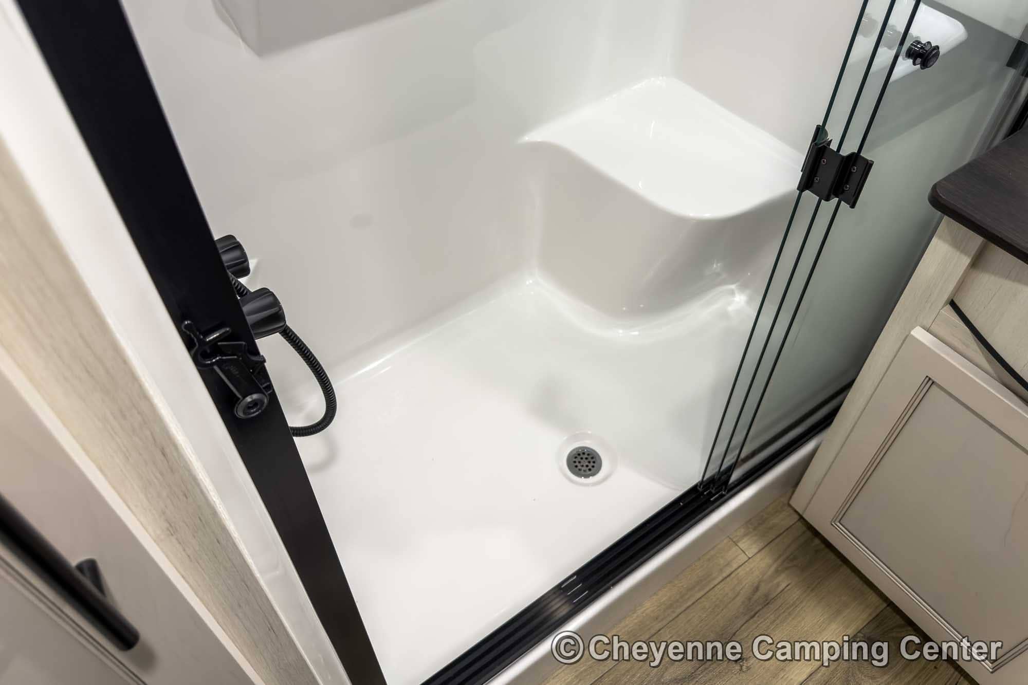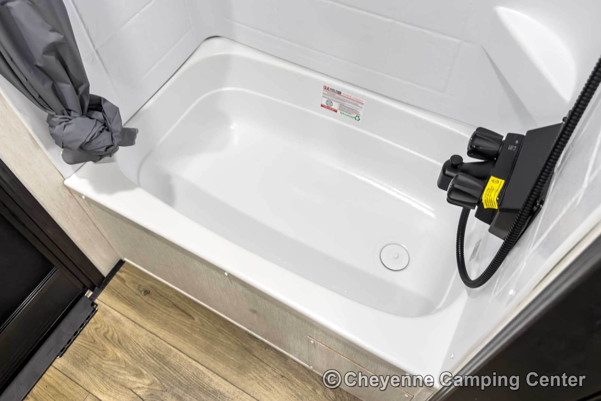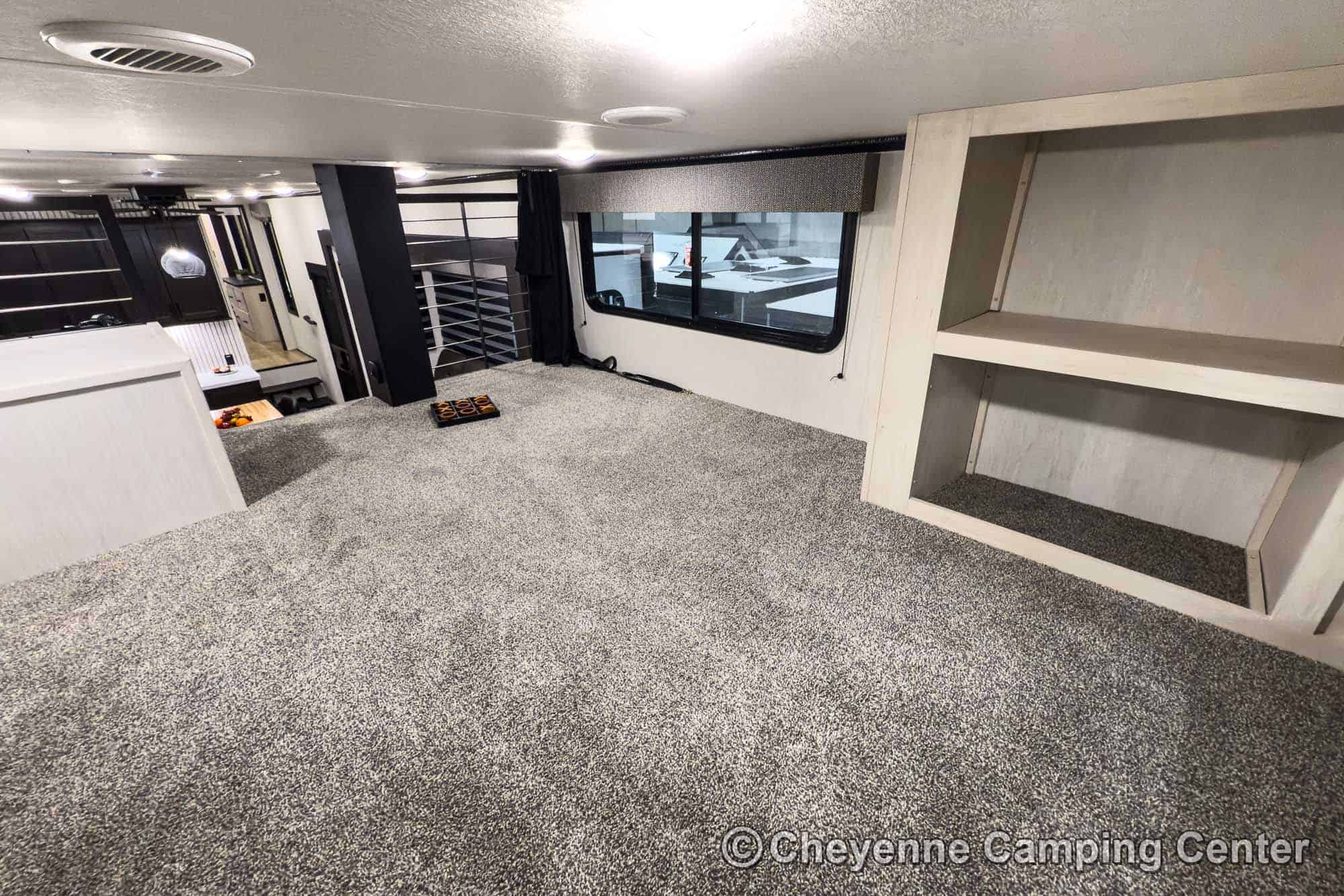 The second bedroom offers exceptional space with opposing slide-outs, a comfortable queen bed, and ample storage in the large wardrobe. The adjoining full bathroom includes a tub/shower combo, a foot-flush toilet, and a vanity. Above the bedroom, the loft provides the perfect spot for extra sleeping space or additional storage, making it ideal for families or guests.