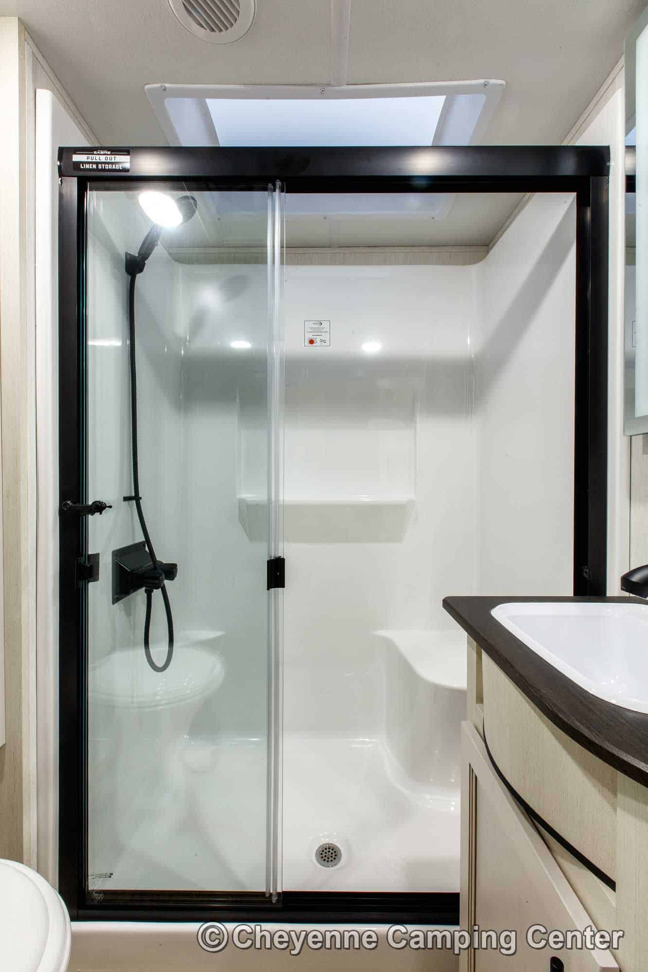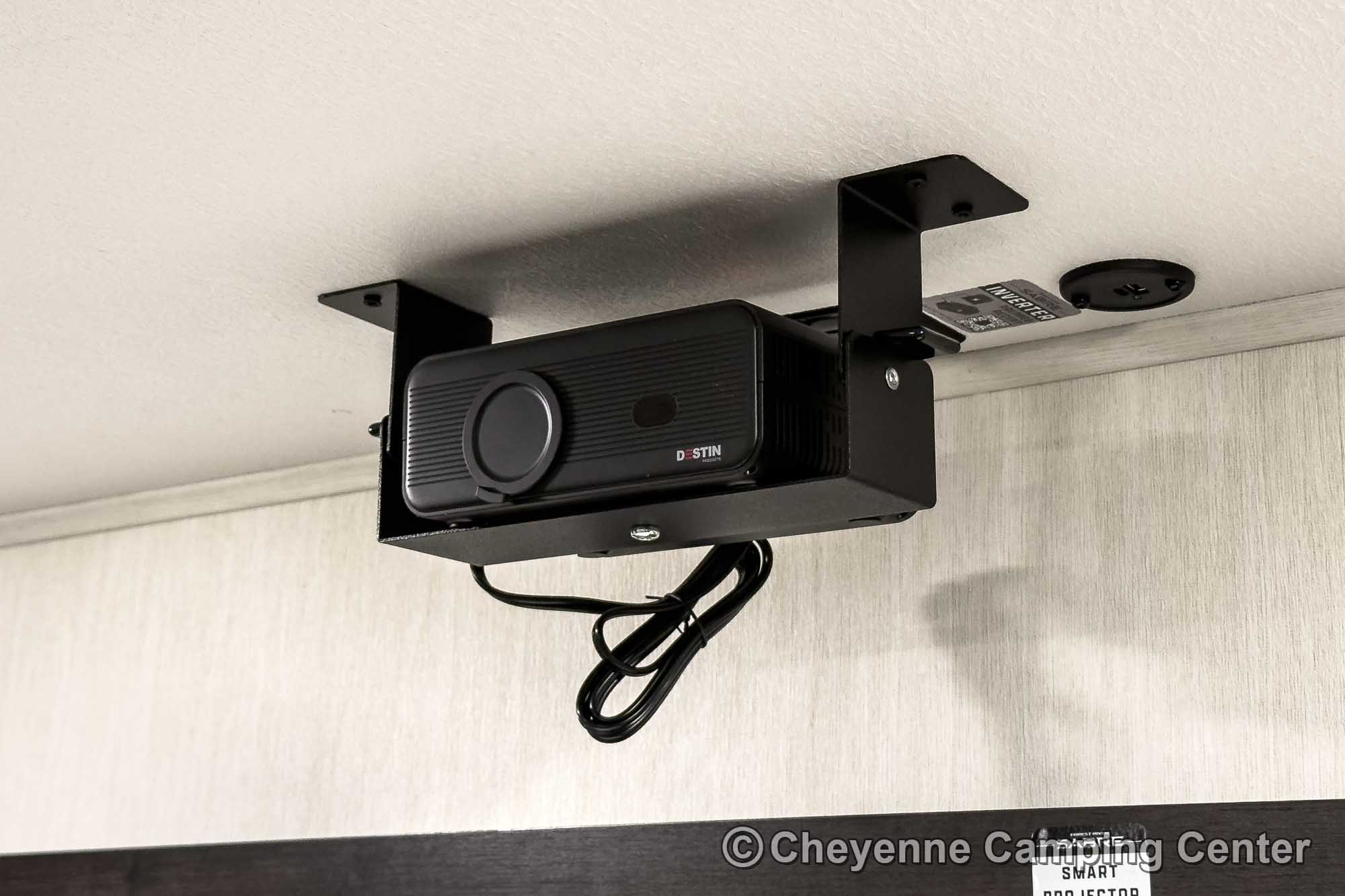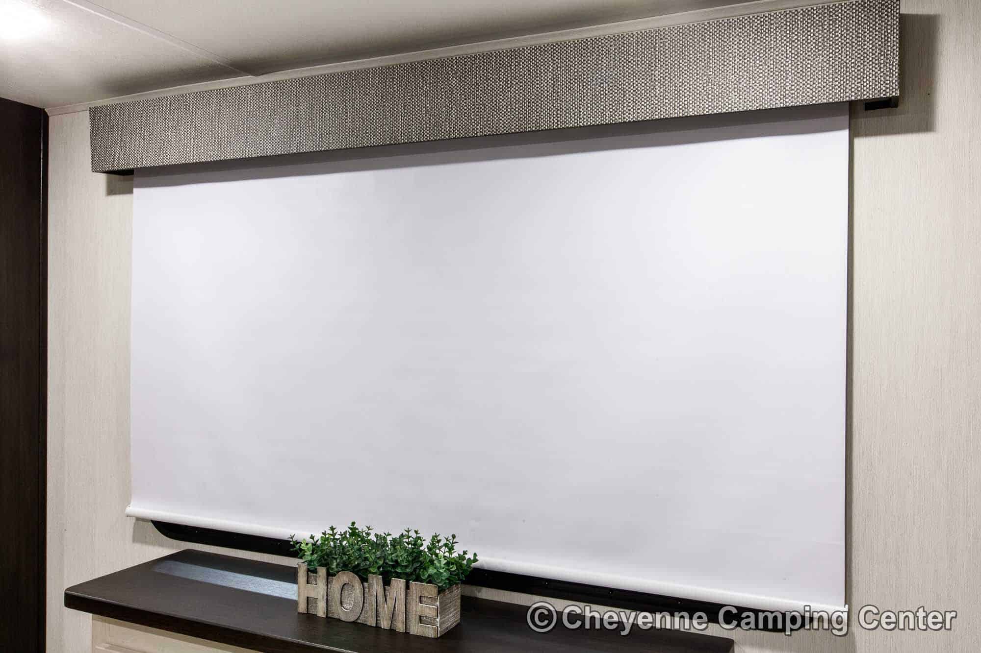 The front slide-out master bedroom features a luxurious RV king bed with storage under, a spacious front wardrobe closet with washer/dryer prep, a dresser, a smart video projector with 70″ screen, and a second air conditioner for optimal comfort. The master bathroom is equally impressive, offering a large shower with a seat and skylight, a foot-flush toilet, a stylish vanity, and a pull-out linen closet.
