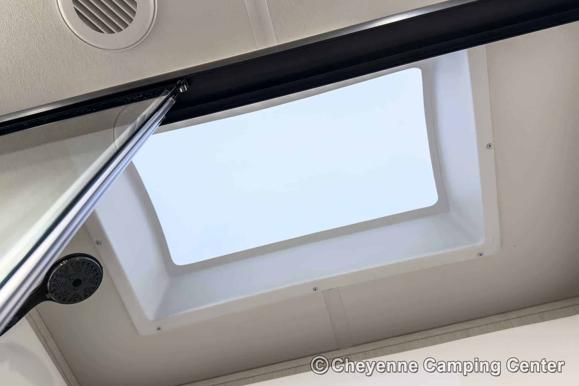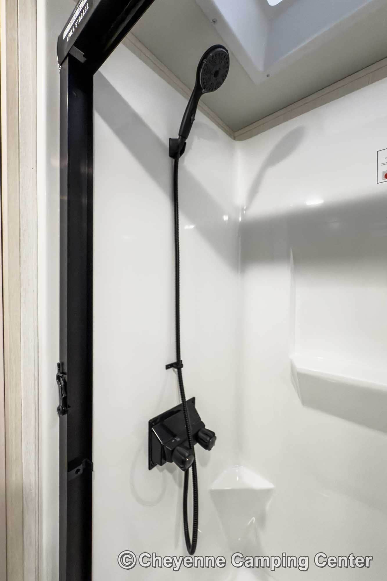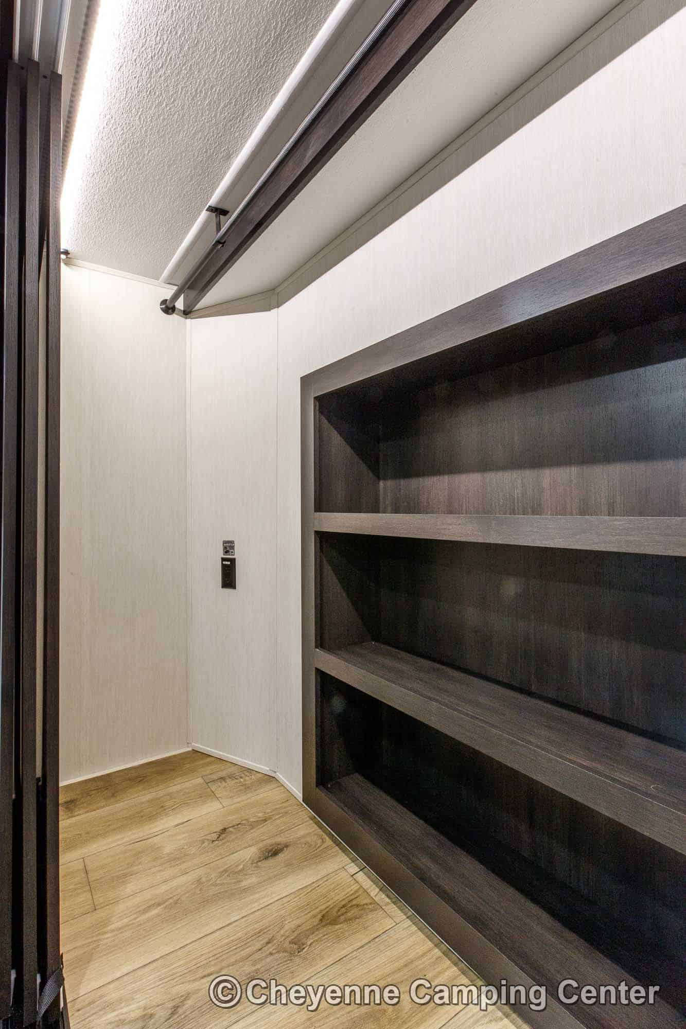 The front slide-out master bedroom features a luxurious RV king bed with storage under, a spacious front wardrobe closet with washer/dryer prep, a dresser, a smart video projector with 70″ screen, and a second air conditioner for optimal comfort. The master bathroom is equally impressive, offering a large shower with a seat and skylight, a foot-flush toilet, a stylish vanity, and a pull-out linen closet.