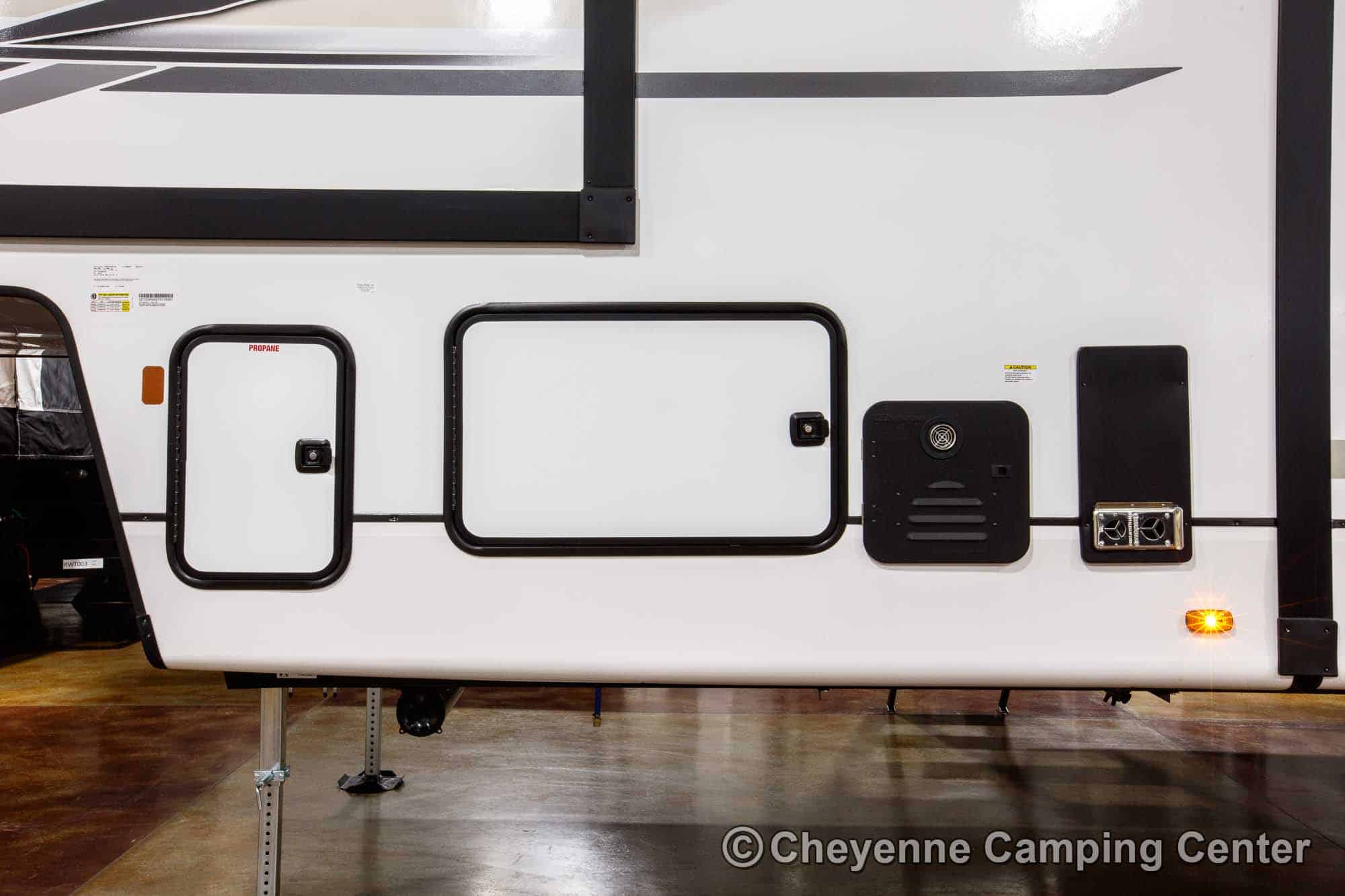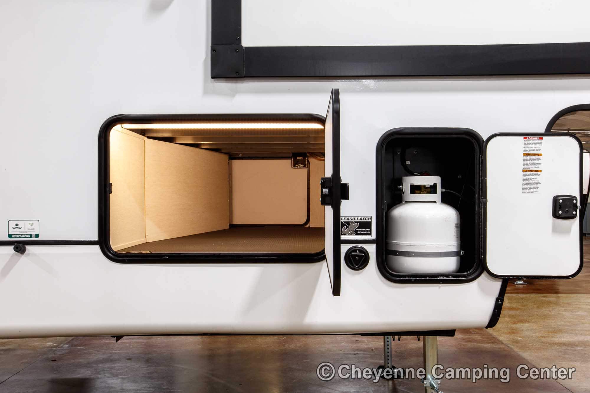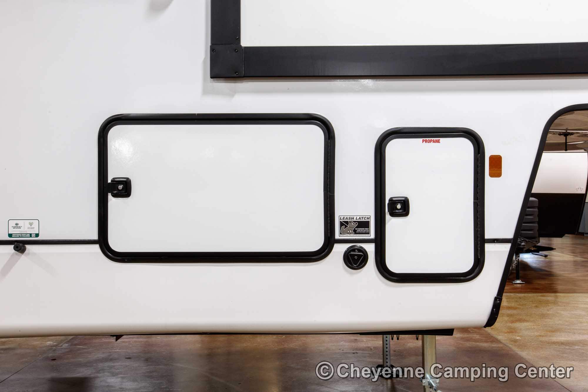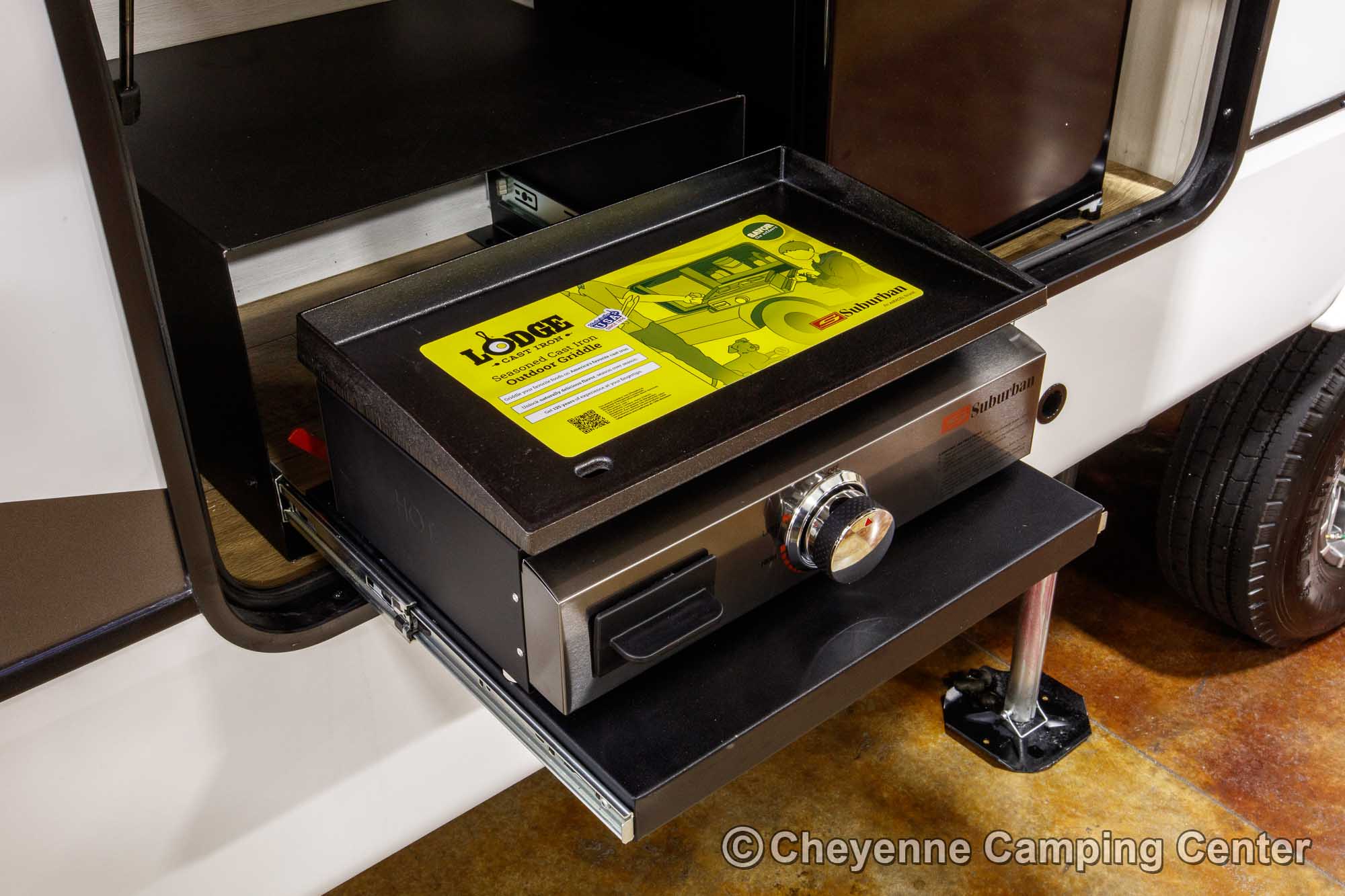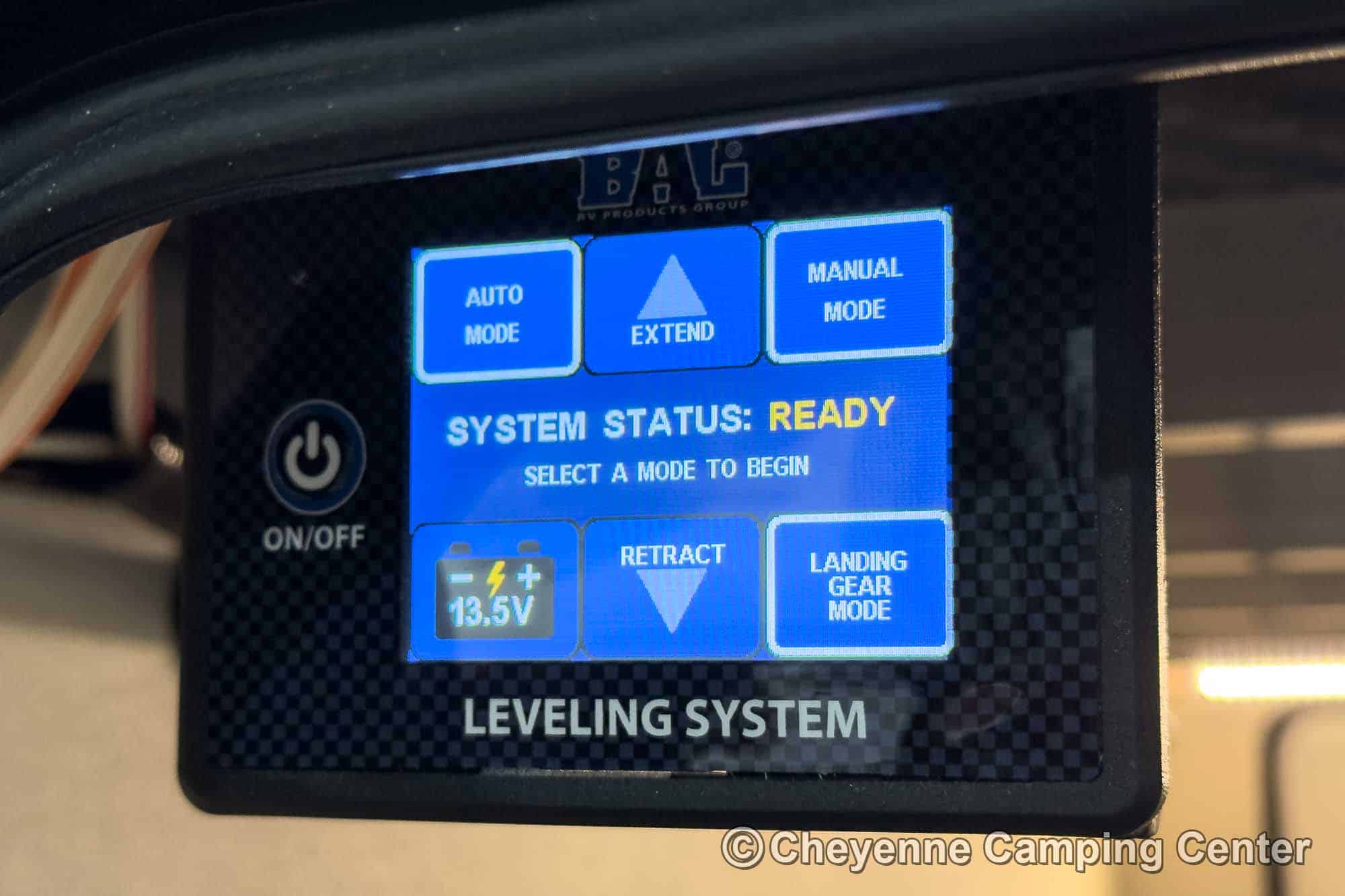 Premium Exterior Features: Outside, you’ll enjoy two power awnings with LED lighting, an outdoor kitchen with a refrigerator, griddle, water fixture, and storage, and a 200-watt solar panel for off-grid flexibility. Automatic leveling makes setup simple, while the towing package and large storage compartments add convenience for every adventure.
