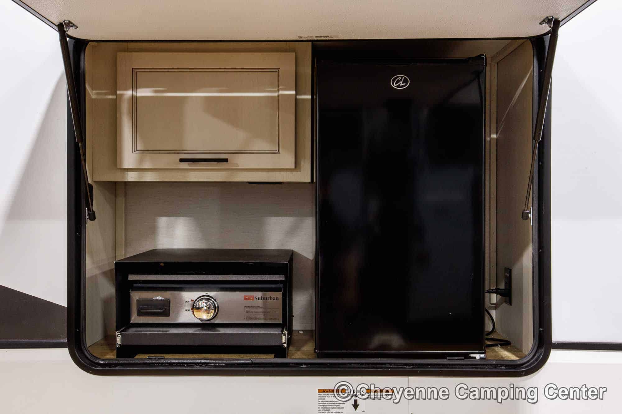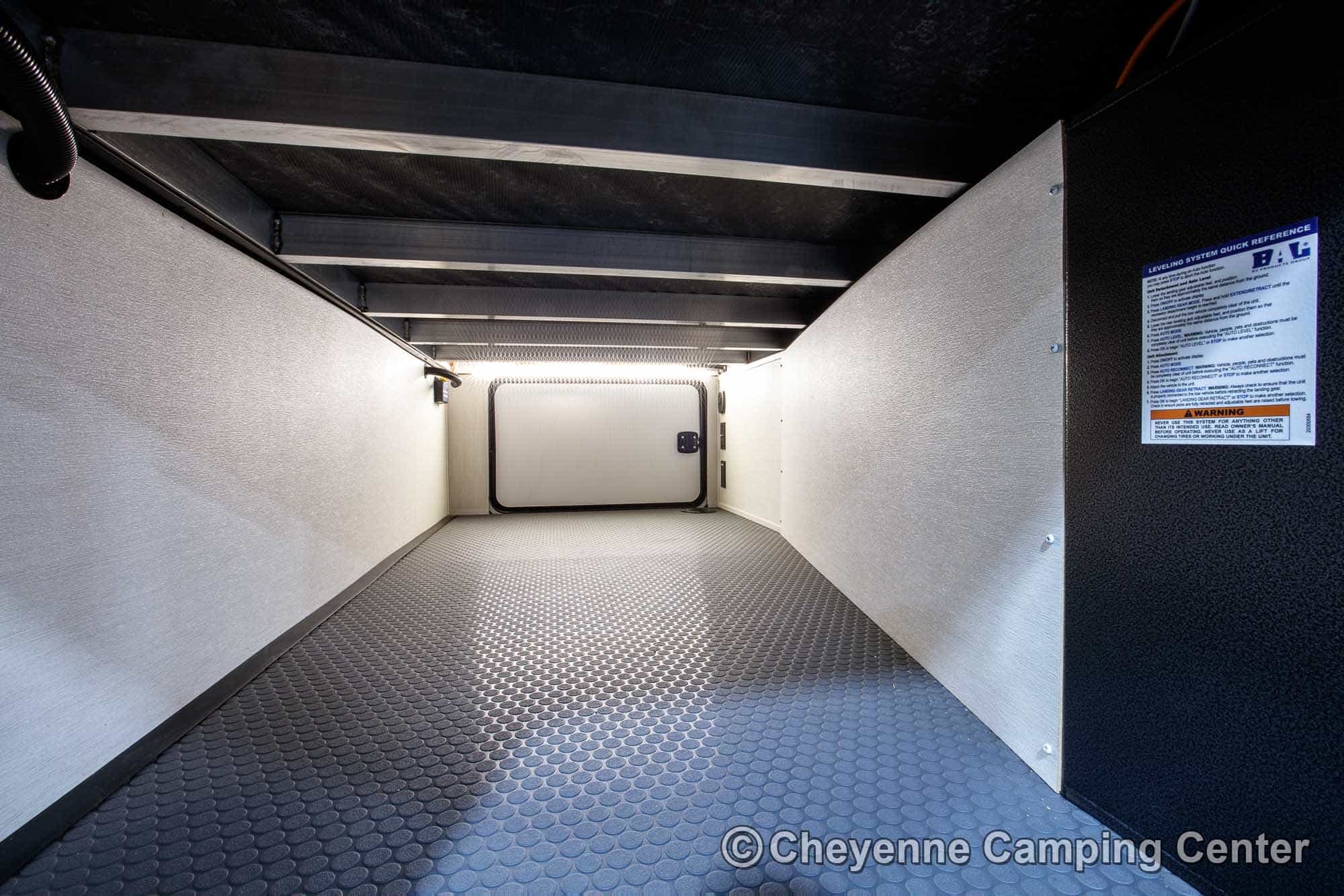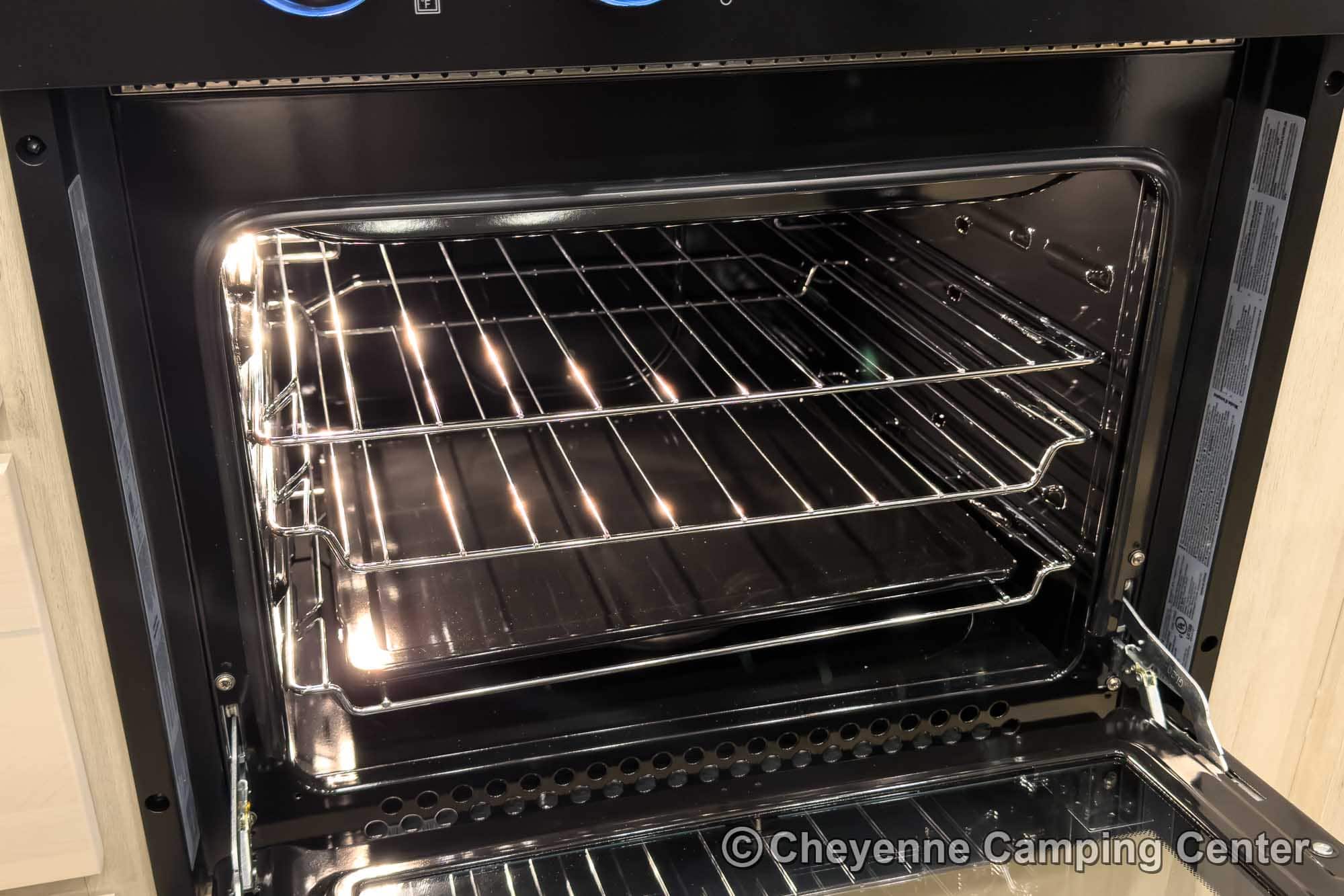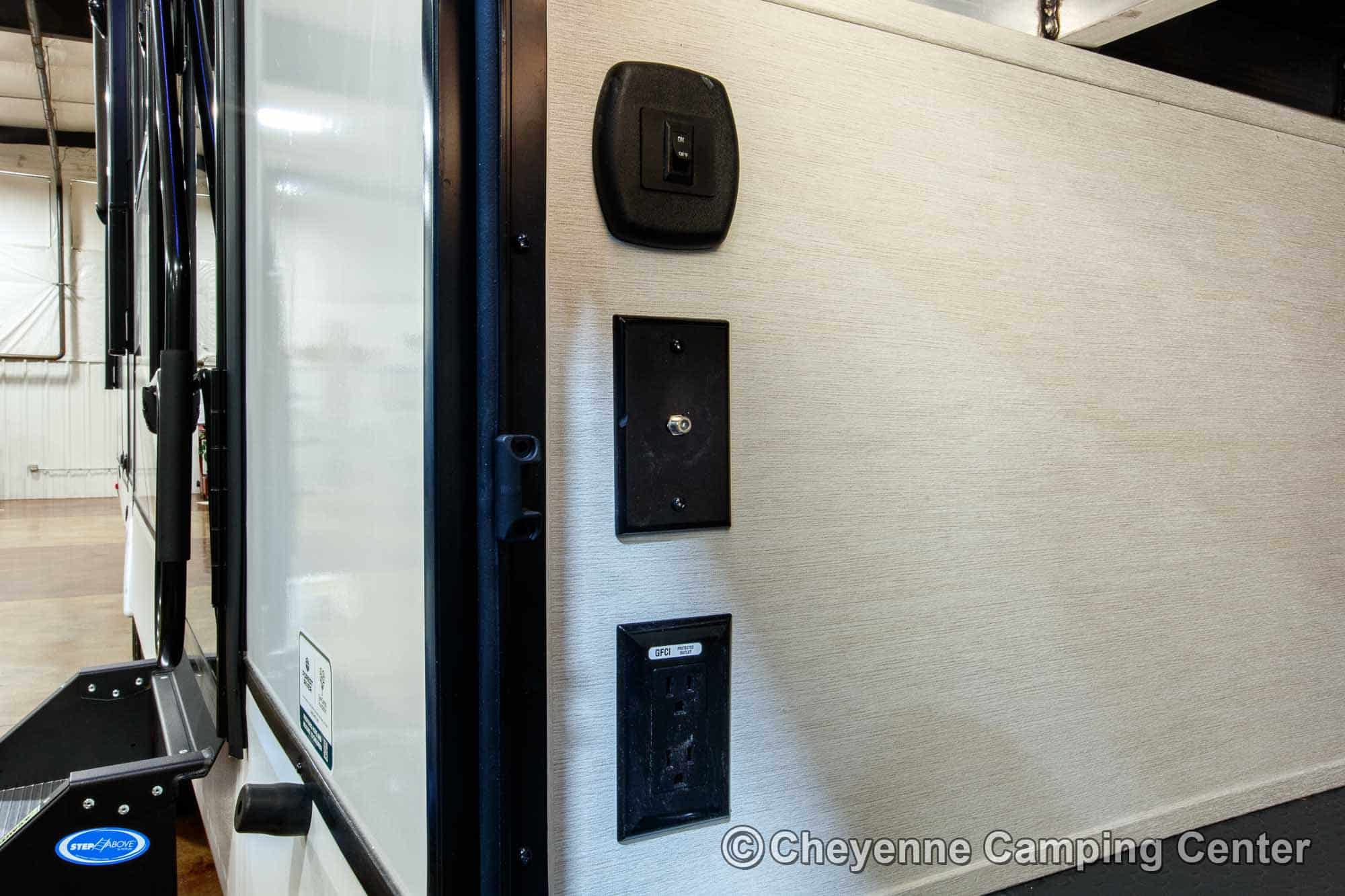 Premium Exterior Features: Outside, you’ll enjoy two power awnings with LED lighting, an outdoor kitchen with a refrigerator, griddle, water fixture, and storage, and a 200-watt solar panel for off-grid flexibility. Automatic leveling makes setup simple, while the towing package and large storage compartments add convenience for every adventure.