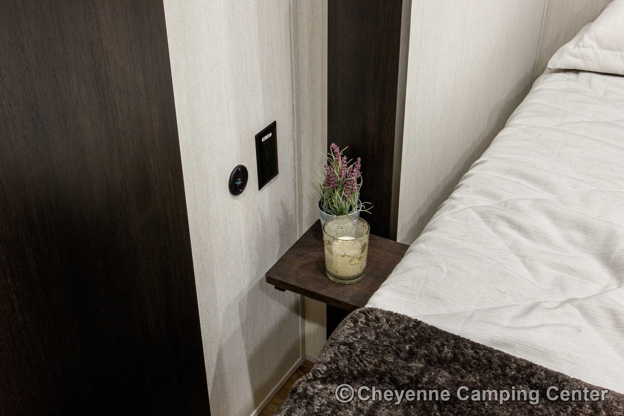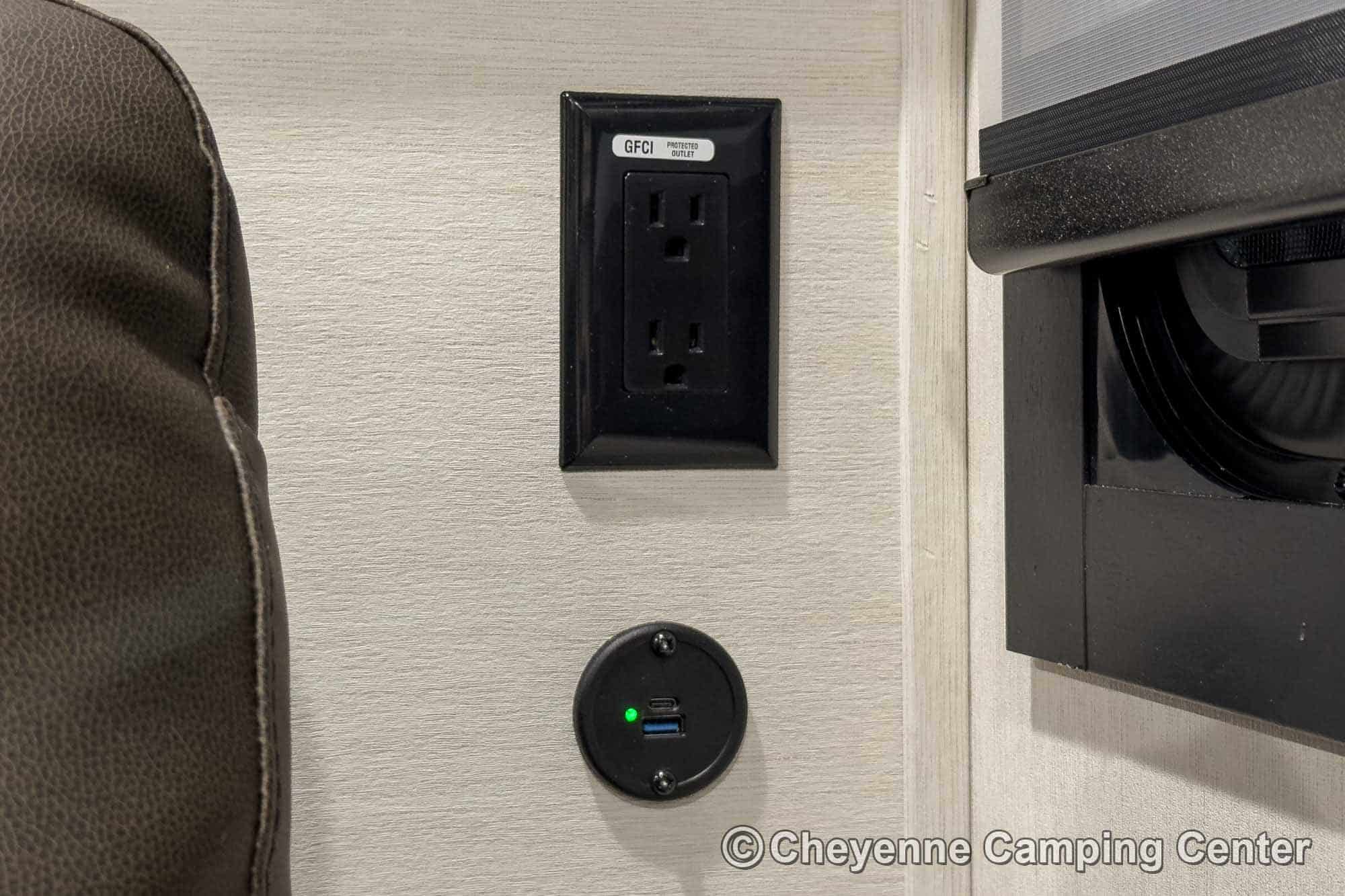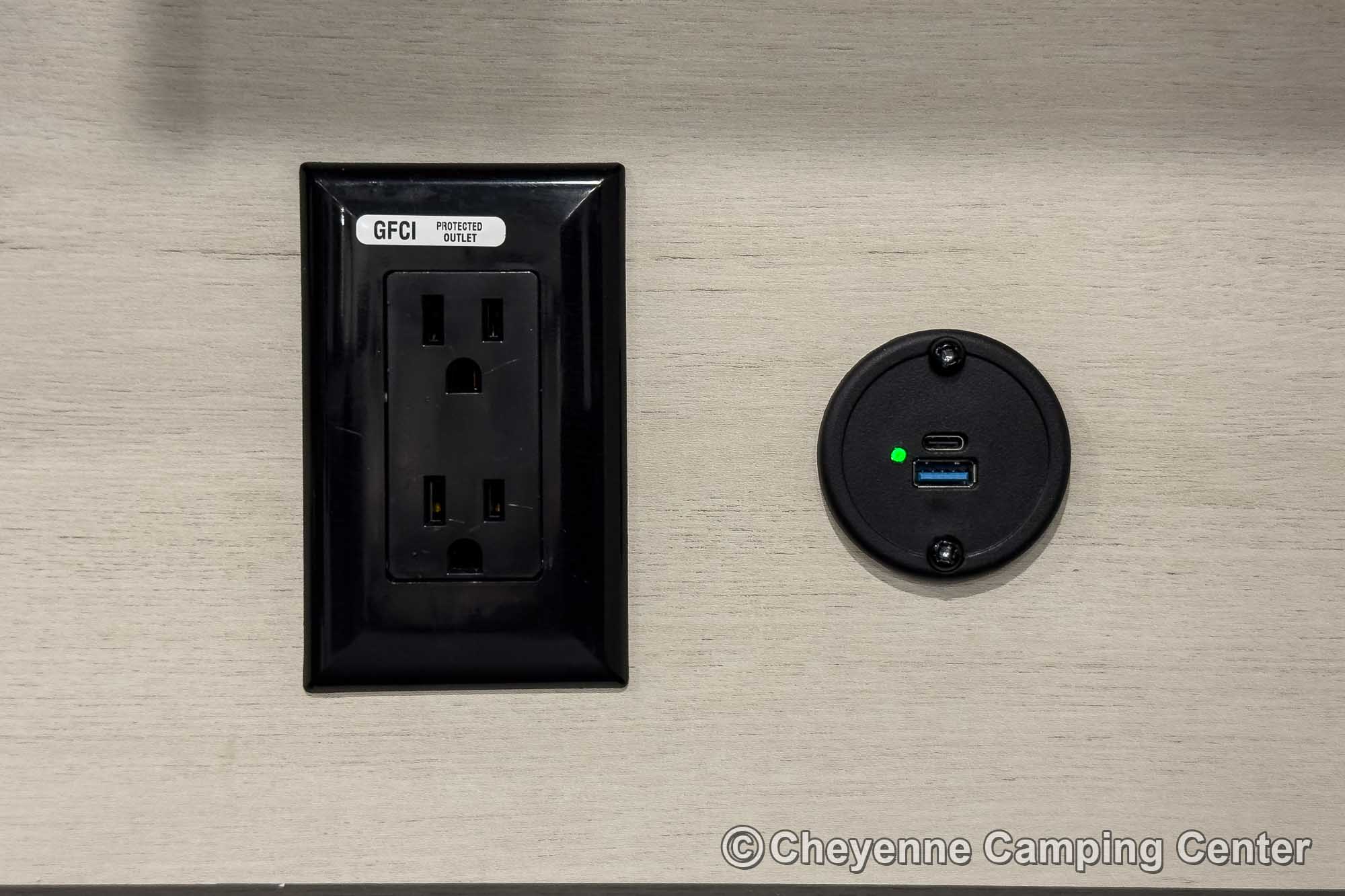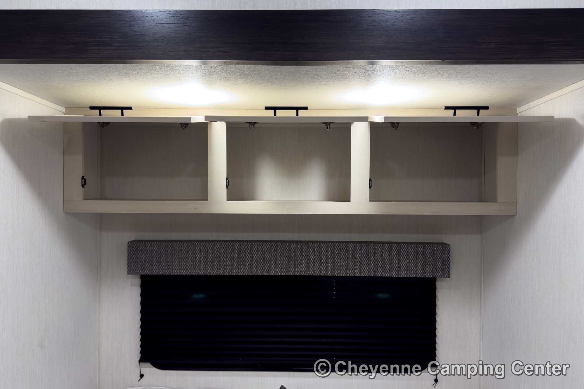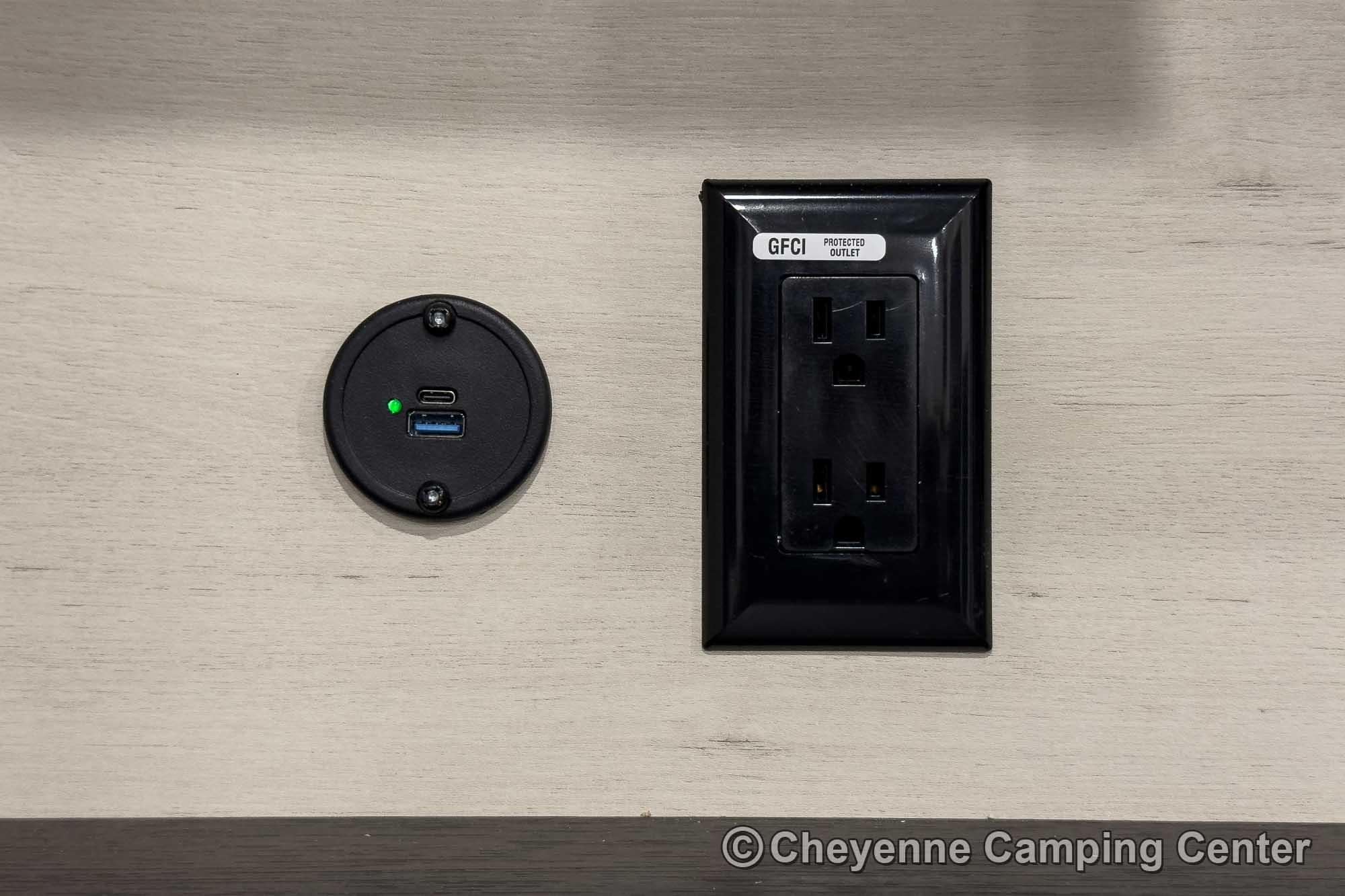Premium Exterior Features: Outside, you’ll enjoy two power awnings with LED lighting, an outdoor kitchen with a refrigerator, griddle, water fixture, and storage, and a 200-watt solar panel for off-grid flexibility. Automatic leveling makes setup simple, while the towing package and large storage compartments add convenience for every adventure.