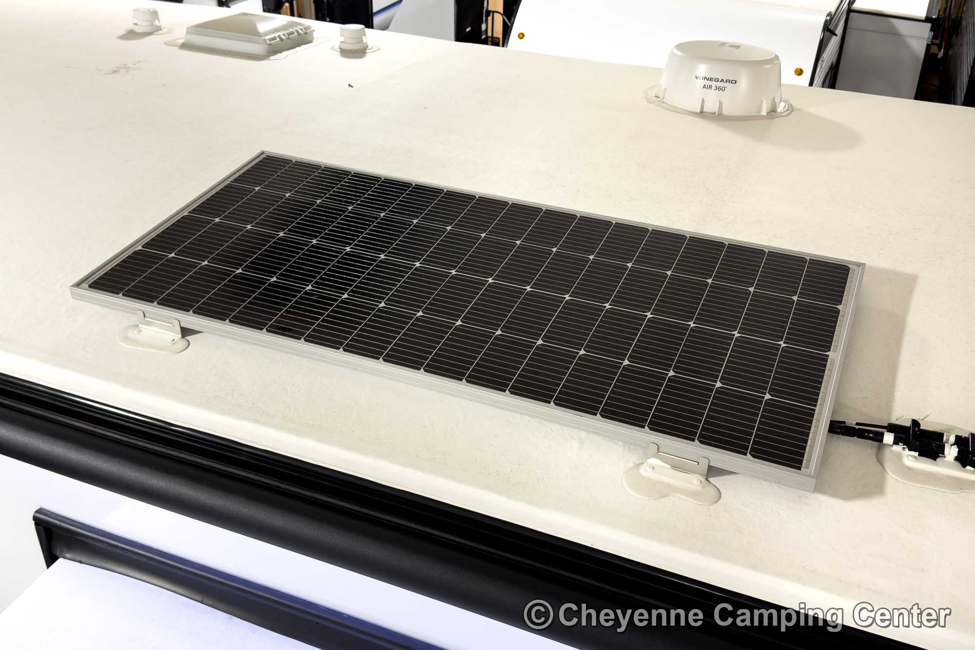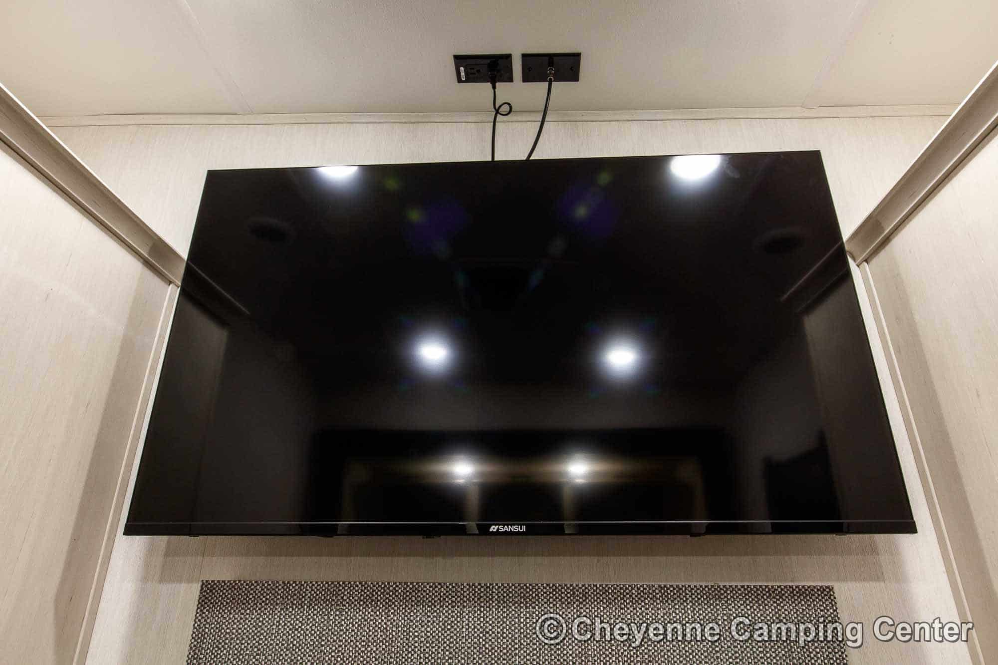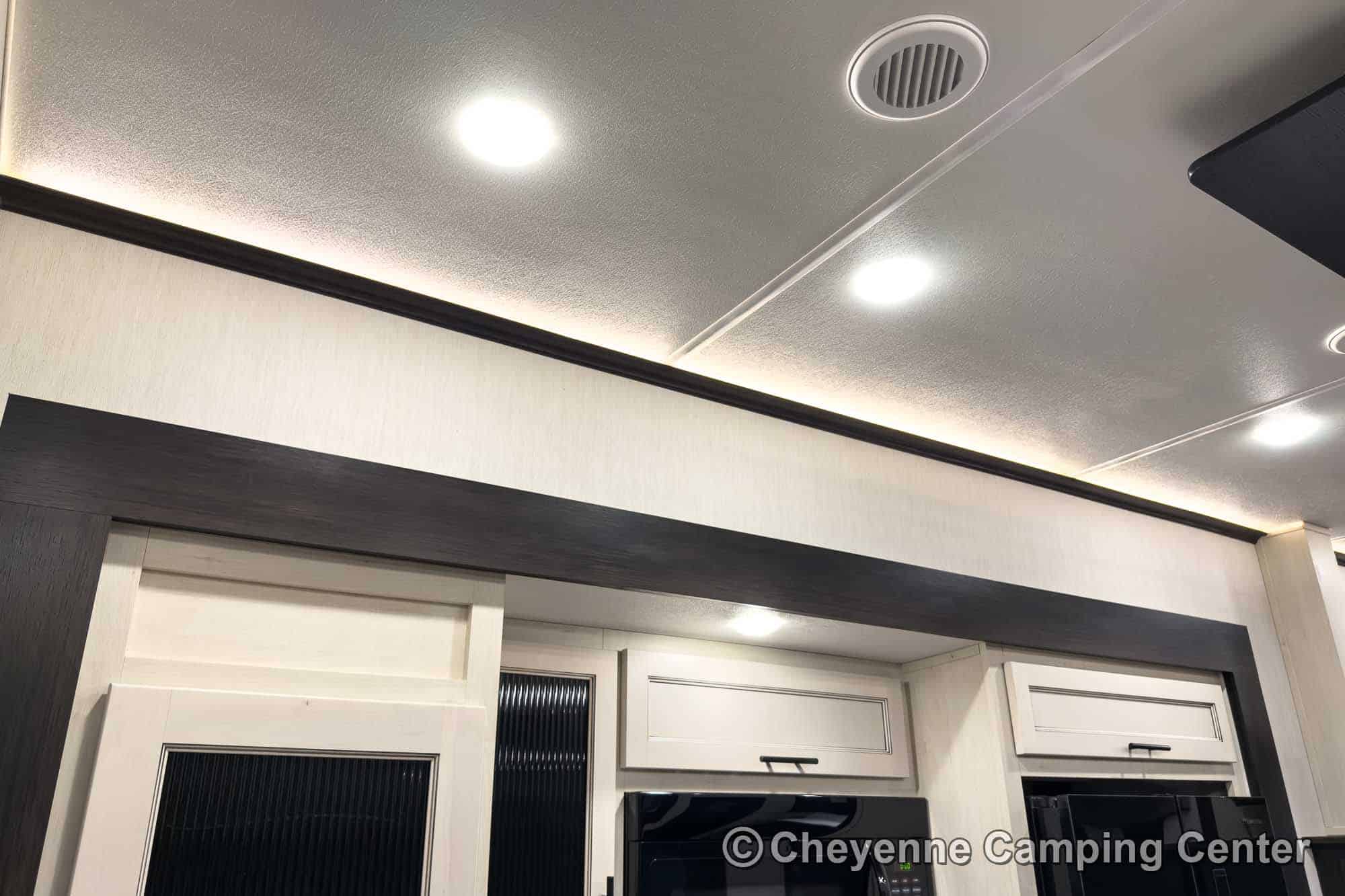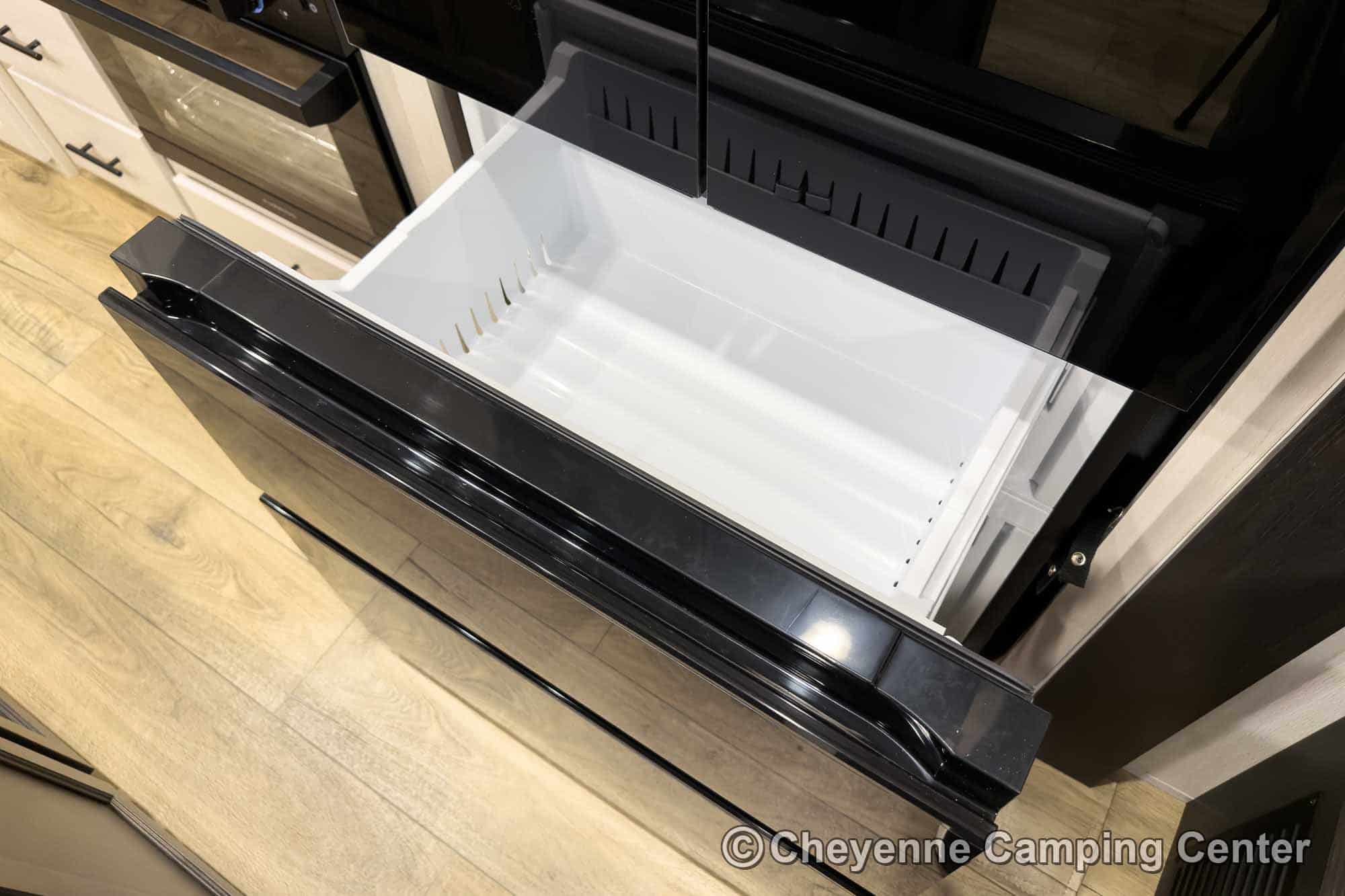Premium Exterior Features: Outside, you’ll enjoy two power awnings with LED lighting, an outdoor kitchen with a refrigerator, griddle, water fixture, and storage, and a 200-watt solar panel for off-grid flexibility. Automatic leveling makes setup simple, while the towing package and large storage compartments add convenience for every adventure.