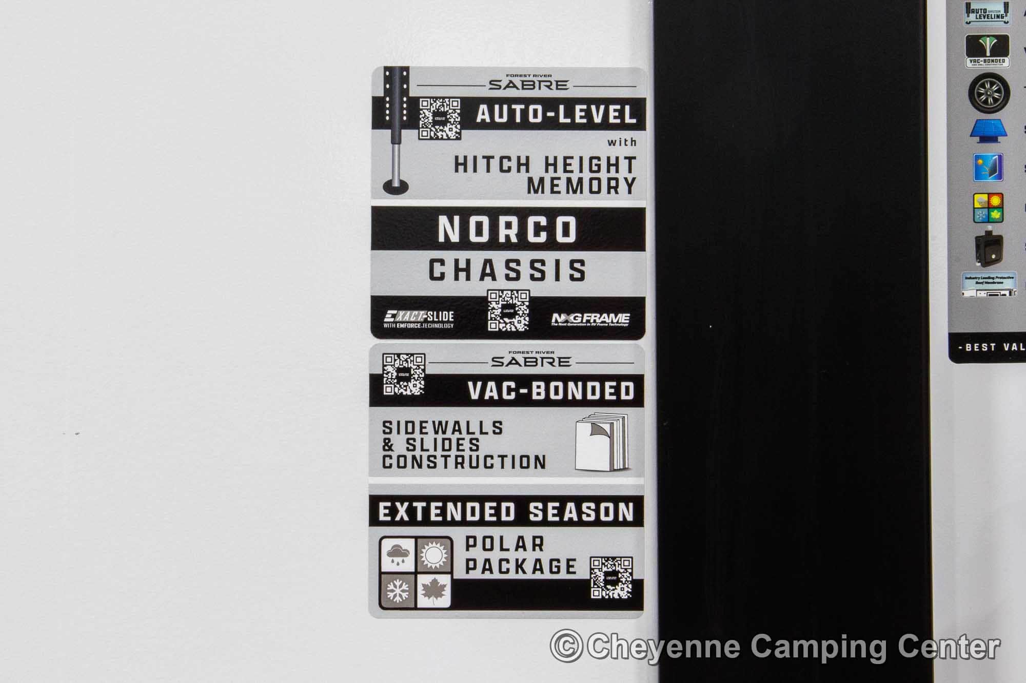 Quality Built for Strength & Comfort: The Sabre 37FLH is constructed with a Huck-bolted frame that’s stronger and more durable than a traditional welded frame for a rock-solid foundation. The 2” vacuum-bonded laminated side walls and slide-outs, 5/8″ tongue-and-groove plywood flooring, and no in-floor ducting provide better insulation, increased durability, and easier cleaning. The Extended Season Polar Package and solar-reflective windows ensure comfort in hot or cold weather.