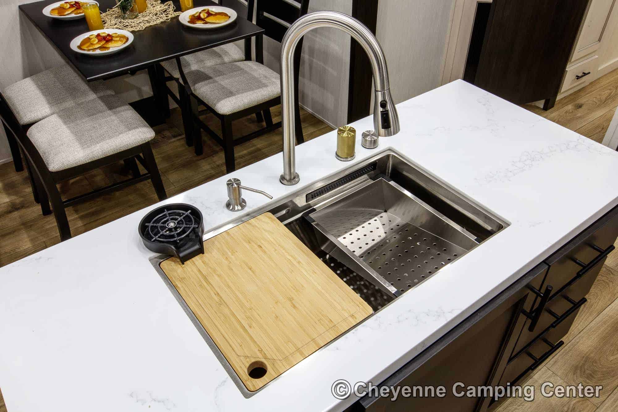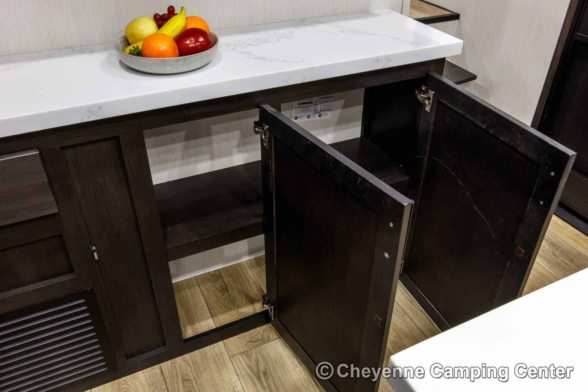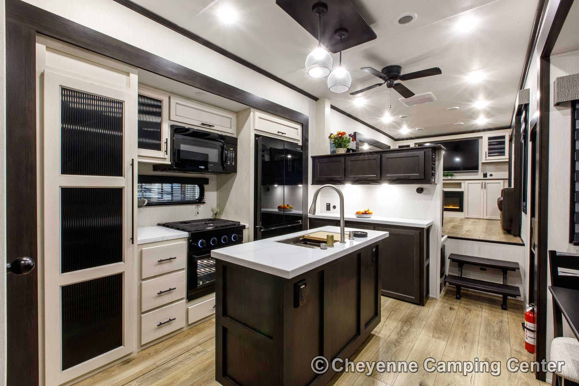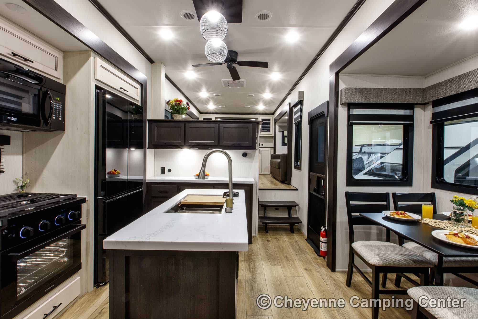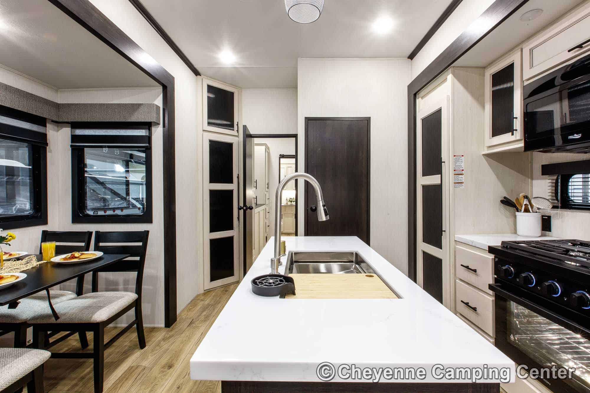 Chef-Inspired Kitchen: The heart of this fifth wheel is its island kitchen, featuring a workstation sink, solid-surface countertops, a 30″ microwave/convection oven, a residential-style gas range and oven, and a large residential-style refrigerator. A dedicated cabinet for the garbage can, a spacious pantry, and numerous drawers and cabinets offer ample storage. The free-standing dining table rotates to convert into a convenient desk.