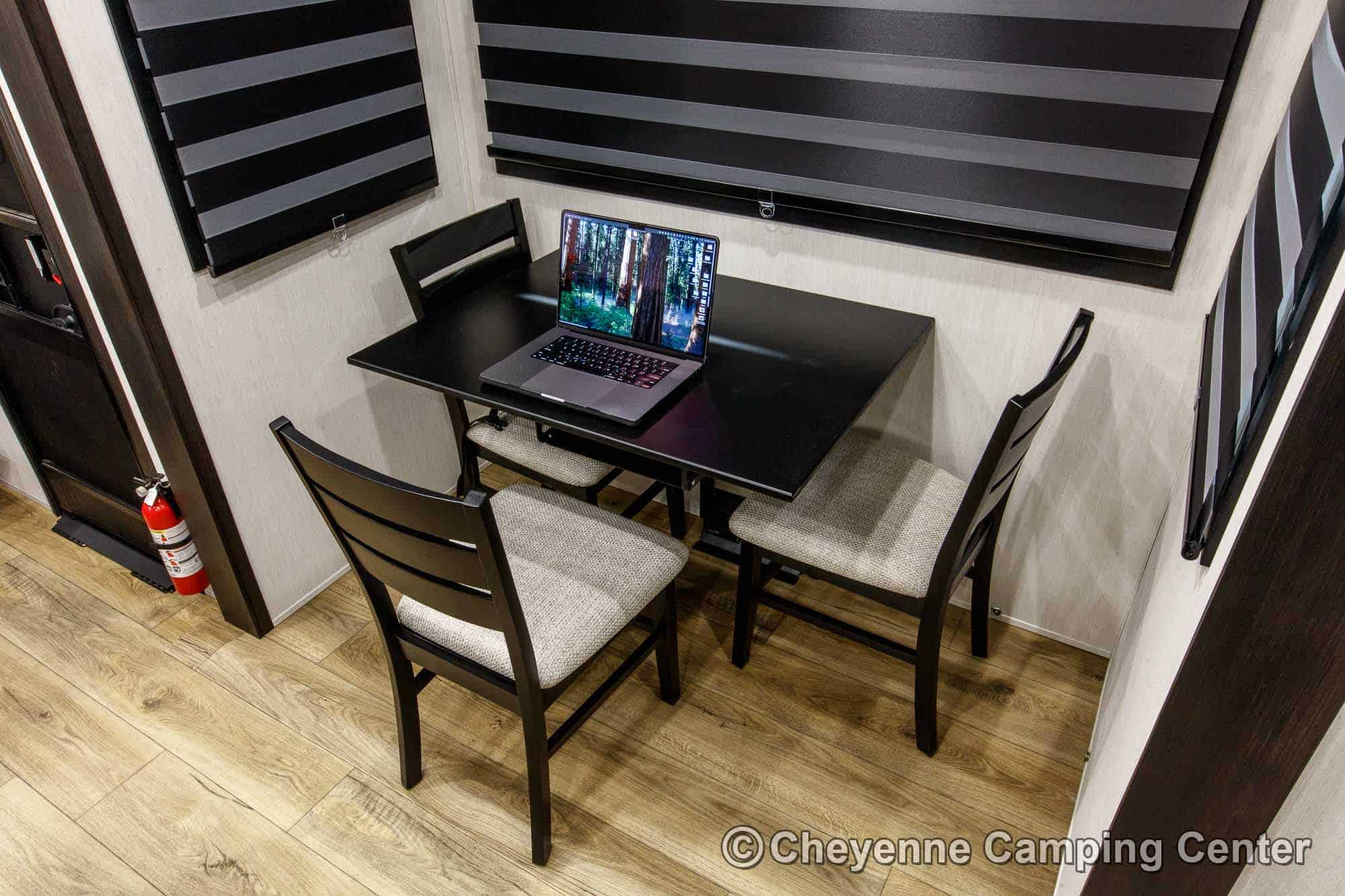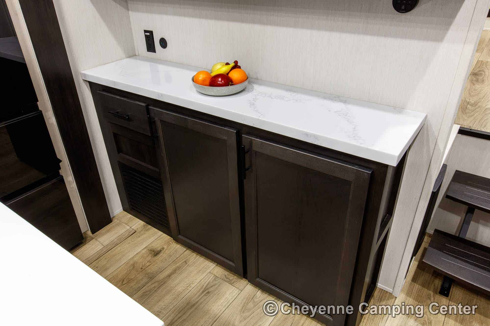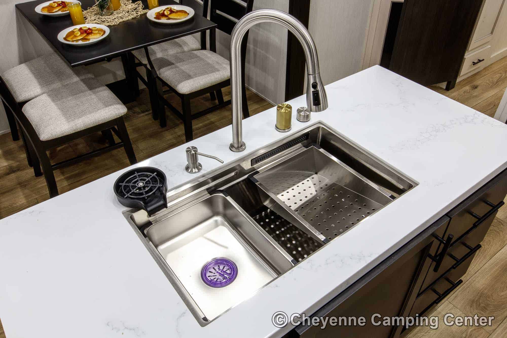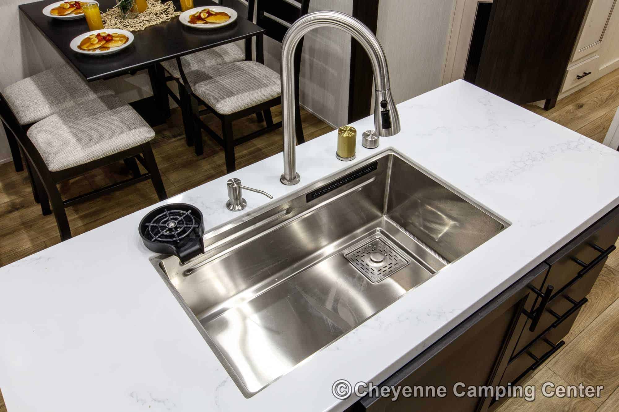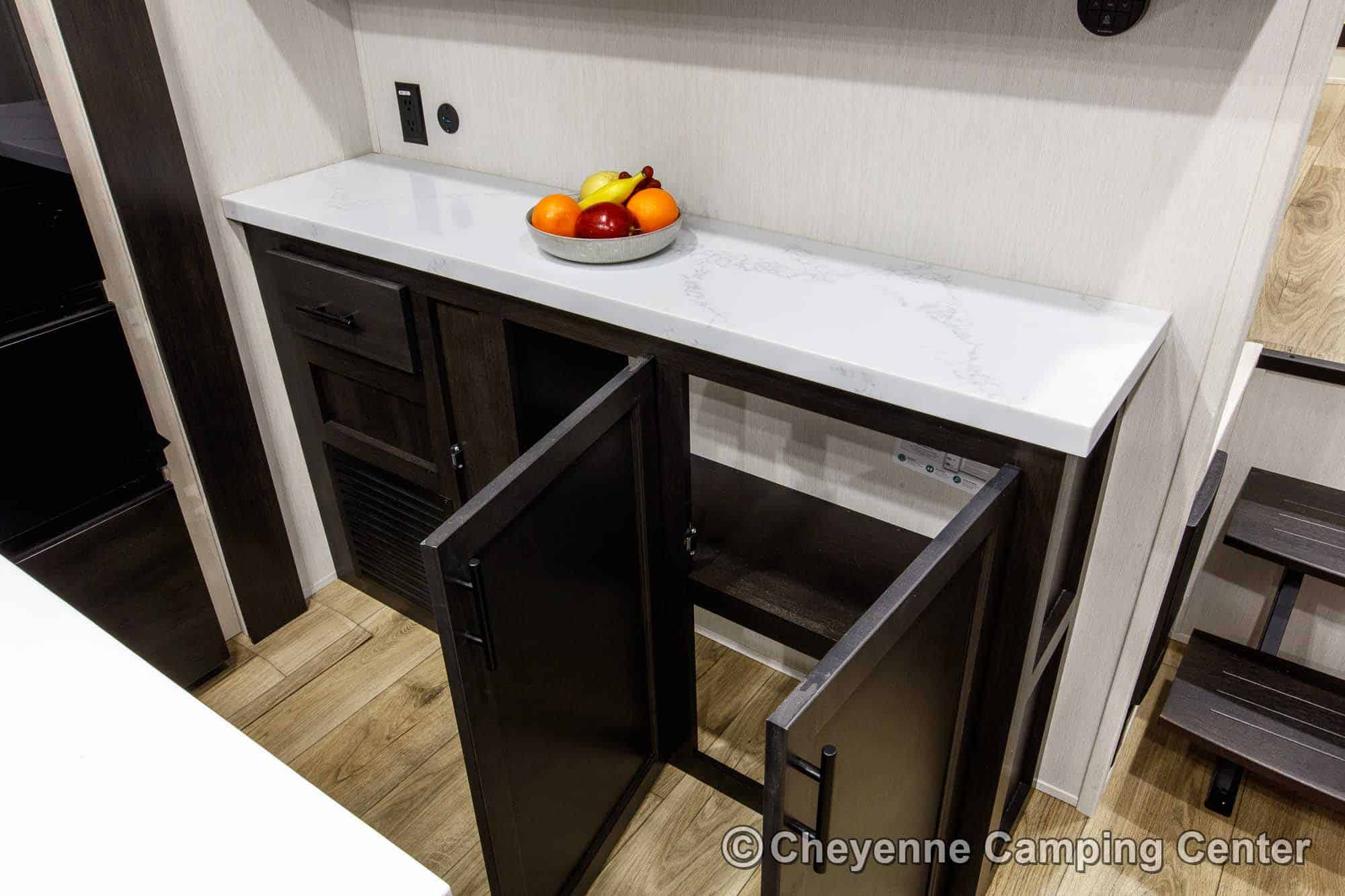 Chef-Inspired Kitchen: The heart of this fifth wheel is its island kitchen, featuring a workstation sink, solid-surface countertops, a 30″ microwave/convection oven, a residential-style gas range and oven, and a large residential-style refrigerator. A dedicated cabinet for the garbage can, a spacious pantry, and numerous drawers and cabinets offer ample storage. The free-standing dining table rotates to convert into a convenient desk.