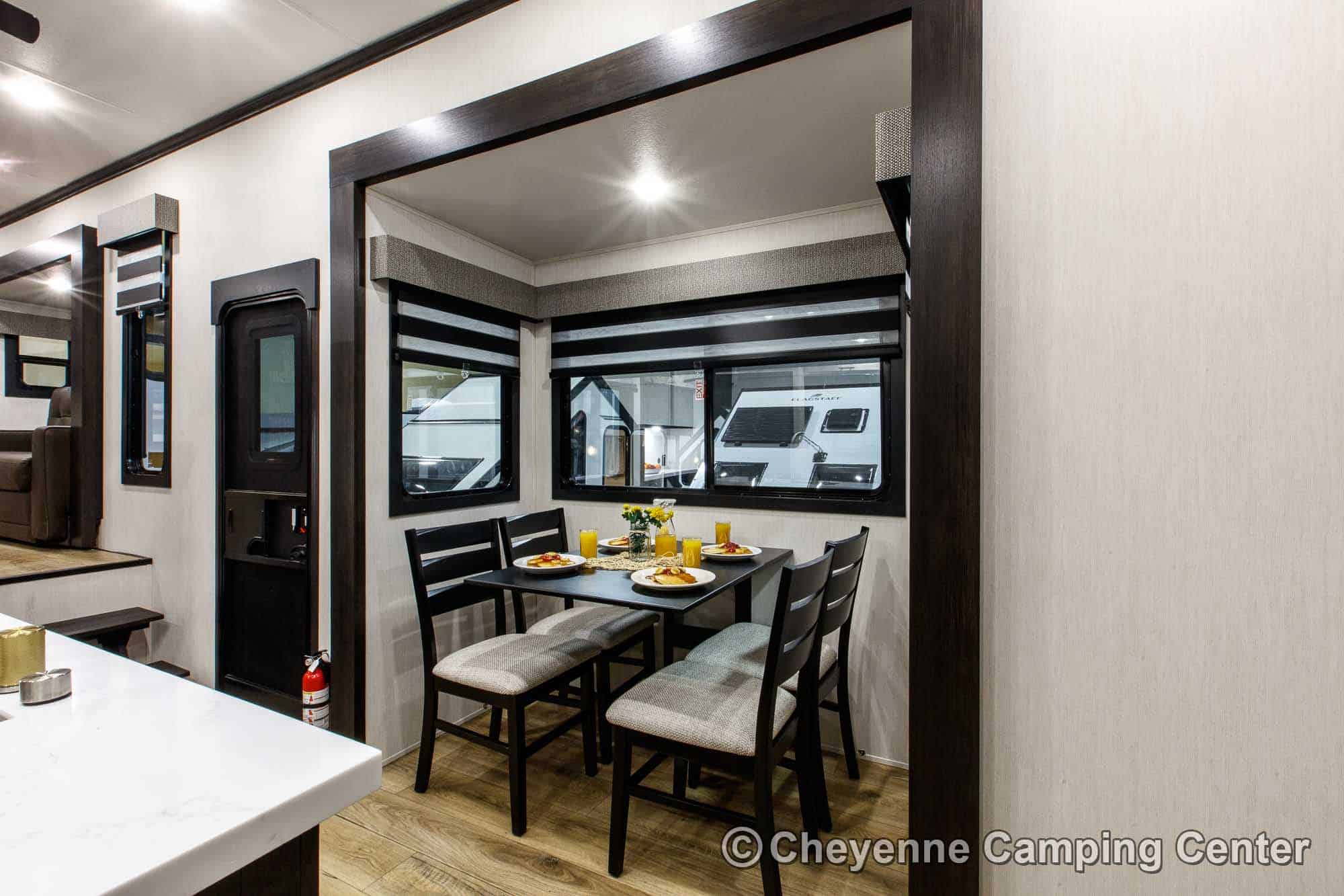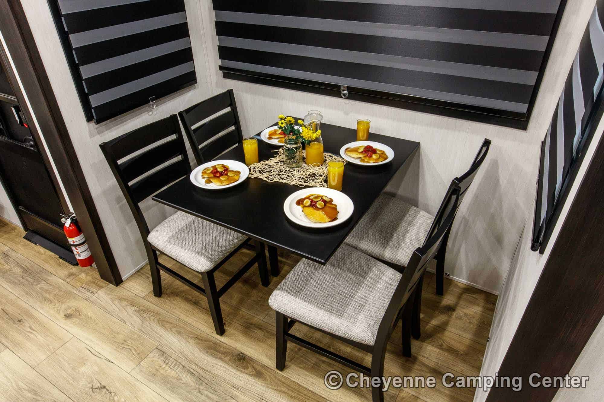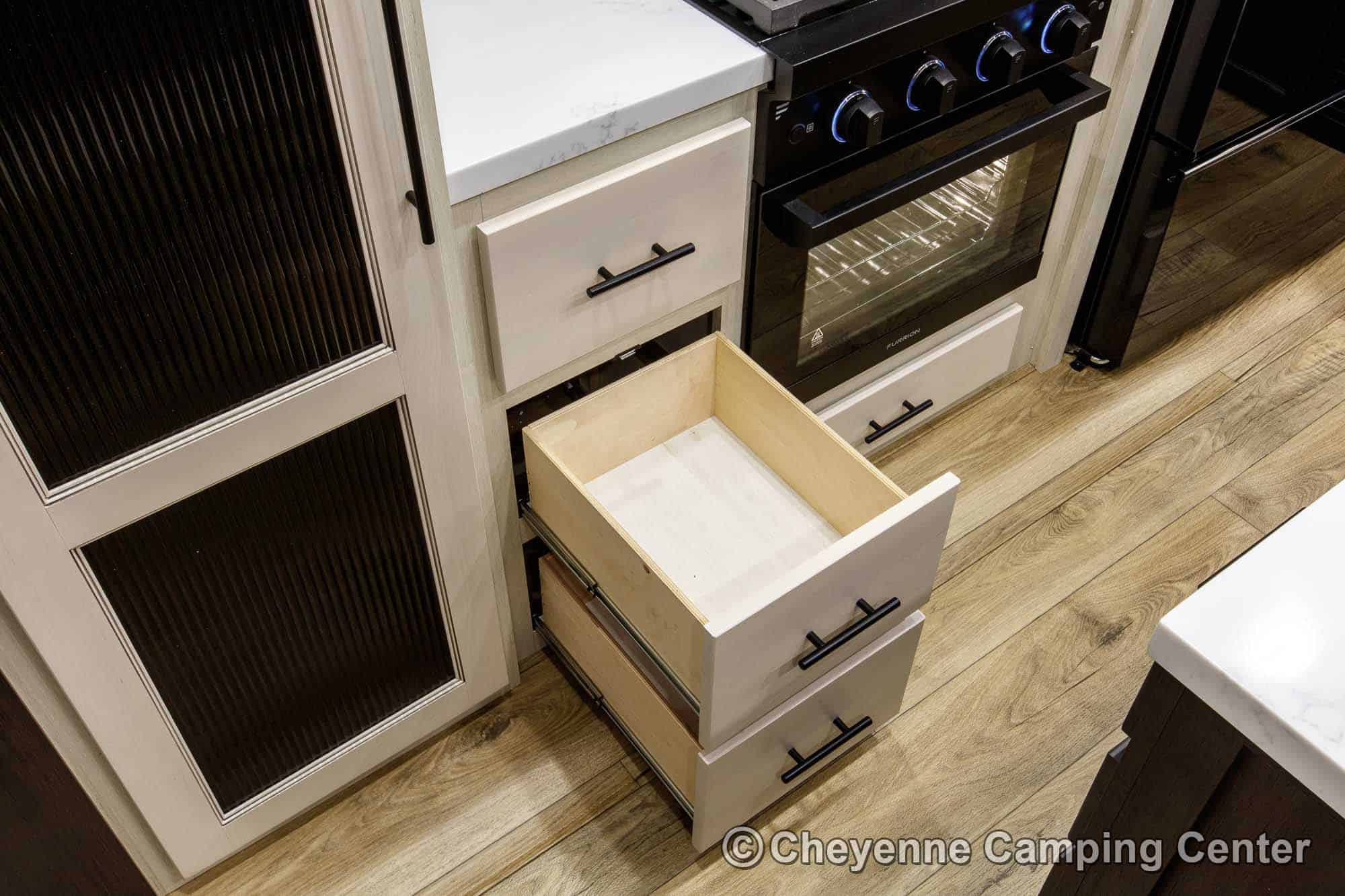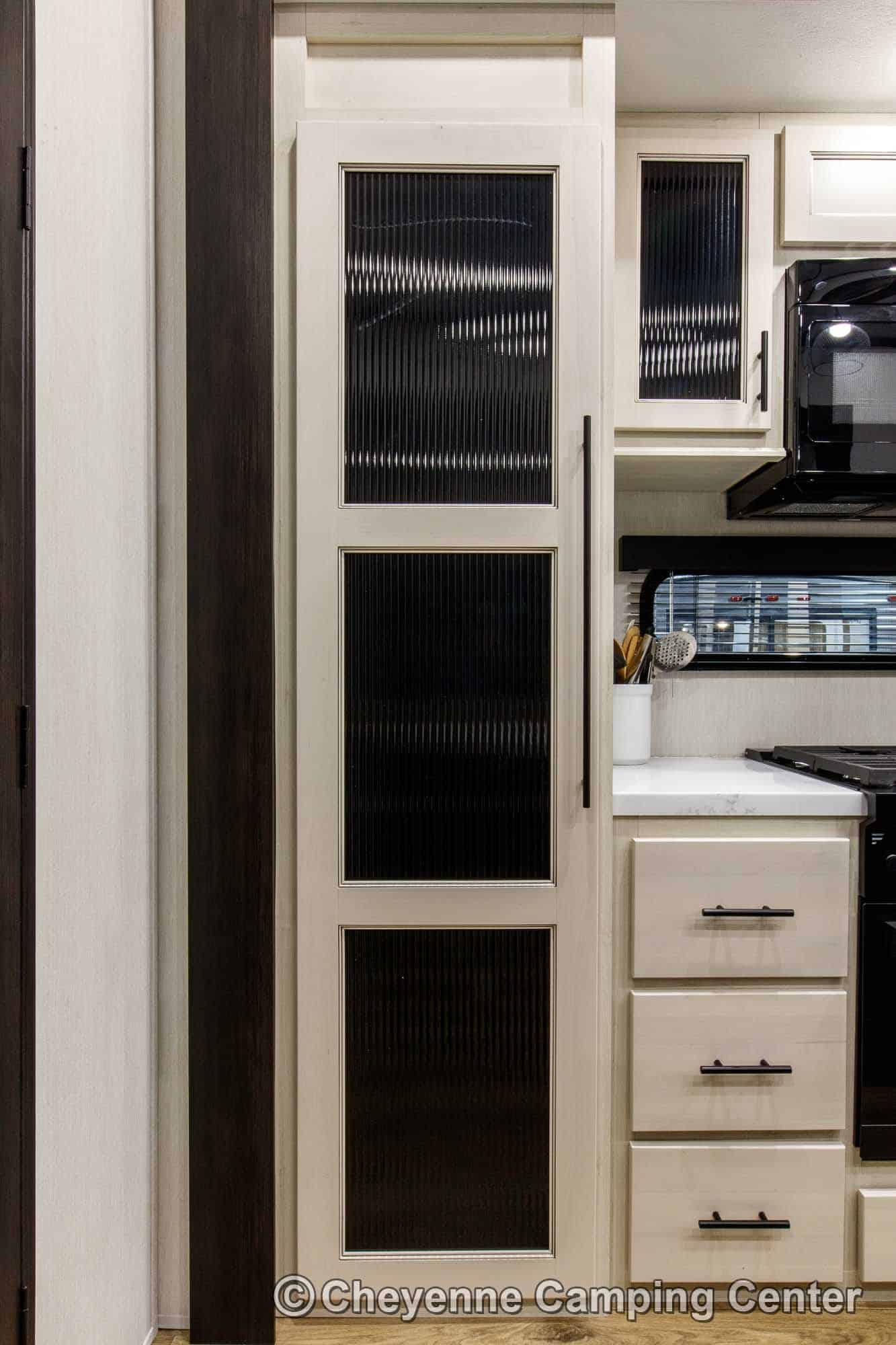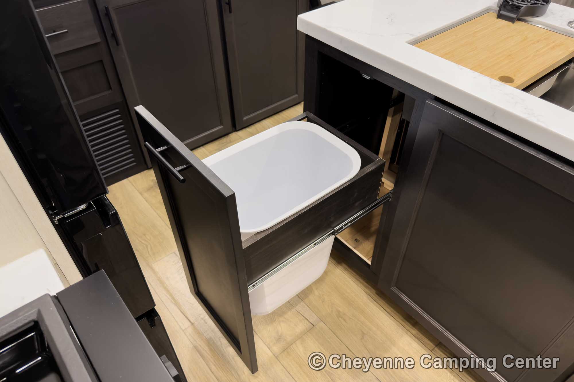 Chef-Inspired Kitchen: The heart of this fifth wheel is its island kitchen, featuring a workstation sink, solid-surface countertops, a 30″ microwave/convection oven, a residential-style gas range and oven, and a large residential-style refrigerator. A dedicated cabinet for the garbage can, a spacious pantry, and numerous drawers and cabinets offer ample storage. The free-standing dining table rotates to convert into a convenient desk.
