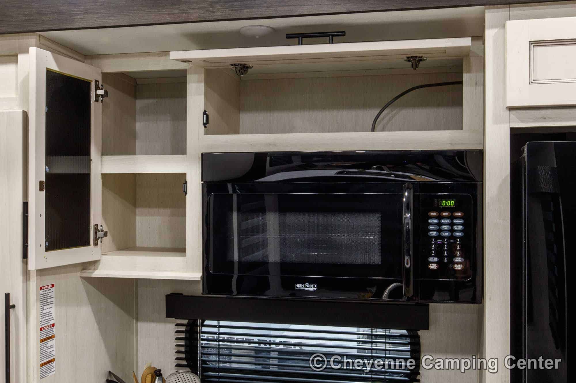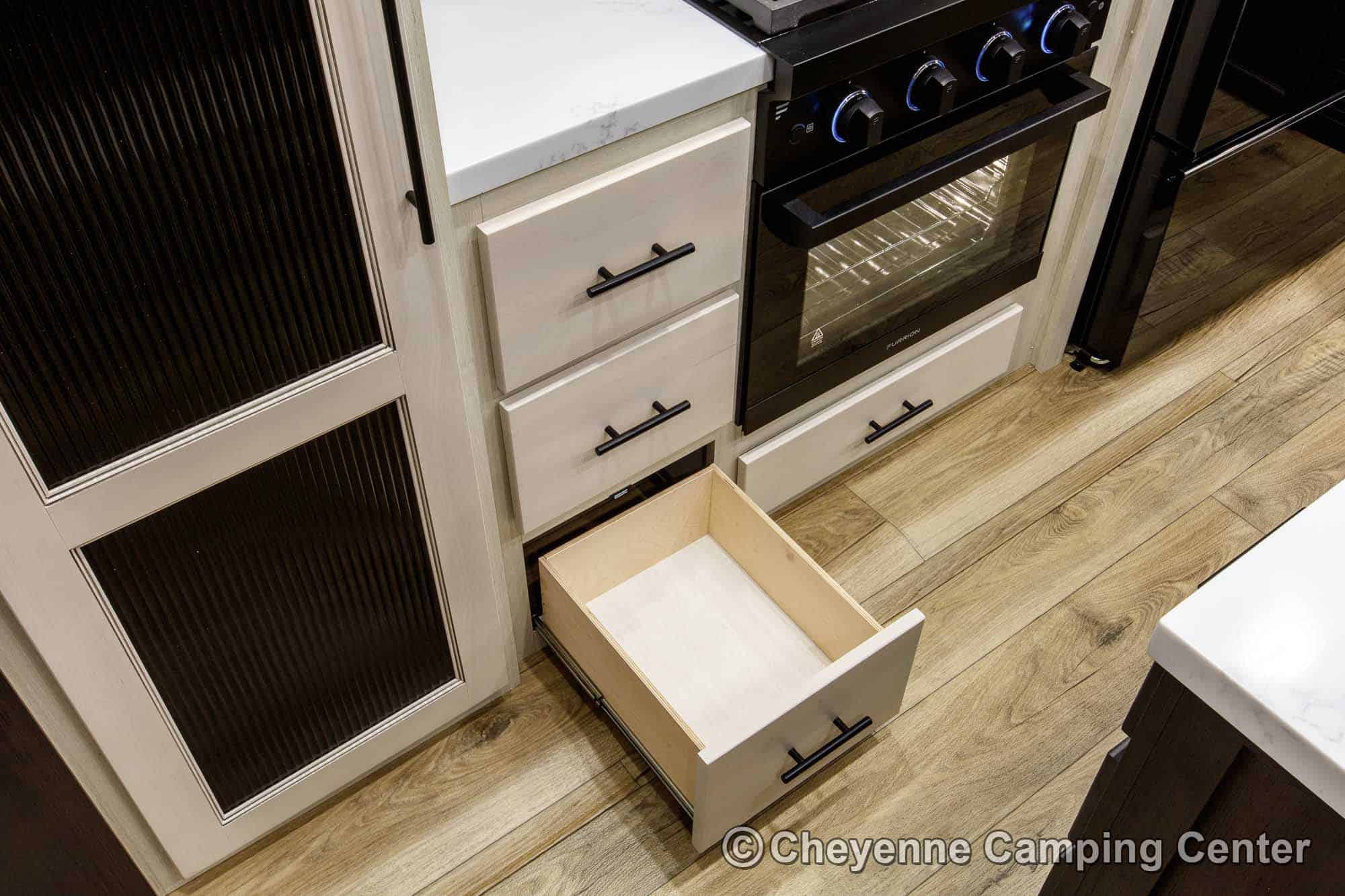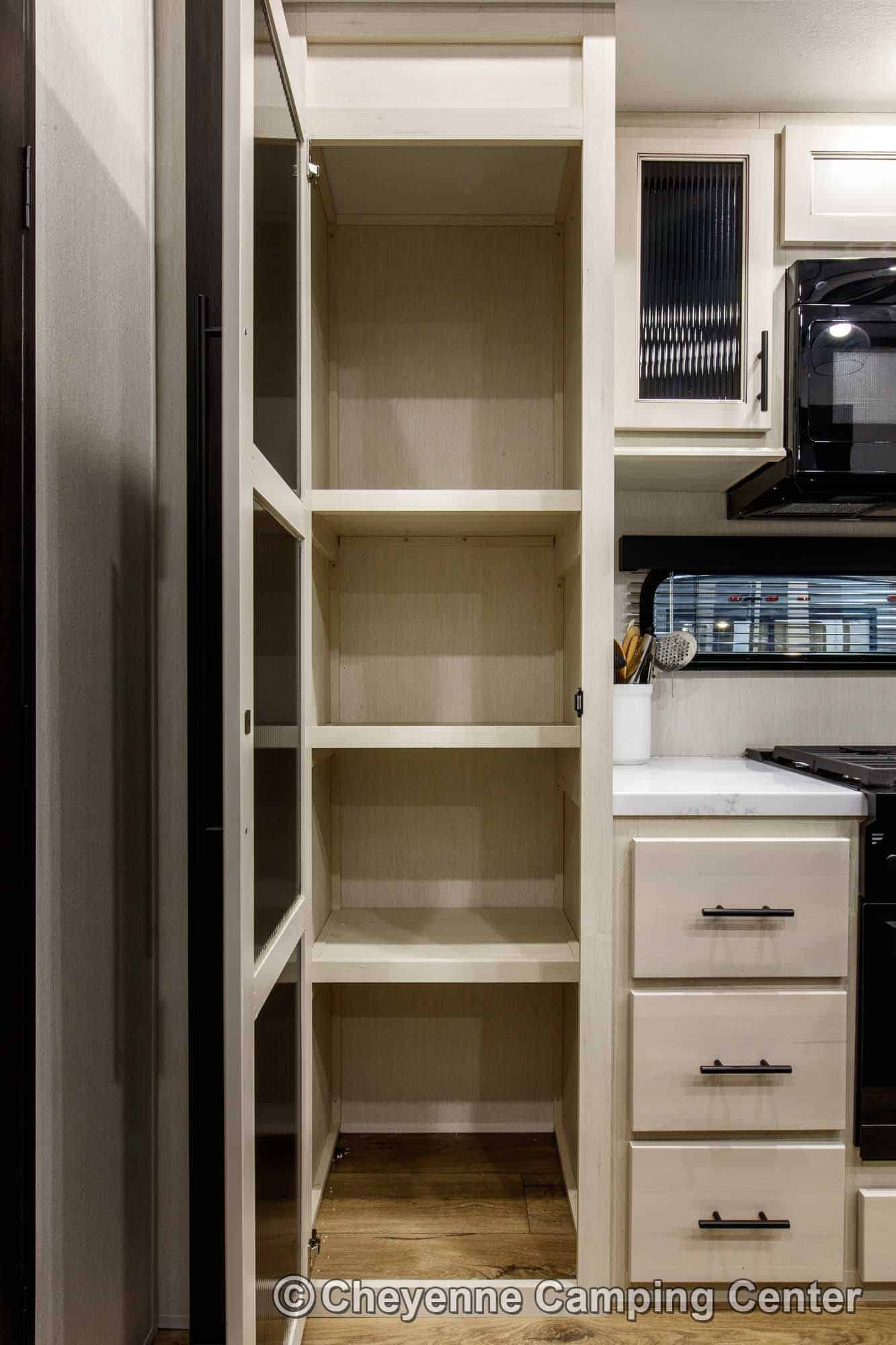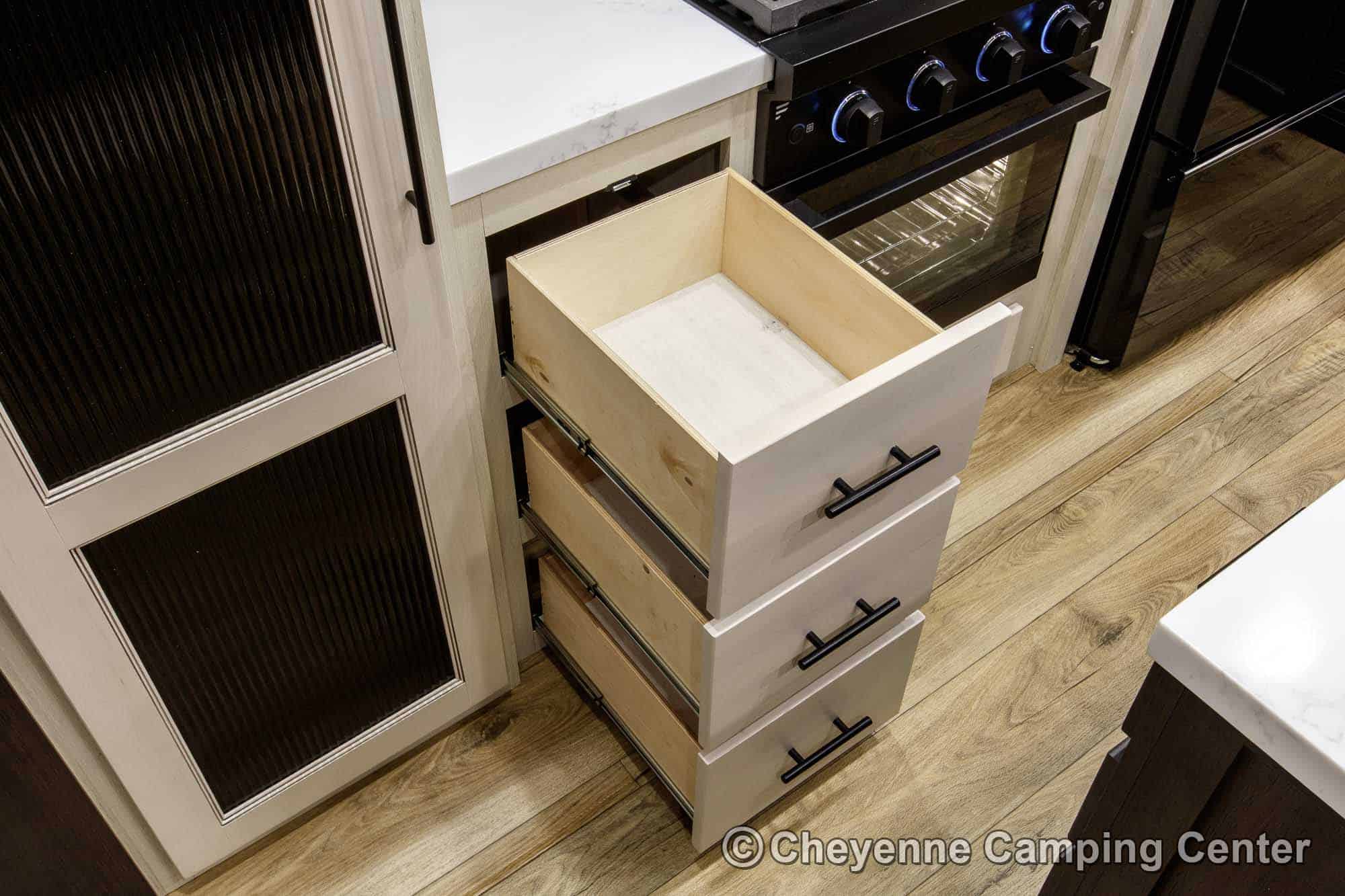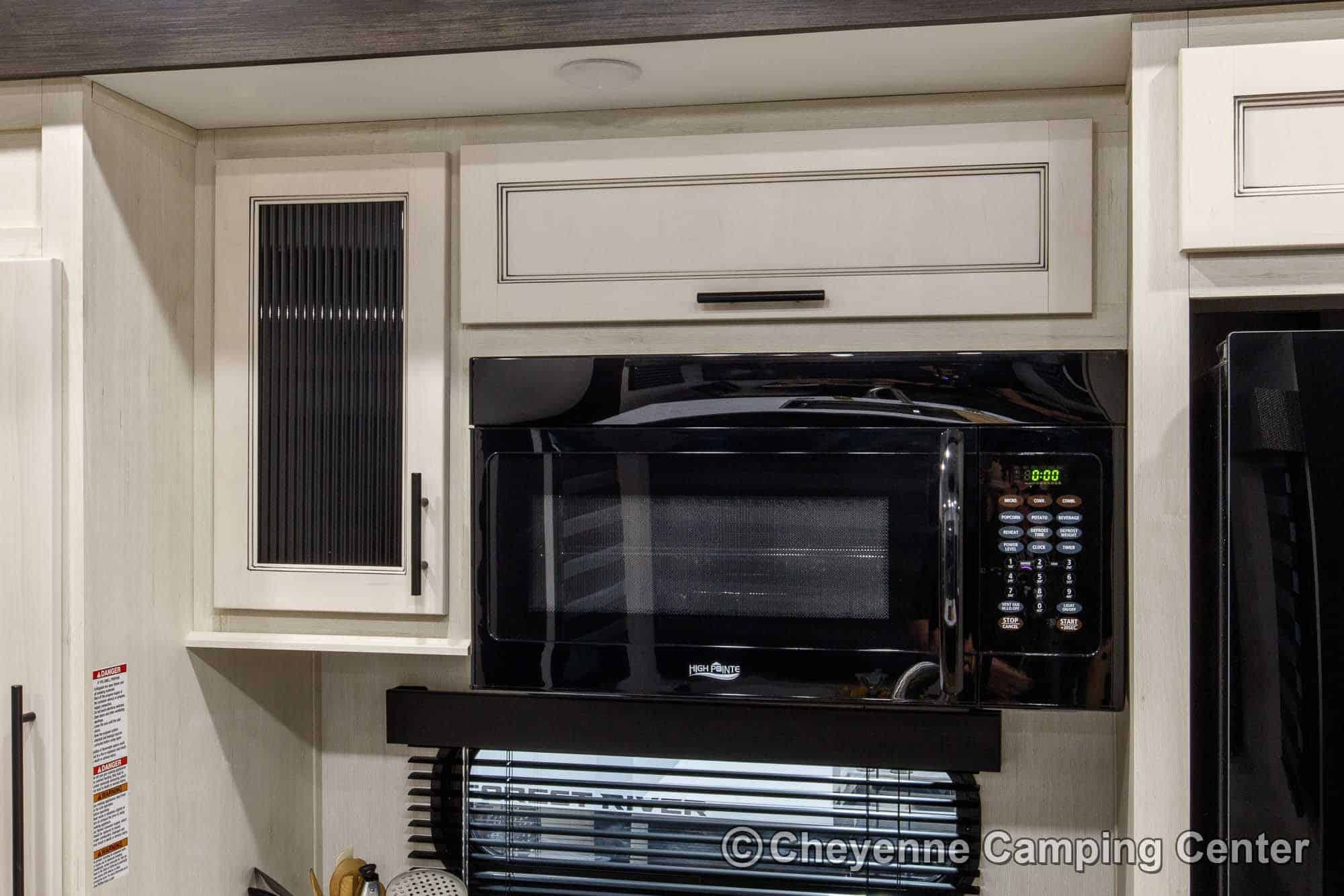 Chef-Inspired Kitchen: The heart of this fifth wheel is its island kitchen, featuring a workstation sink, solid-surface countertops, a 30″ microwave/convection oven, a residential-style gas range and oven, and a large residential-style refrigerator. A dedicated cabinet for the garbage can, a spacious pantry, and numerous drawers and cabinets offer ample storage. The free-standing dining table rotates to convert into a convenient desk.