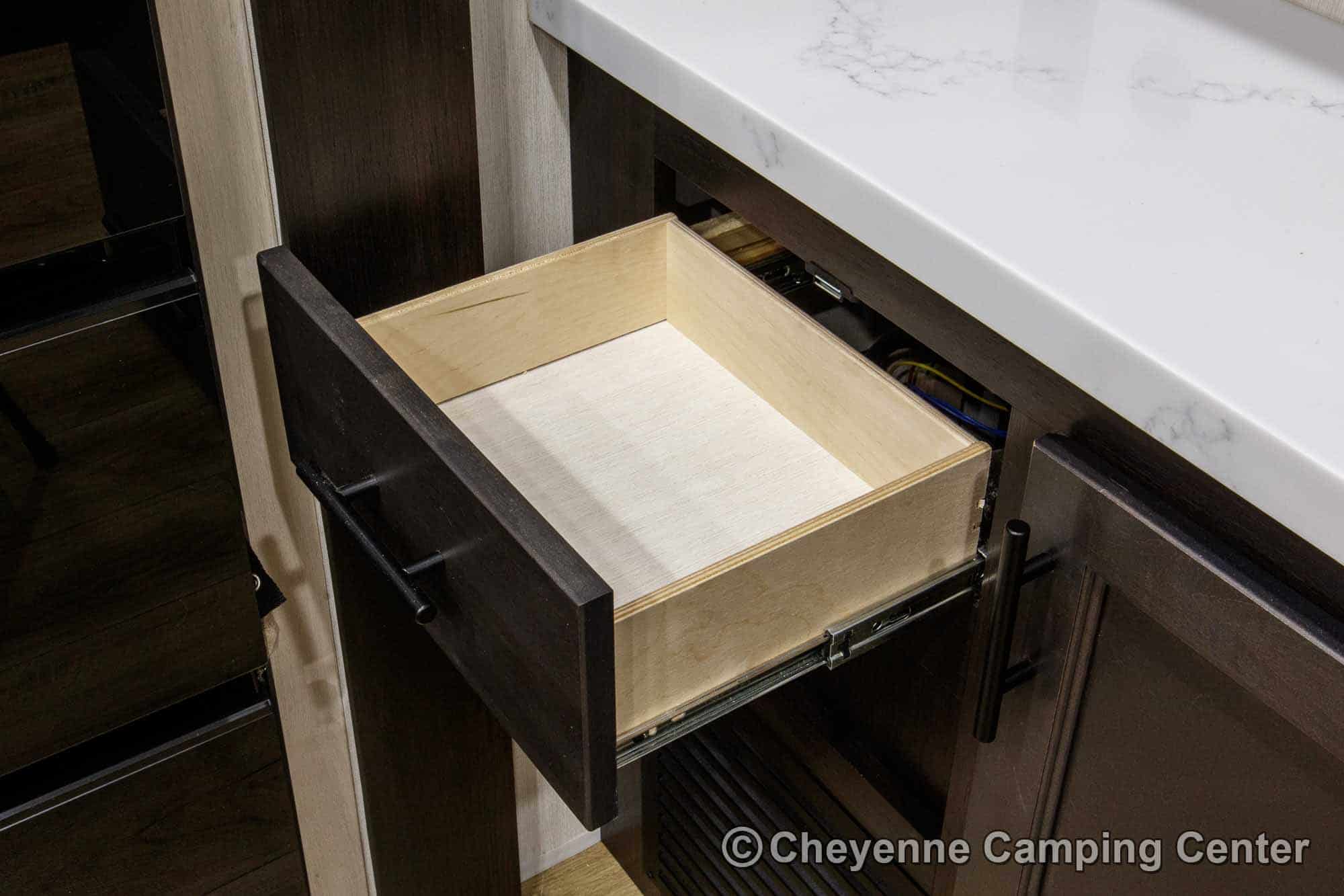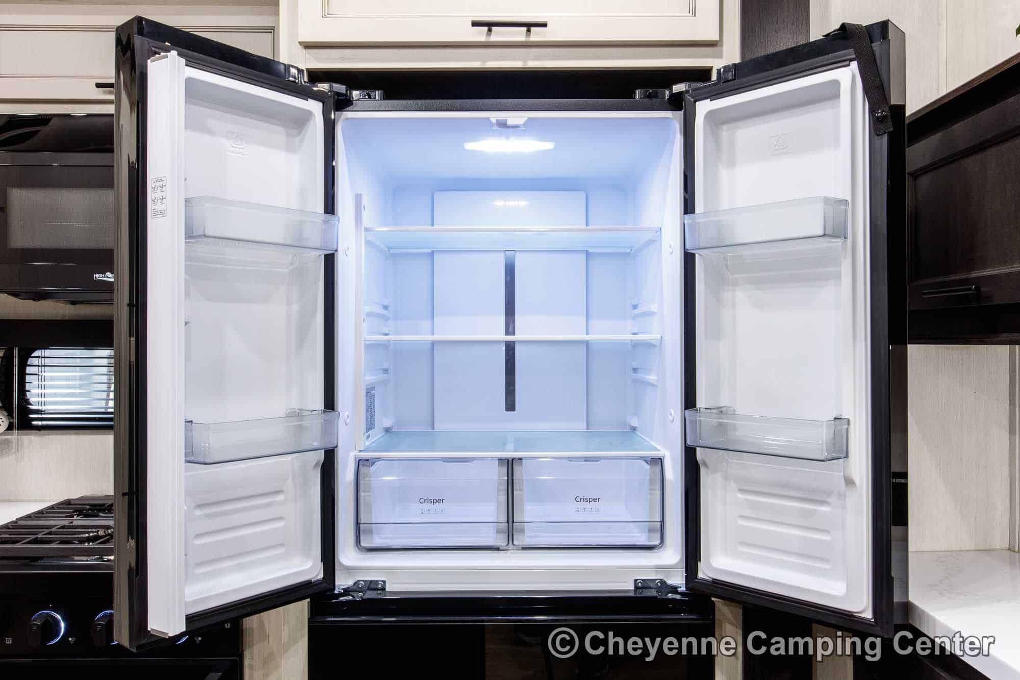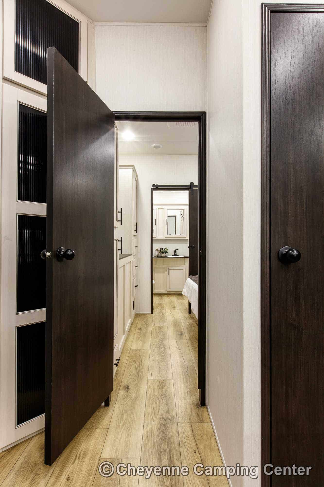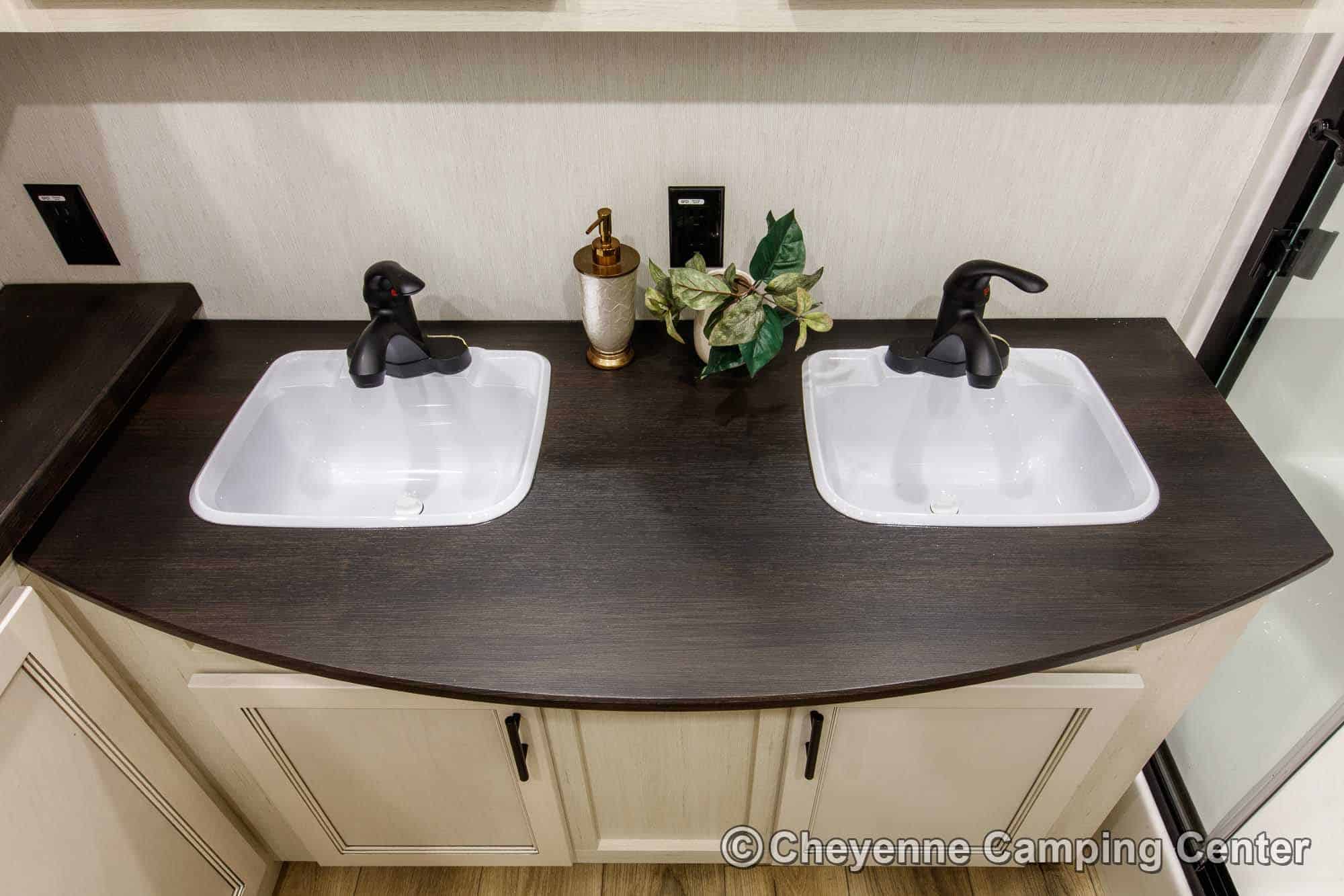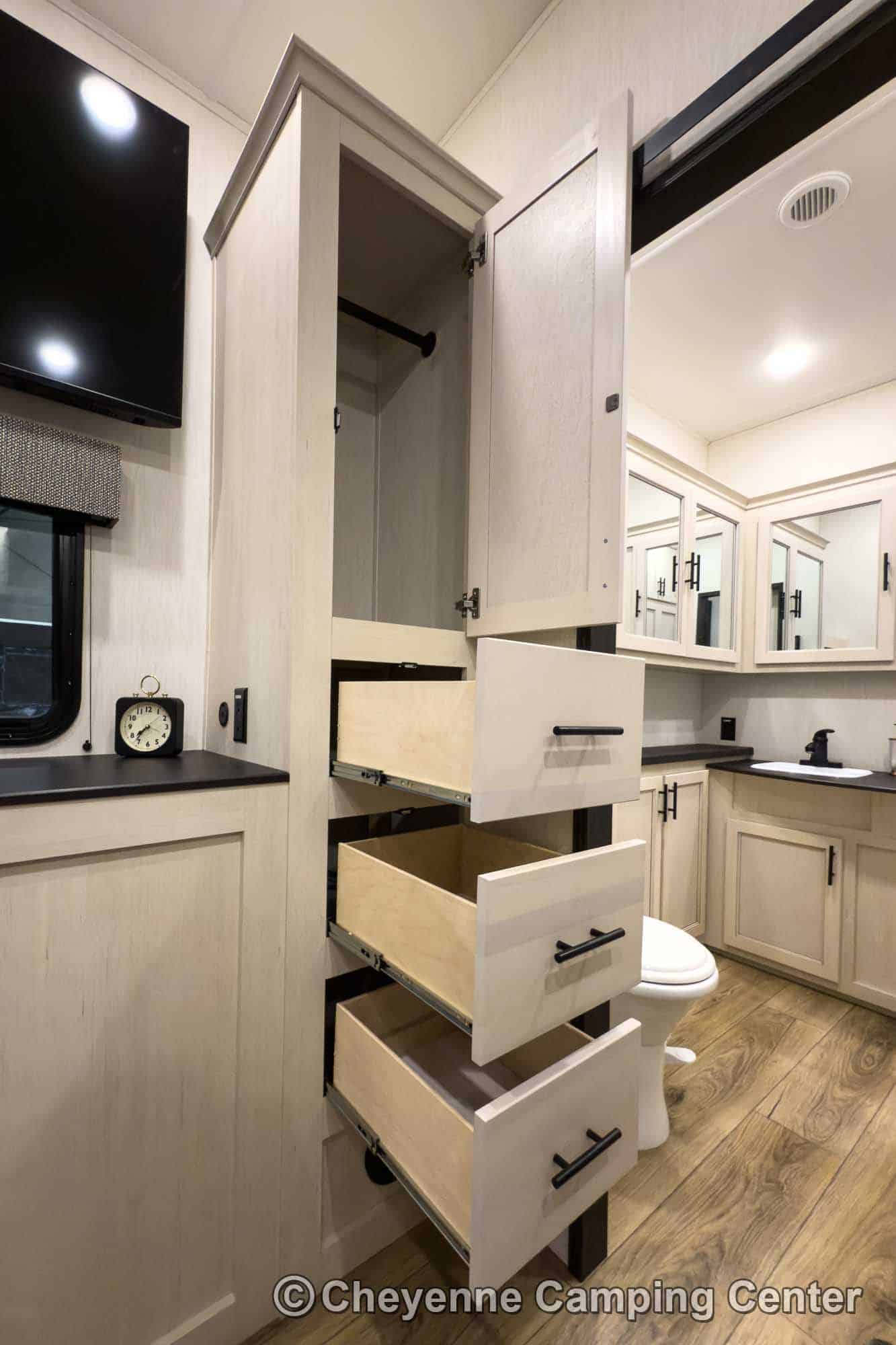 Chef-Inspired Kitchen: The heart of this fifth wheel is its island kitchen, featuring a workstation sink, solid-surface countertops, a 30″ microwave/convection oven, a residential-style gas range and oven, and a large residential-style refrigerator. A dedicated cabinet for the garbage can, a spacious pantry, and numerous drawers and cabinets offer ample storage. The free-standing dining table rotates to convert into a convenient desk.