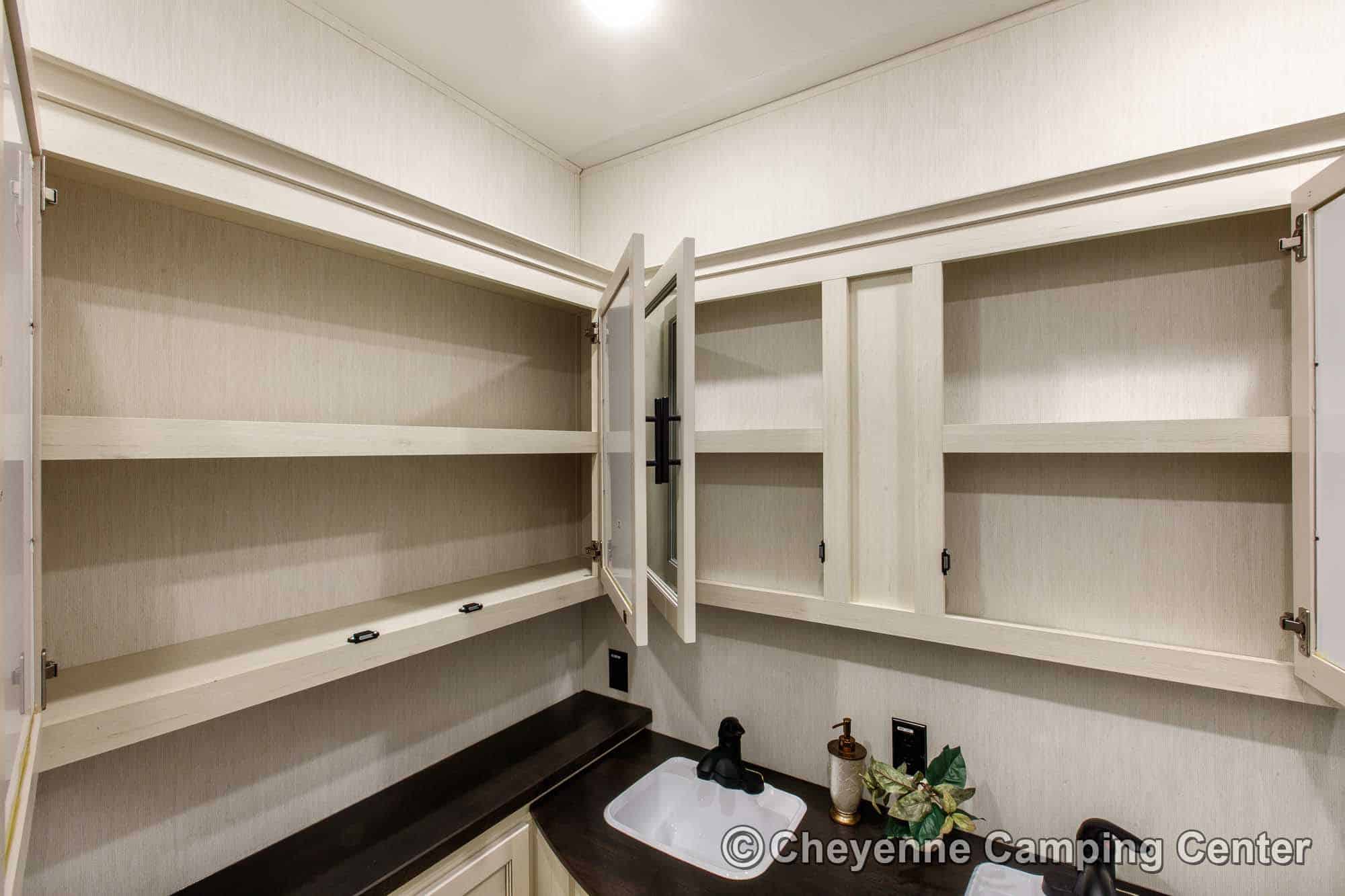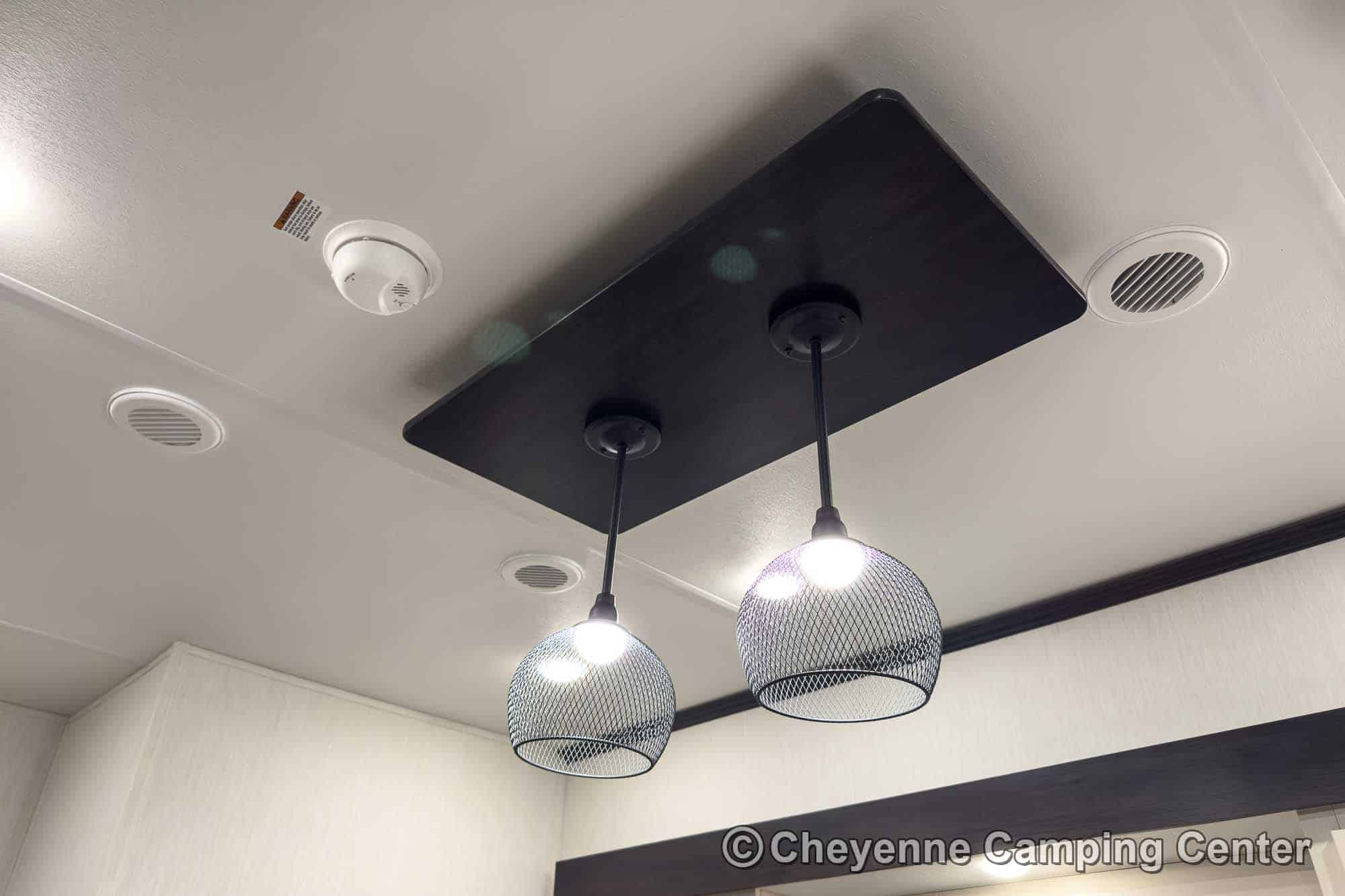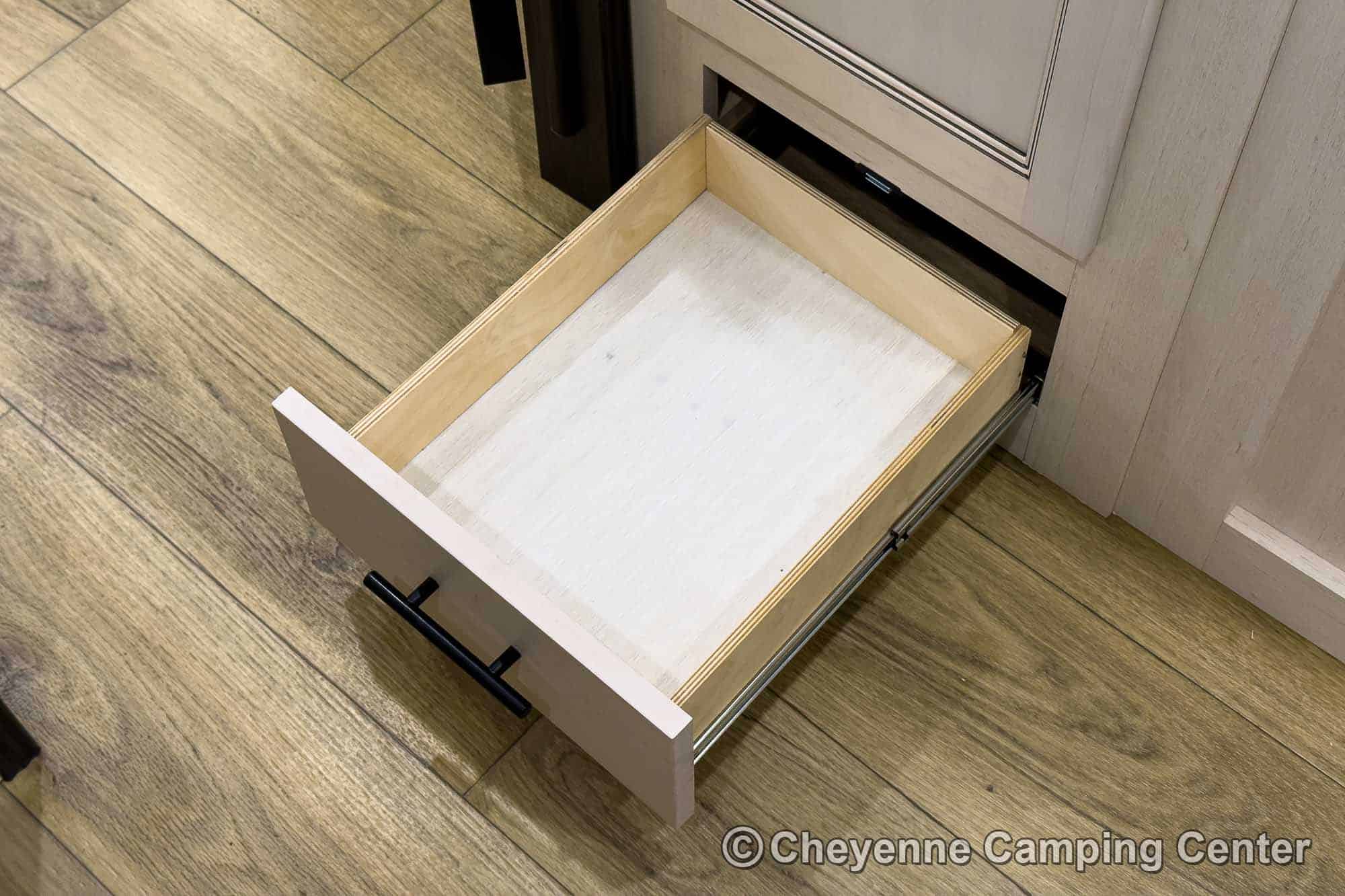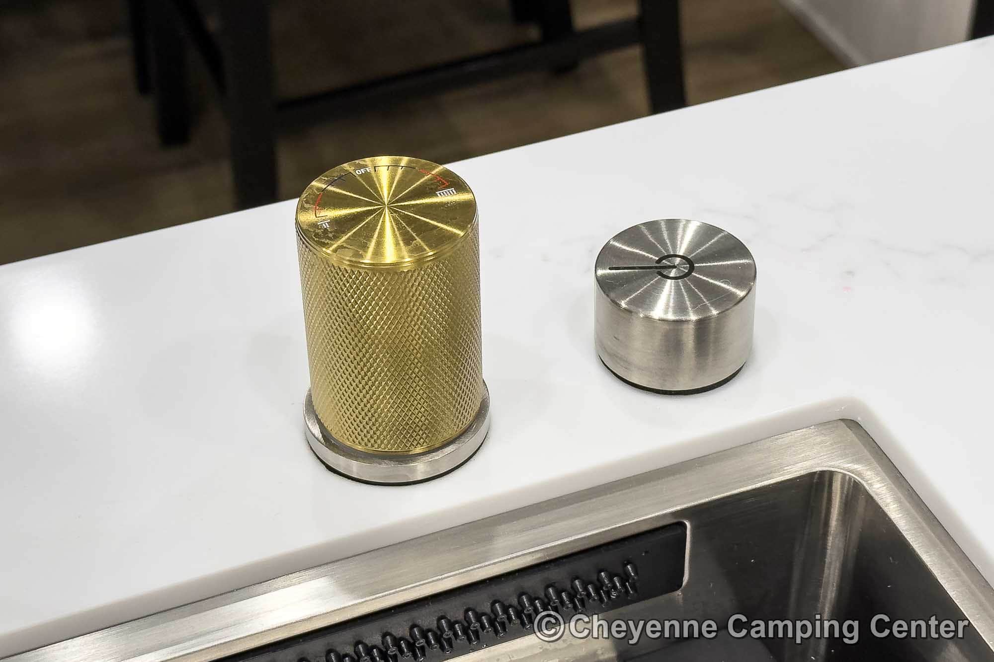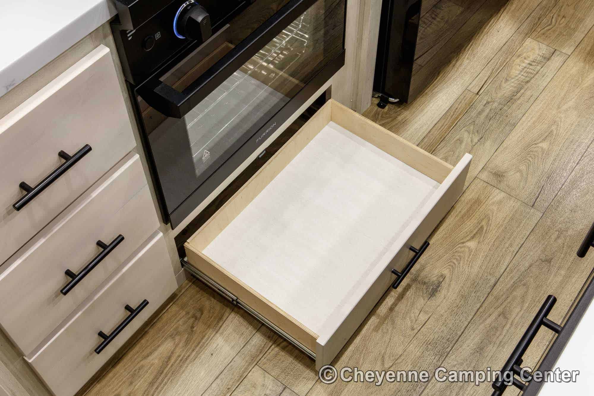 Chef-Inspired Kitchen: The heart of this fifth wheel is its island kitchen, featuring a workstation sink, solid-surface countertops, a 30″ microwave/convection oven, a residential-style gas range and oven, and a large residential-style refrigerator. A dedicated cabinet for the garbage can, a spacious pantry, and numerous drawers and cabinets offer ample storage. The free-standing dining table rotates to convert into a convenient desk.