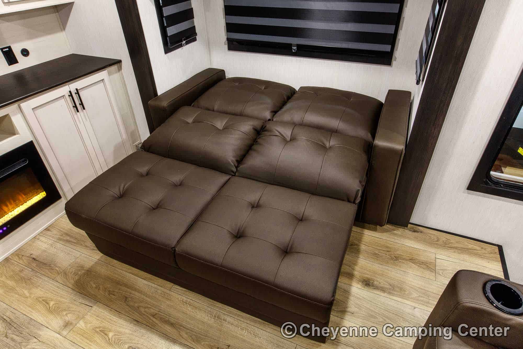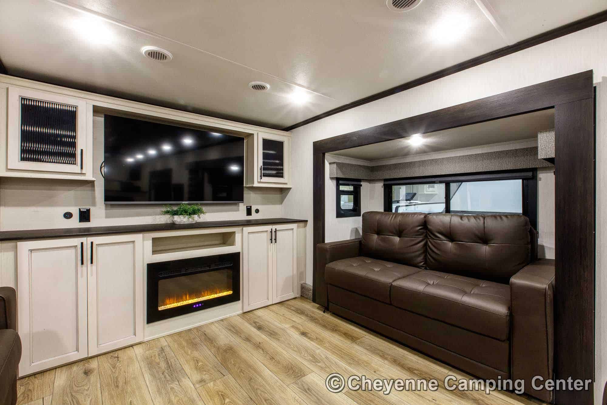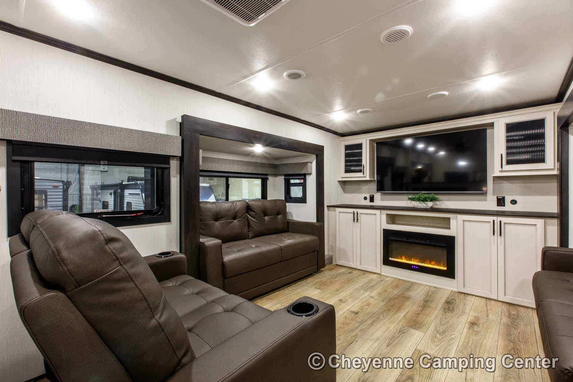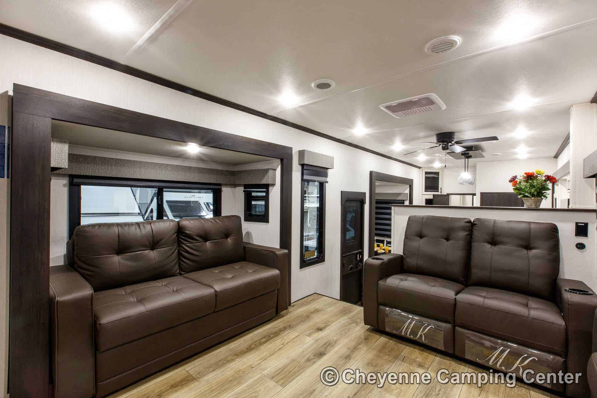Spacious Front Living Room: The Sabre 37FLH features an elevated front living area perfect for relaxing or entertaining. Dual opposing sofa sleepers, reclining theater seating, a 56” smart TV, an electric fireplace, and a ceiling fan create a cozy, inviting space that feels just like home.