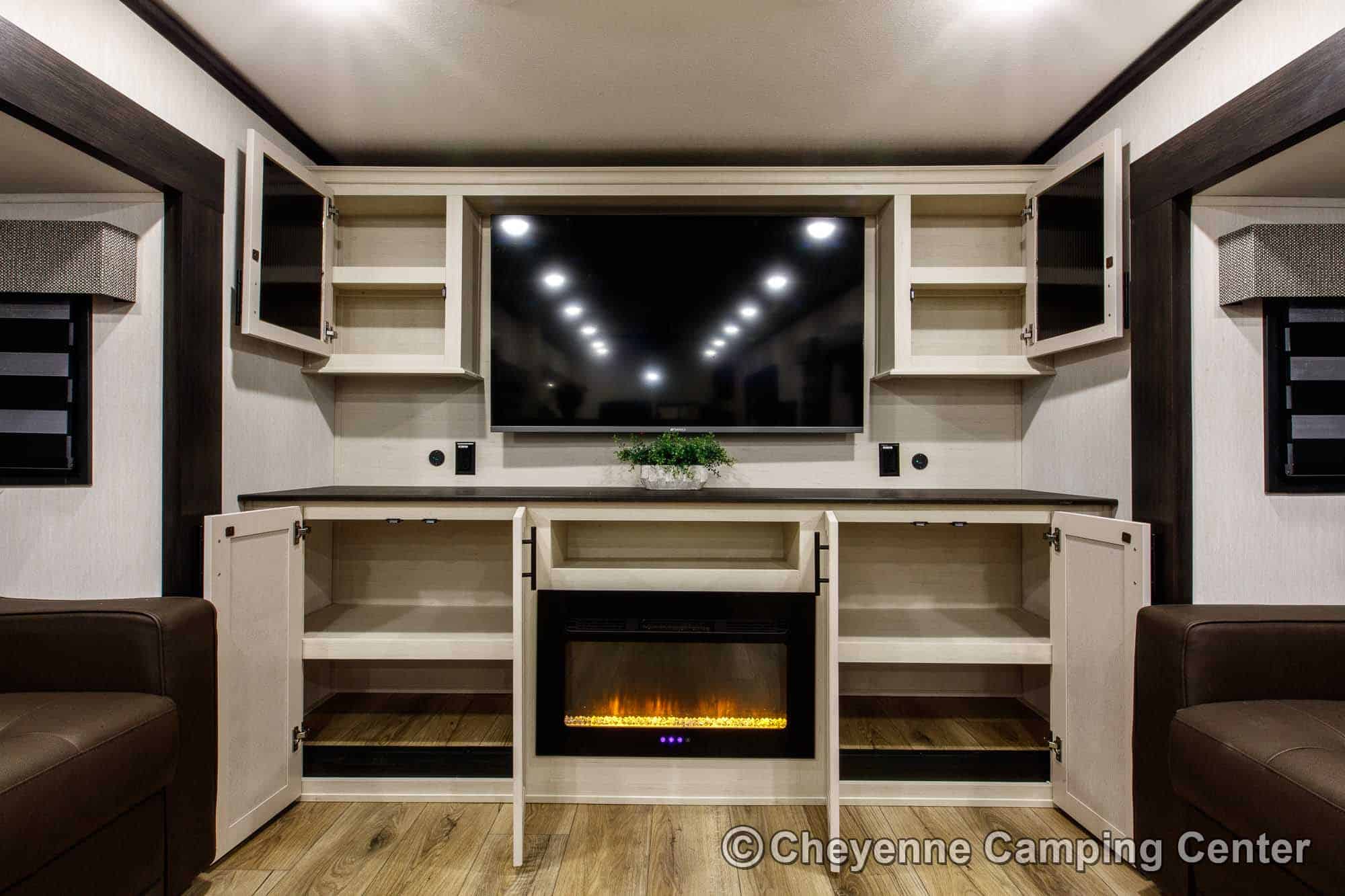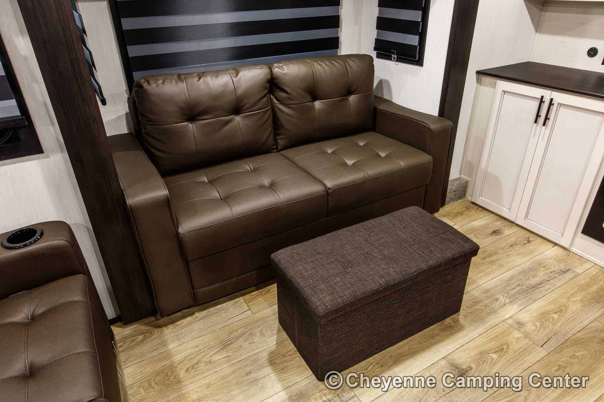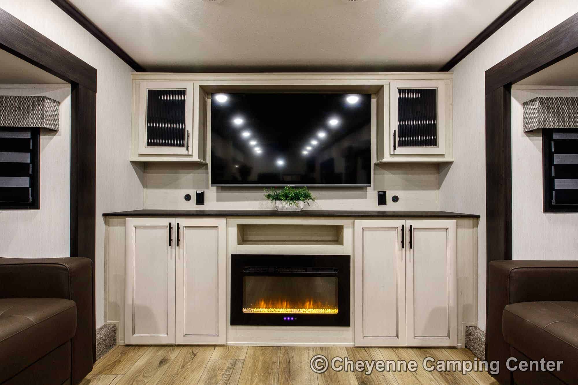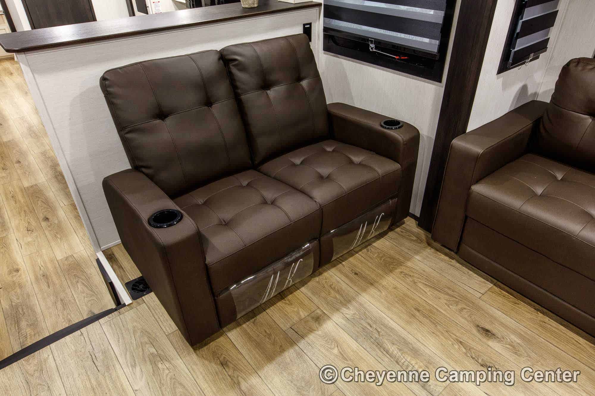 Spacious Front Living Room: The Sabre 37FLH features an elevated front living area perfect for relaxing or entertaining. Dual opposing sofa sleepers, reclining theater seating, a 56” smart TV, an electric fireplace, and a ceiling fan create a cozy, inviting space that feels just like home.