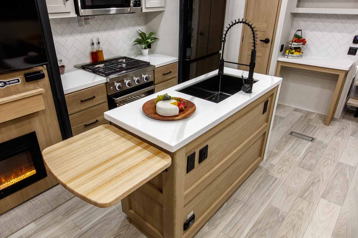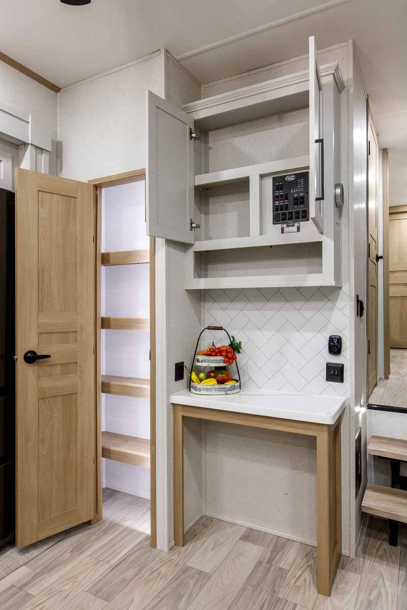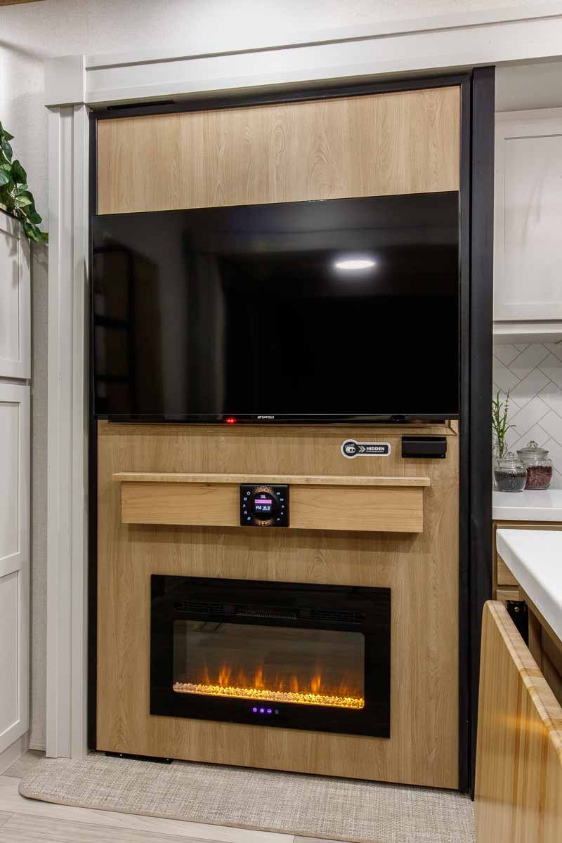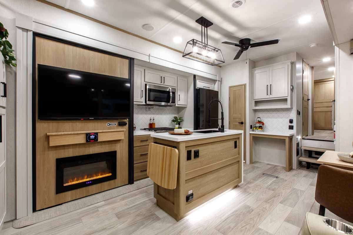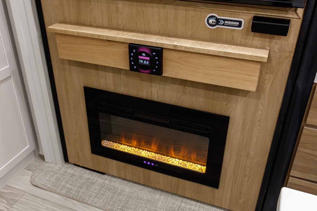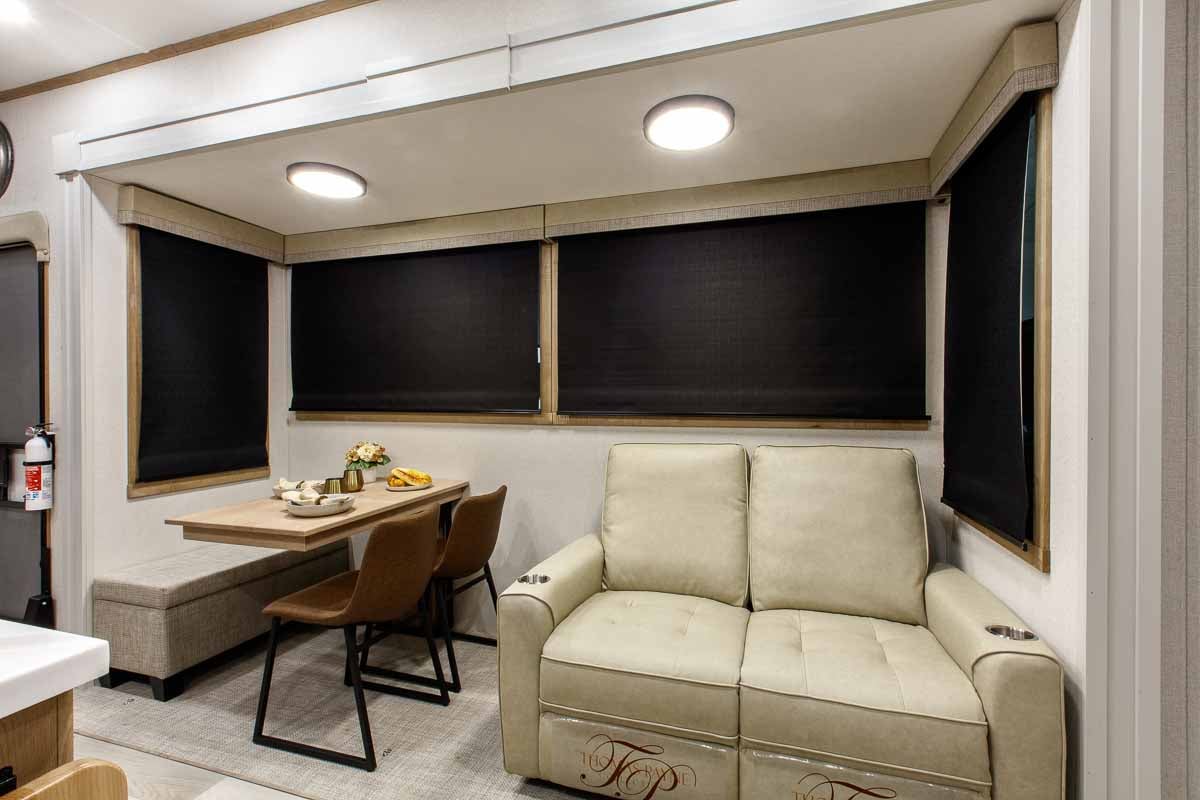 The wonderful island kitchen features beautiful residential-style two-tone cabinetry, solid surface countertops, a residential range with cast-iron grates, a residential microwave, 16 cu. ft. refrigerator, stainless apron sink with pull-out sprayer, and a counter extension. There’s ample storage, including a lighted pantry, a second hidden pantry behind the entertainment center, and numerous drawers and cabinets. You’ll also have a desk for your convenience! The living area has dual reclining theater seats and an entertainment center with a 50″ Smart LED TV, JBL Bluetooth stereo, and an electric fireplace with heat.