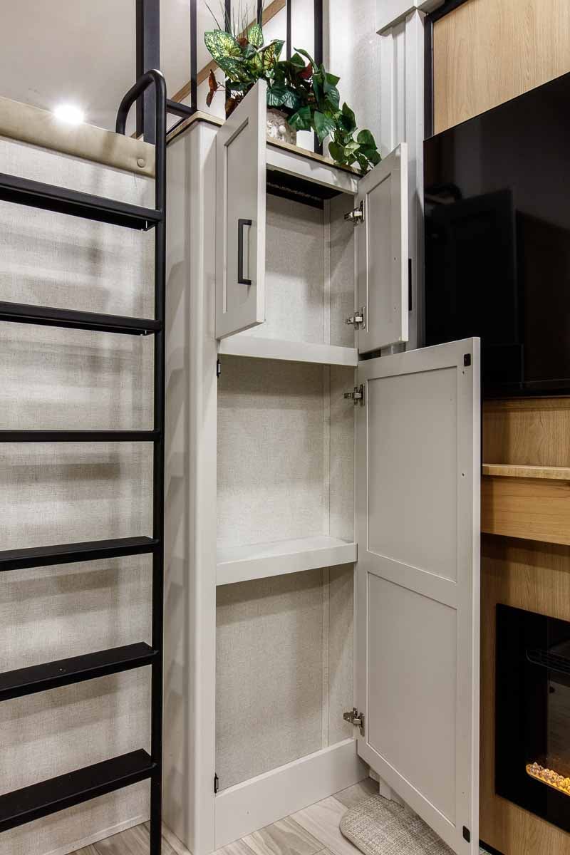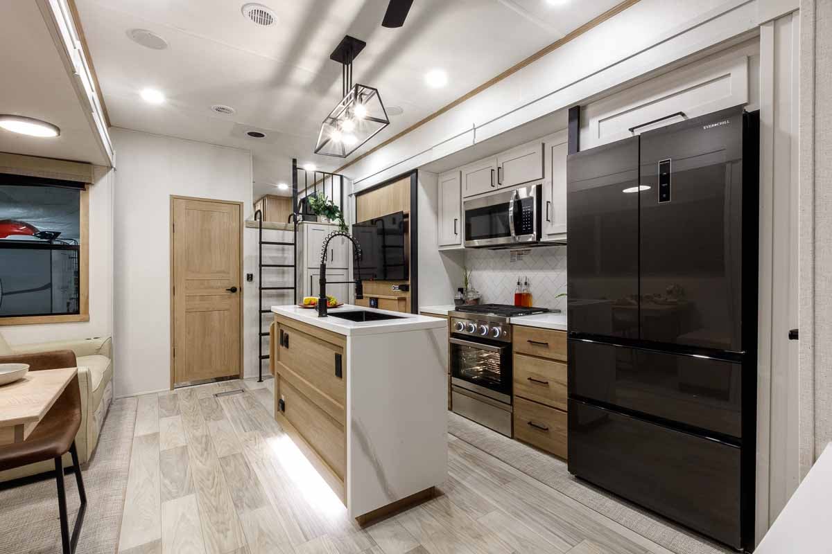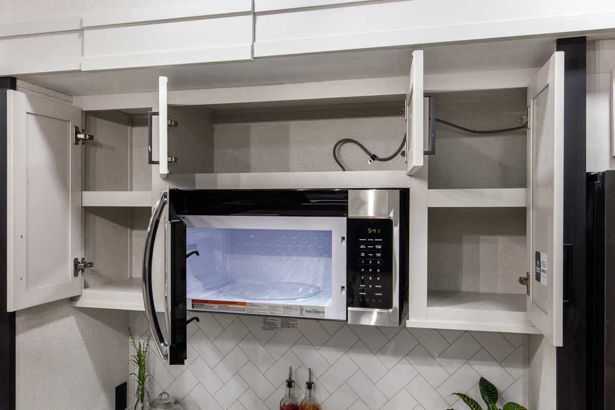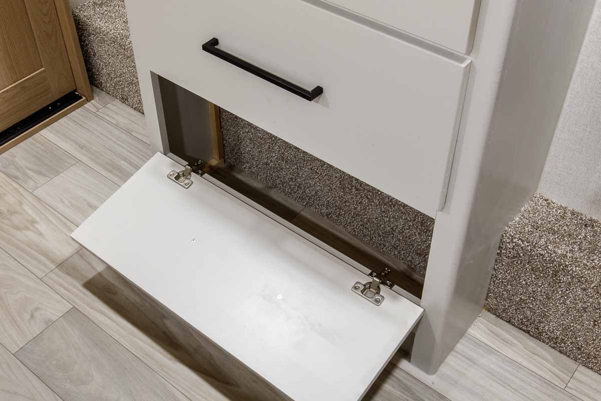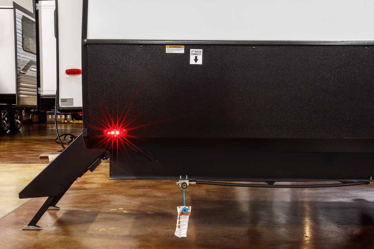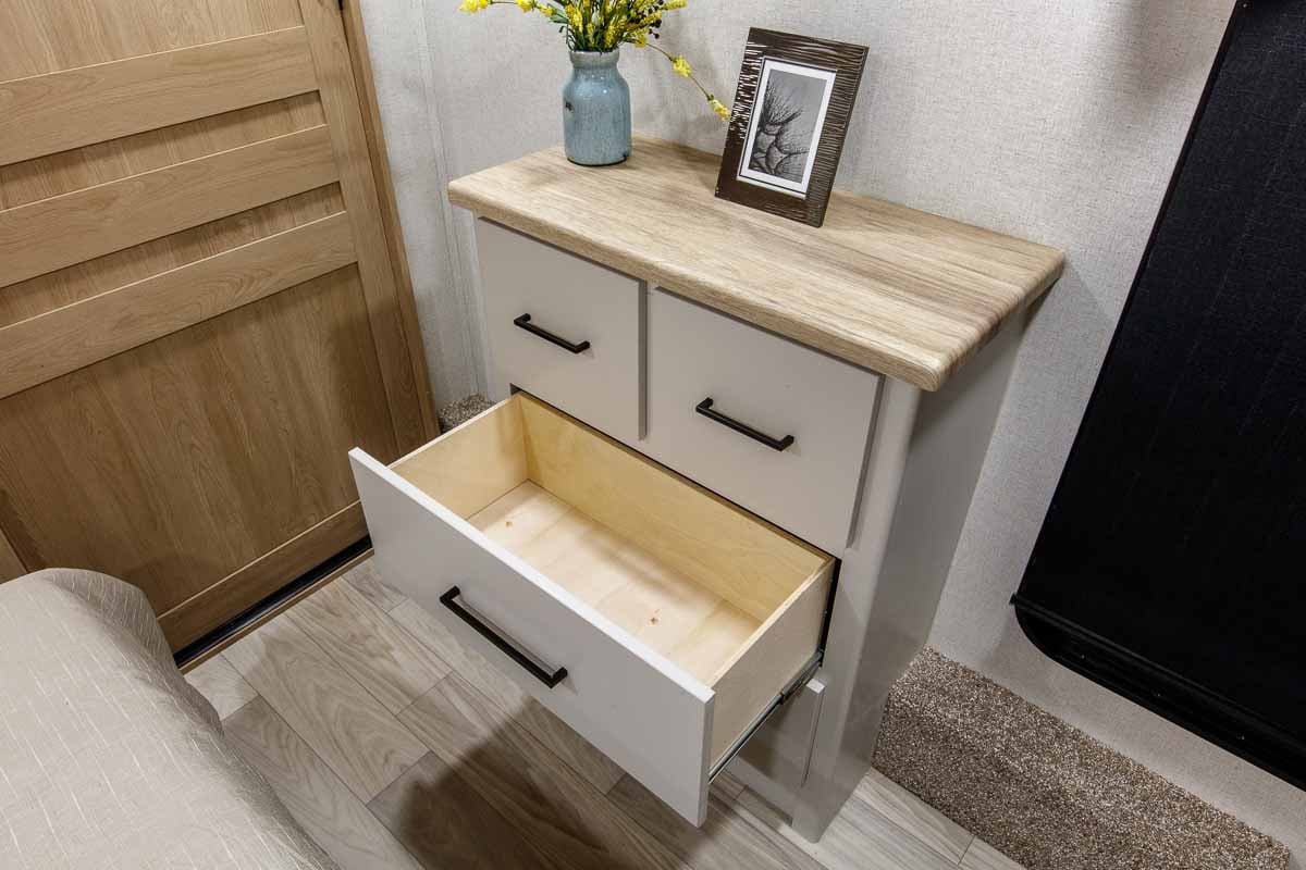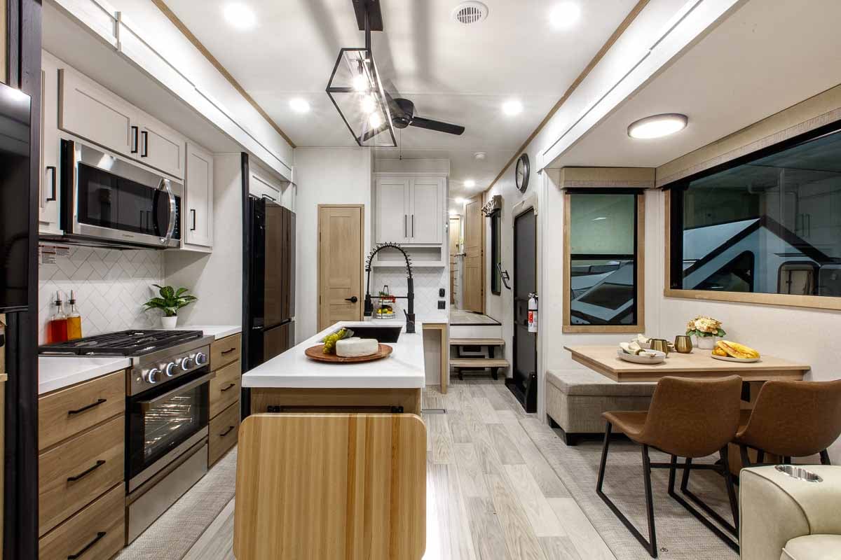 The wonderful island kitchen features beautiful residential-style two-tone cabinetry, solid surface countertops, a residential range with cast-iron grates, a residential microwave, 16 cu. ft. refrigerator, stainless apron sink with pull-out sprayer, and a counter extension. There’s ample storage, including a lighted pantry, a second hidden pantry behind the entertainment center, and numerous drawers and cabinets. You’ll also have a desk for your convenience! The living area has dual reclining theater seats and an entertainment center with a 50″ Smart LED TV, JBL Bluetooth stereo, and an electric fireplace with heat.