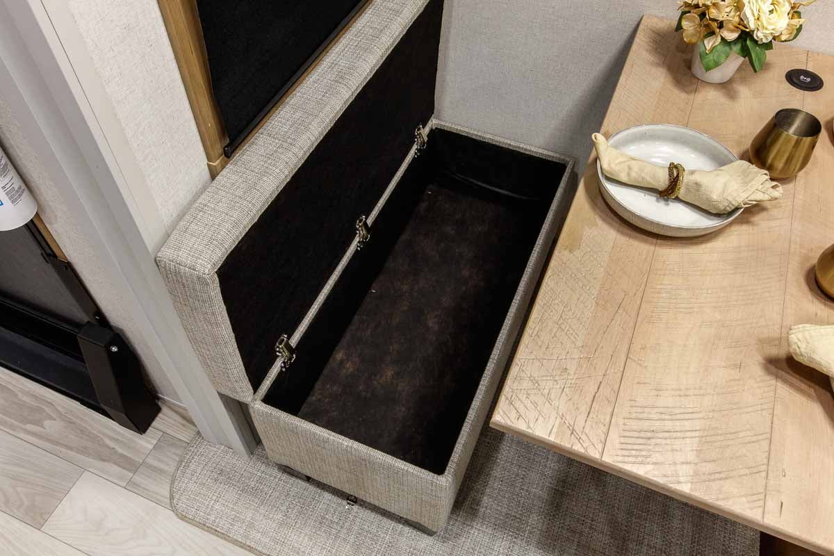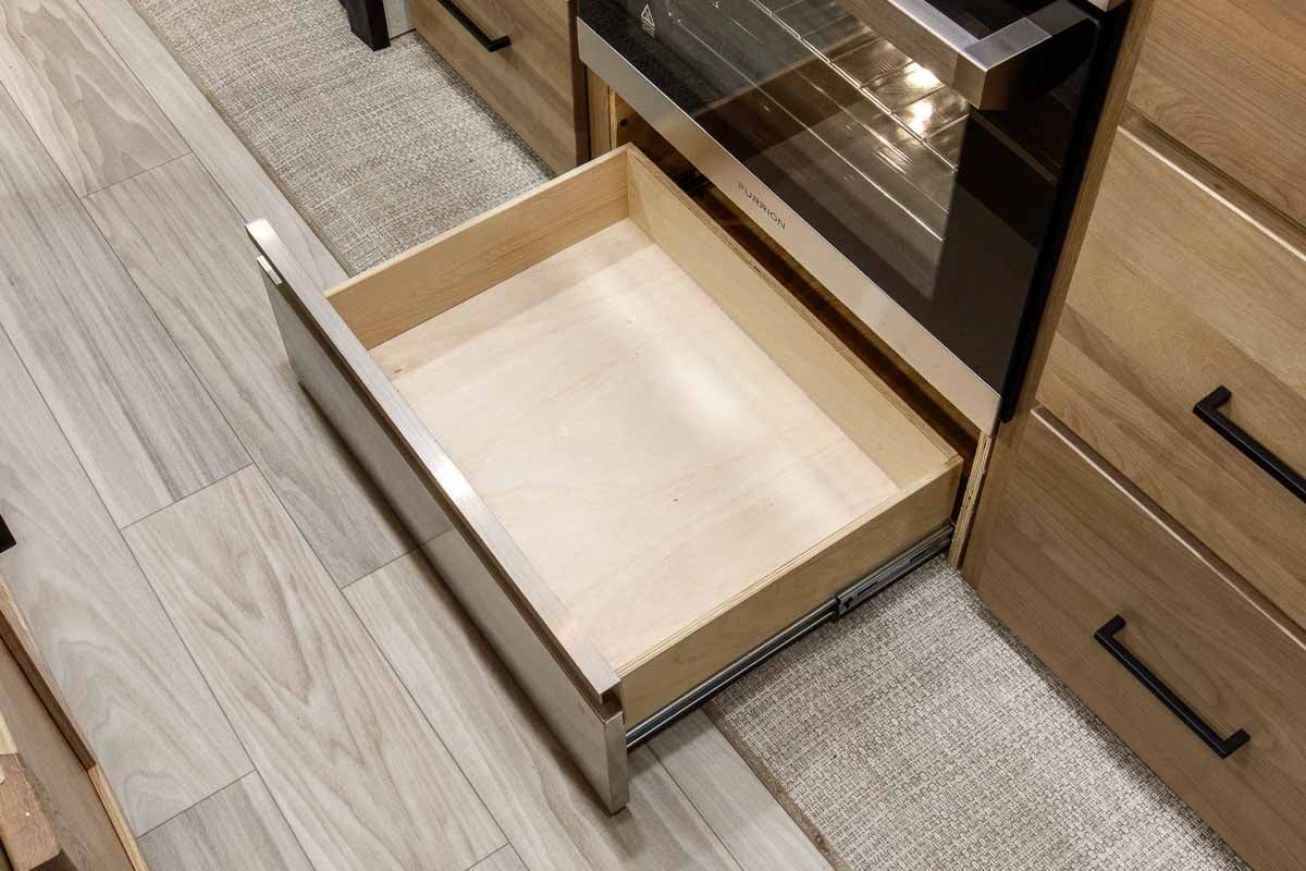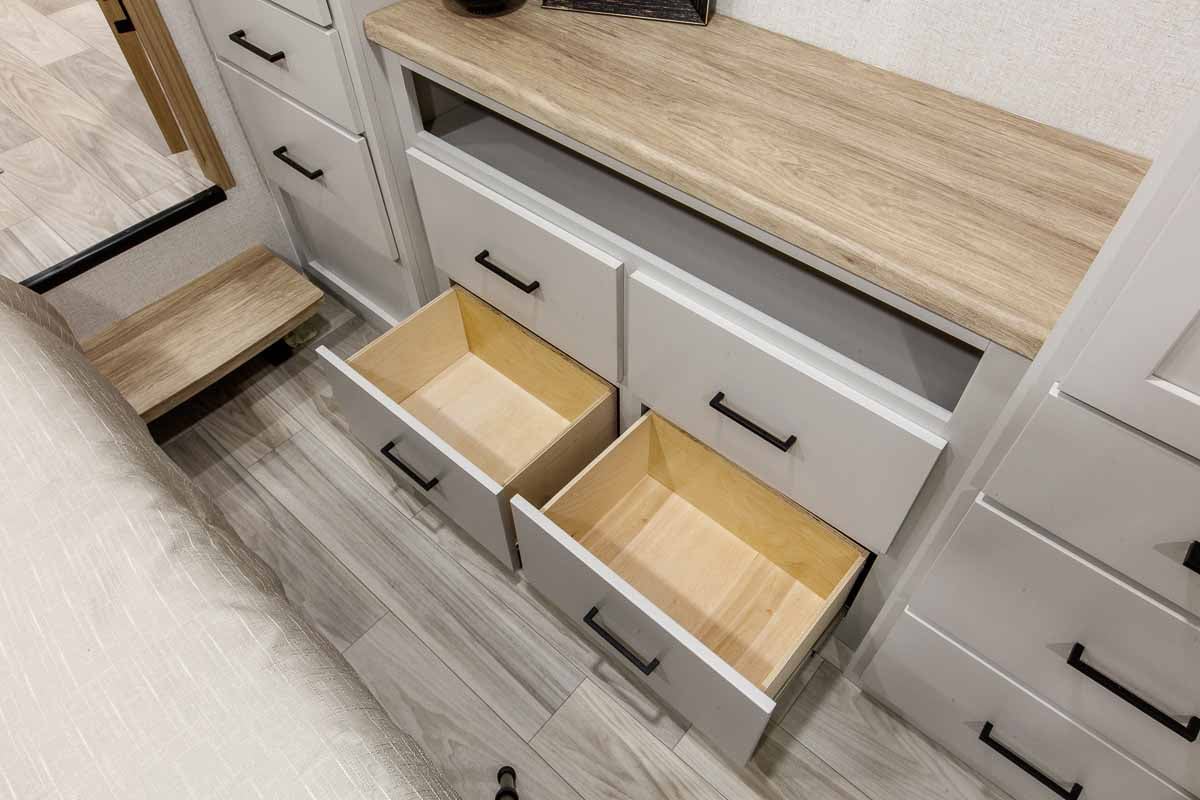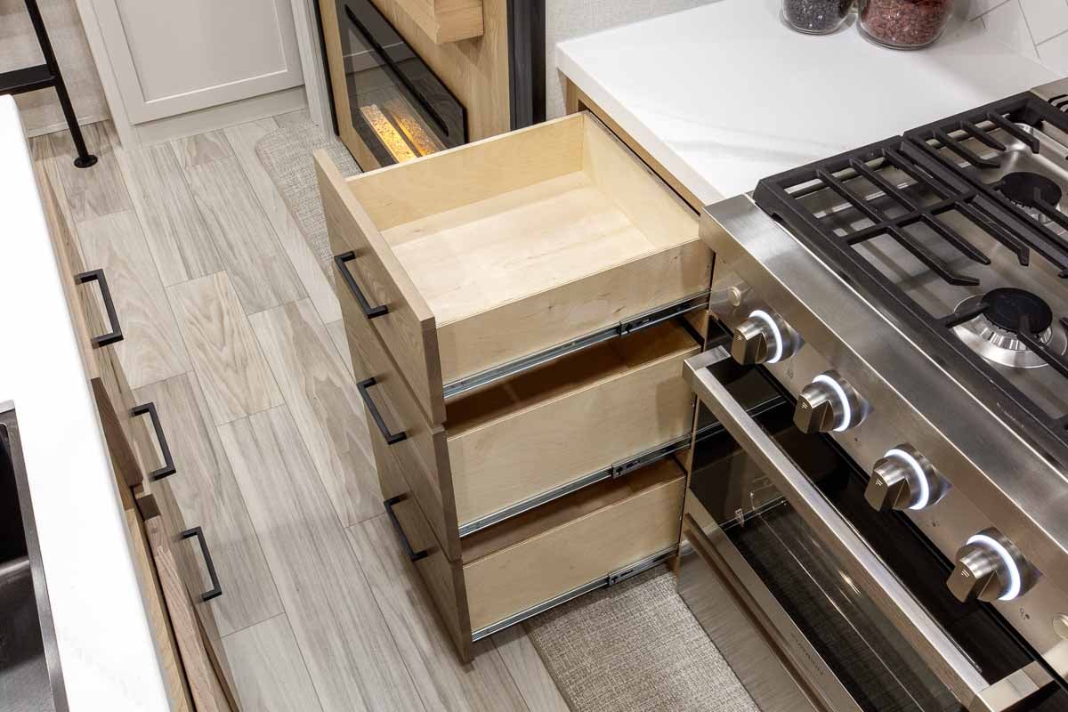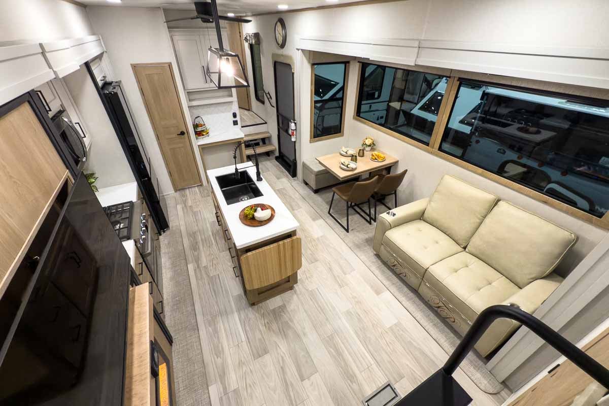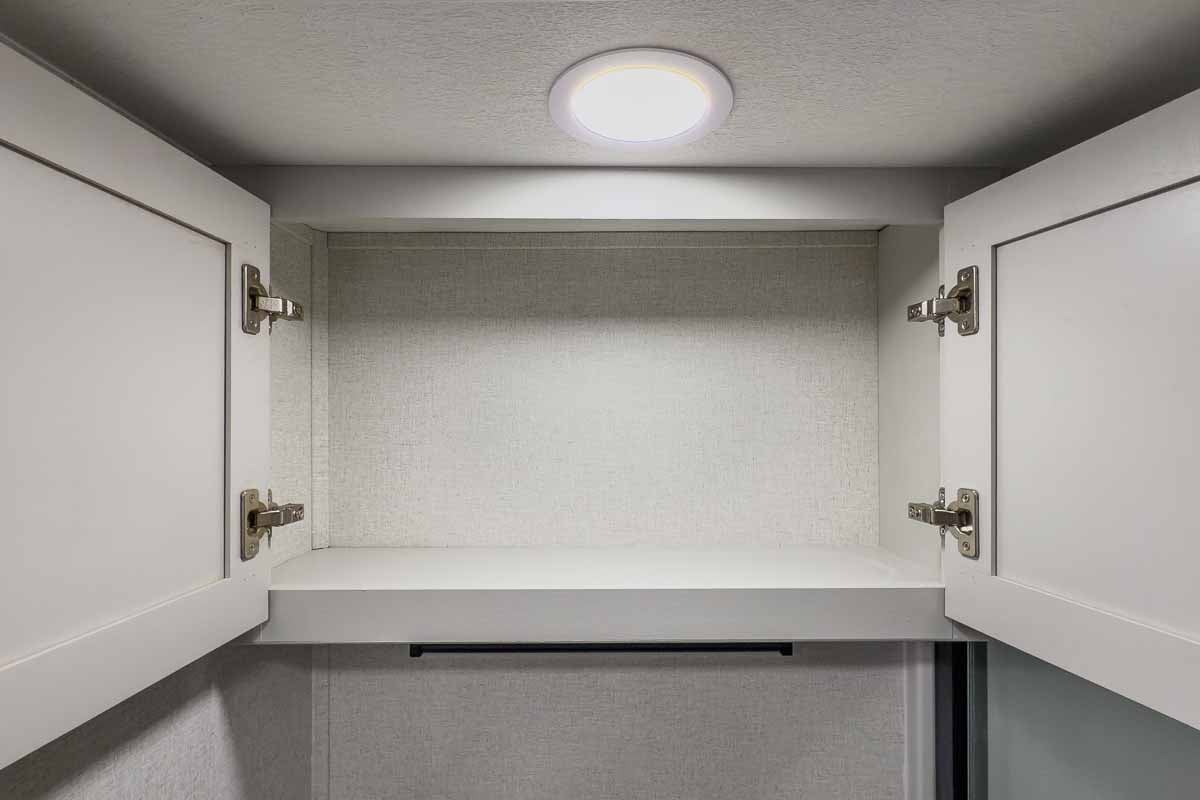 The wonderful island kitchen features beautiful residential-style two-tone cabinetry, solid surface countertops, a residential range with cast-iron grates, a residential microwave, 16 cu. ft. refrigerator, stainless apron sink with pull-out sprayer, and a counter extension. There’s ample storage, including a lighted pantry, a second hidden pantry behind the entertainment center, and numerous drawers and cabinets. You’ll also have a desk for your convenience! The living area has dual reclining theater seats and an entertainment center with a 50″ Smart LED TV, JBL Bluetooth stereo, and an electric fireplace with heat.