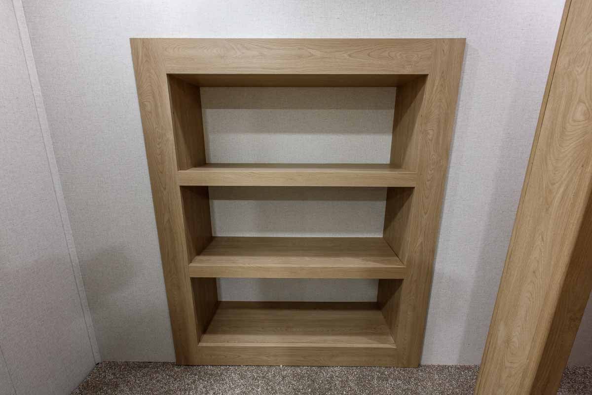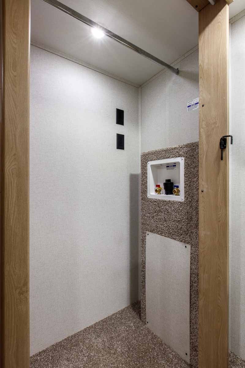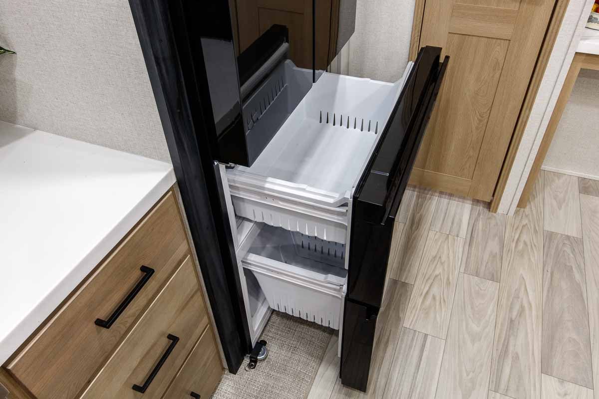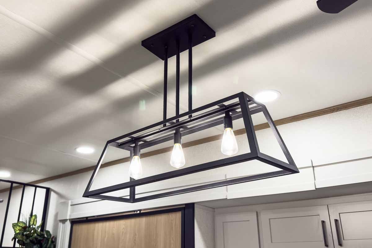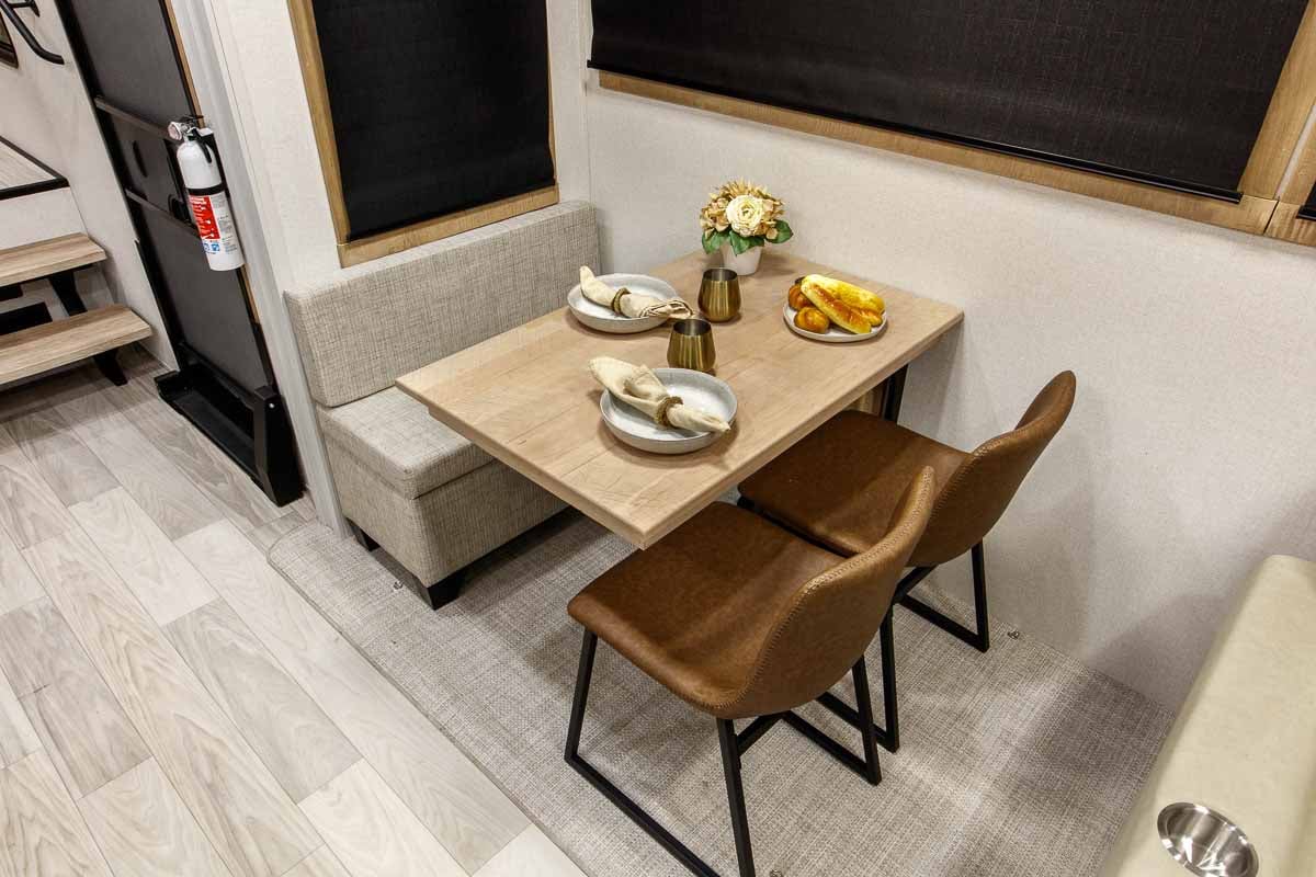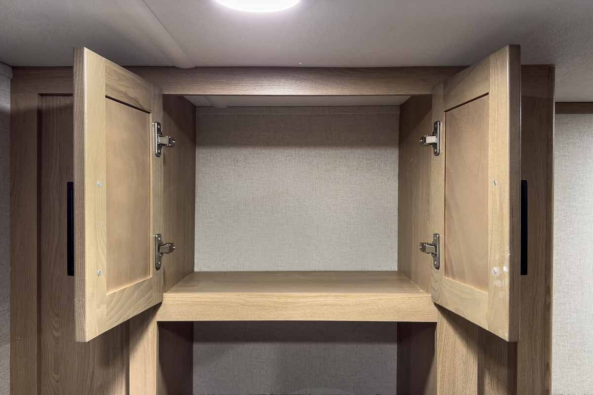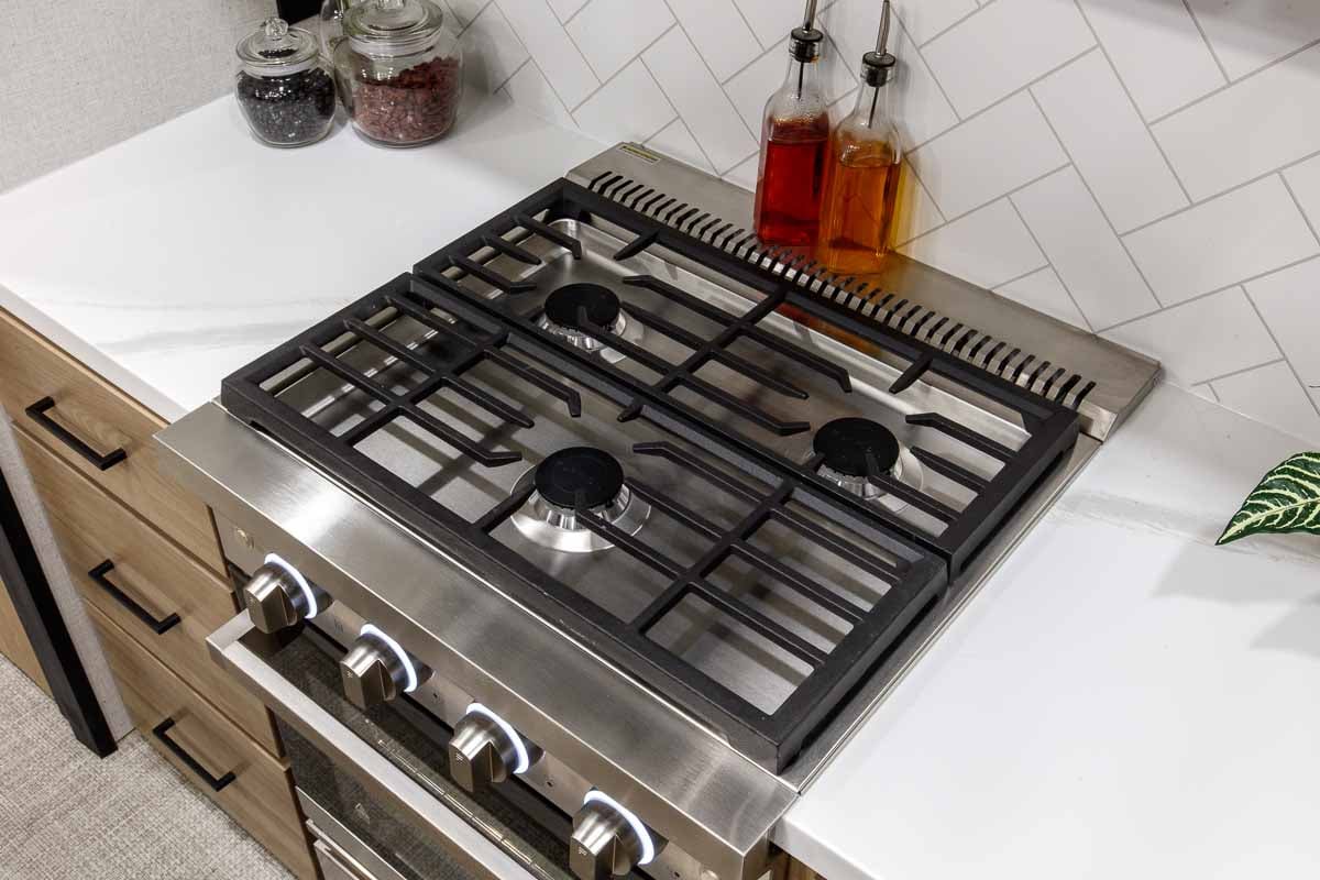 The wonderful island kitchen features beautiful residential-style two-tone cabinetry, solid surface countertops, a residential range with cast-iron grates, a residential microwave, 16 cu. ft. refrigerator, stainless apron sink with pull-out sprayer, and a counter extension. There’s ample storage, including a lighted pantry, a second hidden pantry behind the entertainment center, and numerous drawers and cabinets. You’ll also have a desk for your convenience! The living area has dual reclining theater seats and an entertainment center with a 50″ Smart LED TV, JBL Bluetooth stereo, and an electric fireplace with heat.