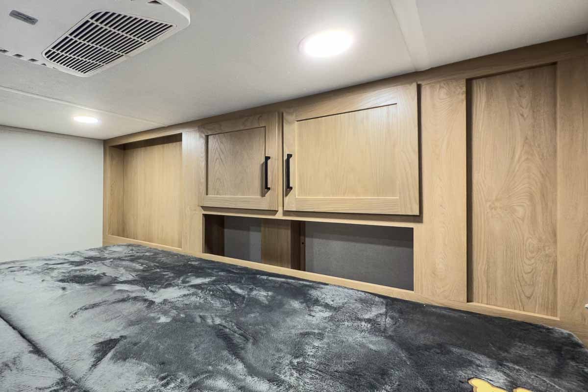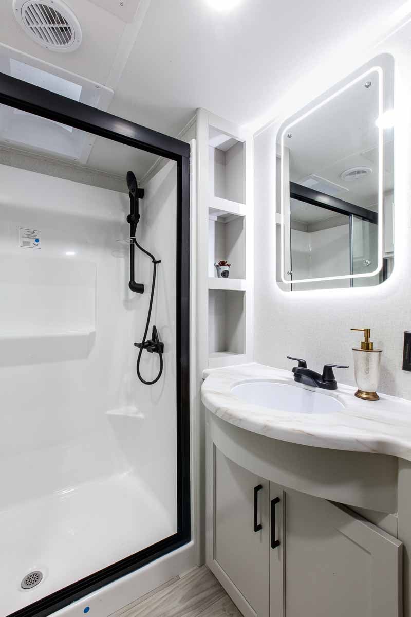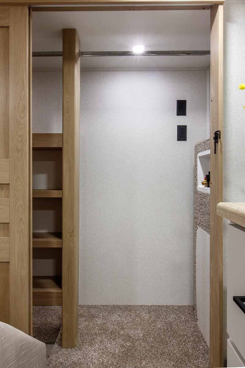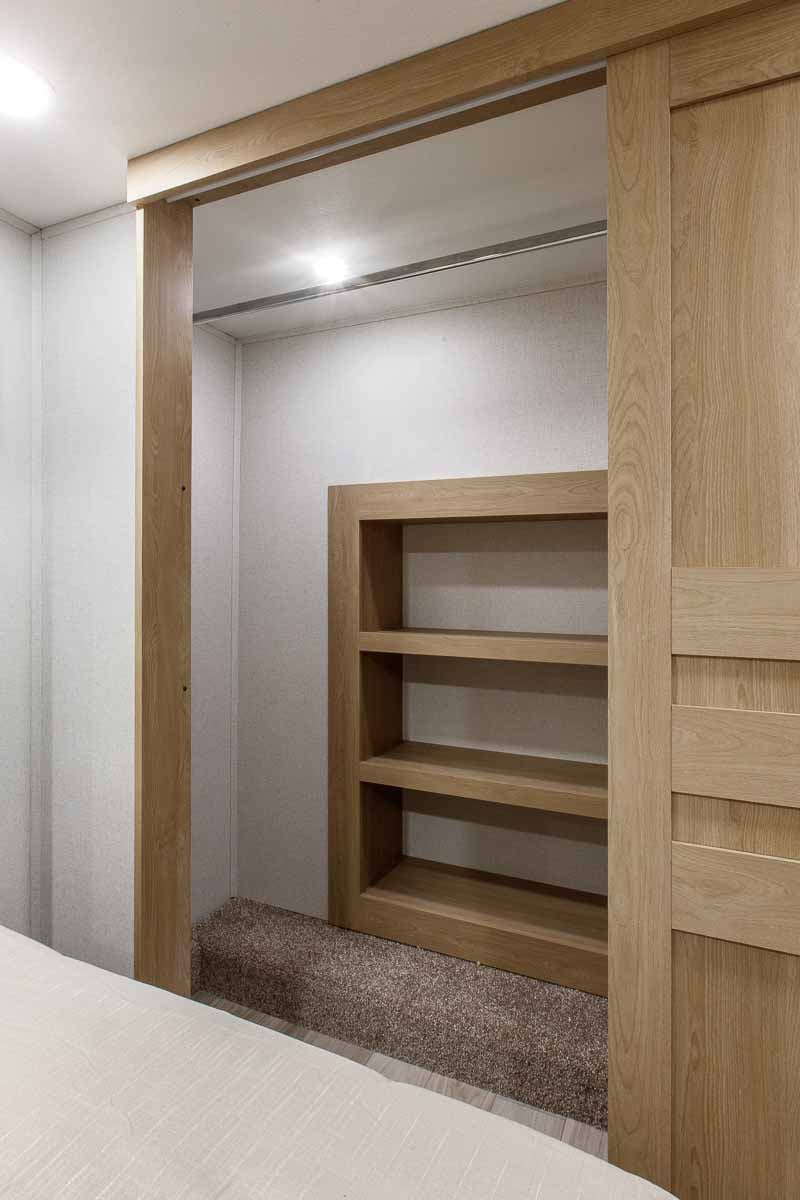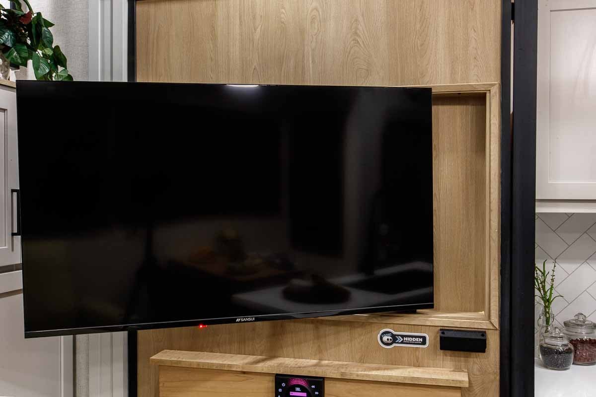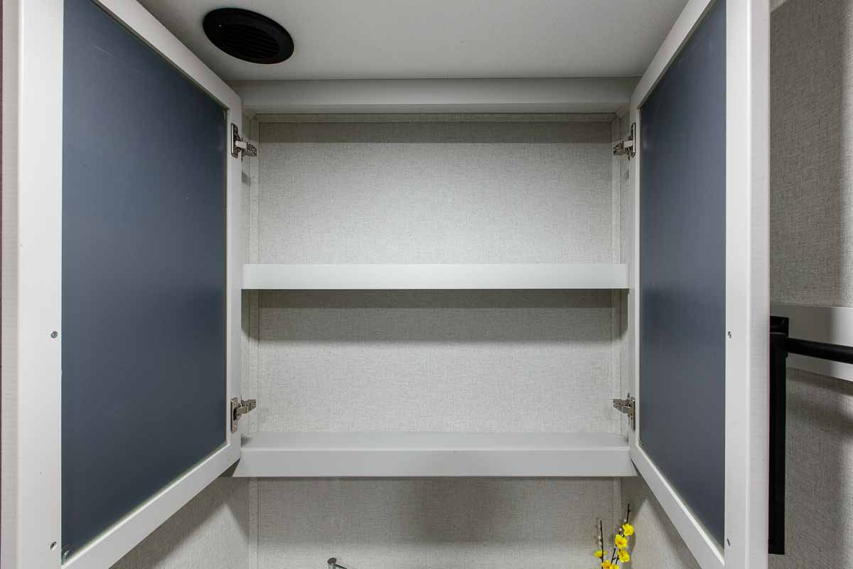 The wonderful island kitchen features beautiful residential-style two-tone cabinetry, solid surface countertops, a residential range with cast-iron grates, a residential microwave, 16 cu. ft. refrigerator, stainless apron sink with pull-out sprayer, and a counter extension. There’s ample storage, including a lighted pantry, a second hidden pantry behind the entertainment center, and numerous drawers and cabinets. You’ll also have a desk for your convenience! The living area has dual reclining theater seats and an entertainment center with a 50″ Smart LED TV, JBL Bluetooth stereo, and an electric fireplace with heat.