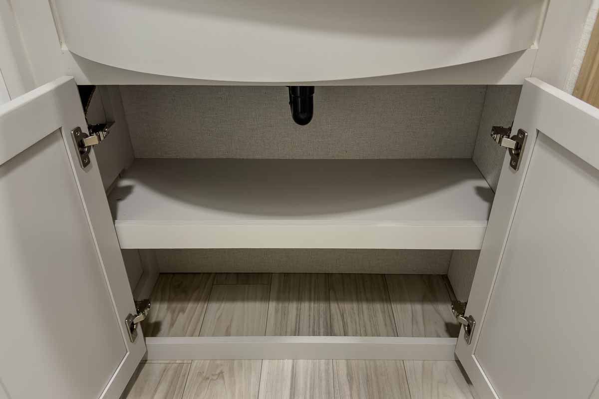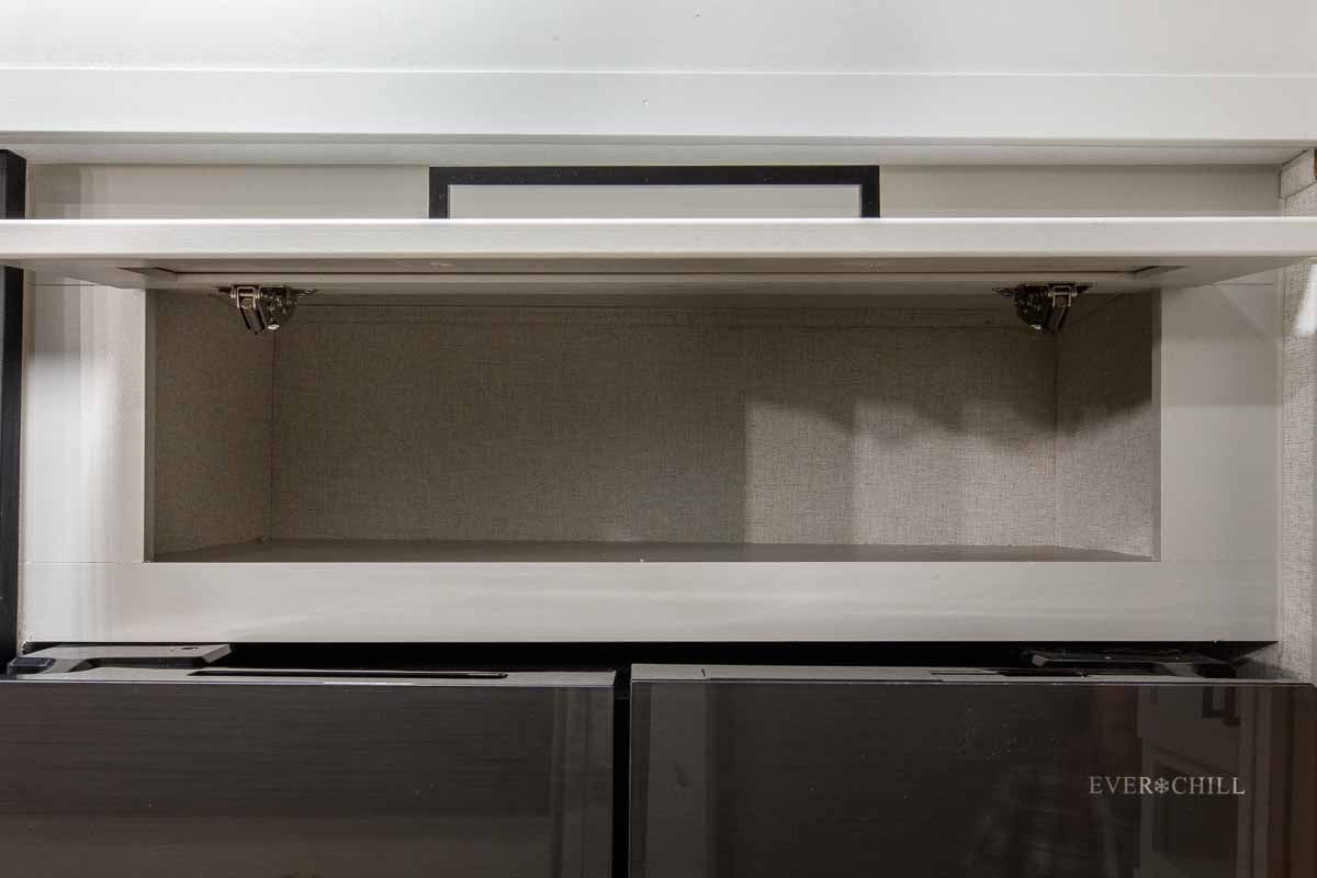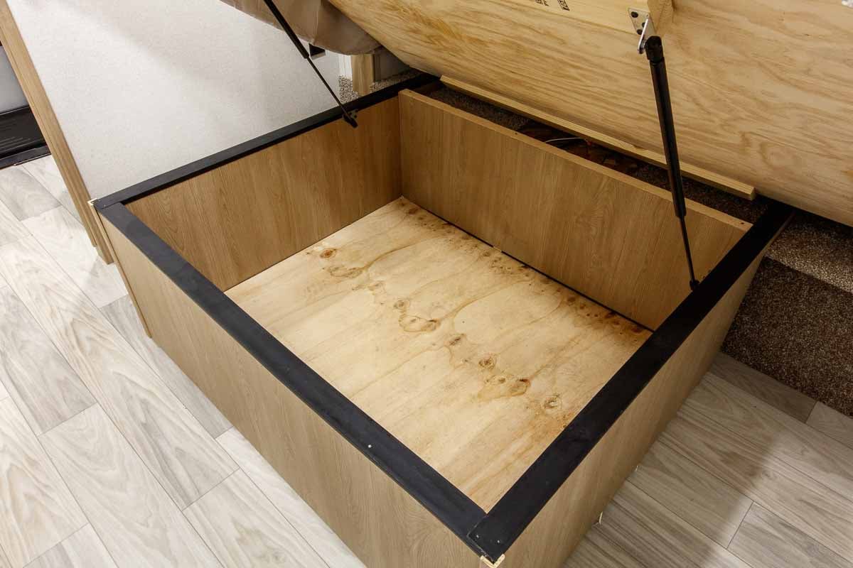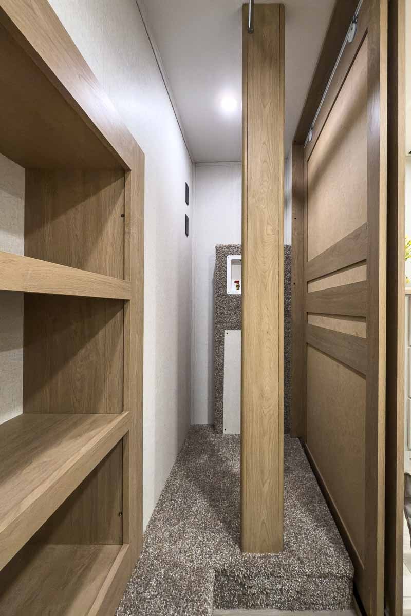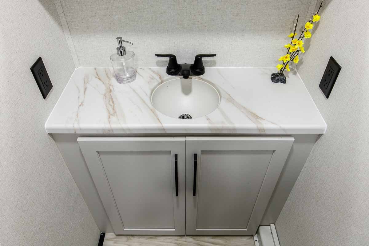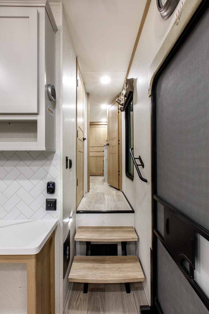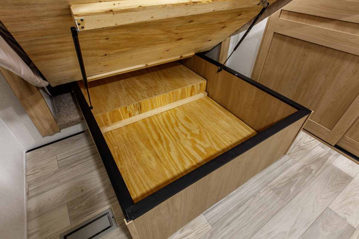 The wonderful island kitchen features beautiful residential-style two-tone cabinetry, solid surface countertops, a residential range with cast-iron grates, a residential microwave, 16 cu. ft. refrigerator, stainless apron sink with pull-out sprayer, and a counter extension. There’s ample storage, including a lighted pantry, a second hidden pantry behind the entertainment center, and numerous drawers and cabinets. You’ll also have a desk for your convenience! The living area has dual reclining theater seats and an entertainment center with a 50″ Smart LED TV, JBL Bluetooth stereo, and an electric fireplace with heat.