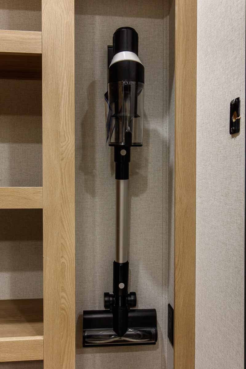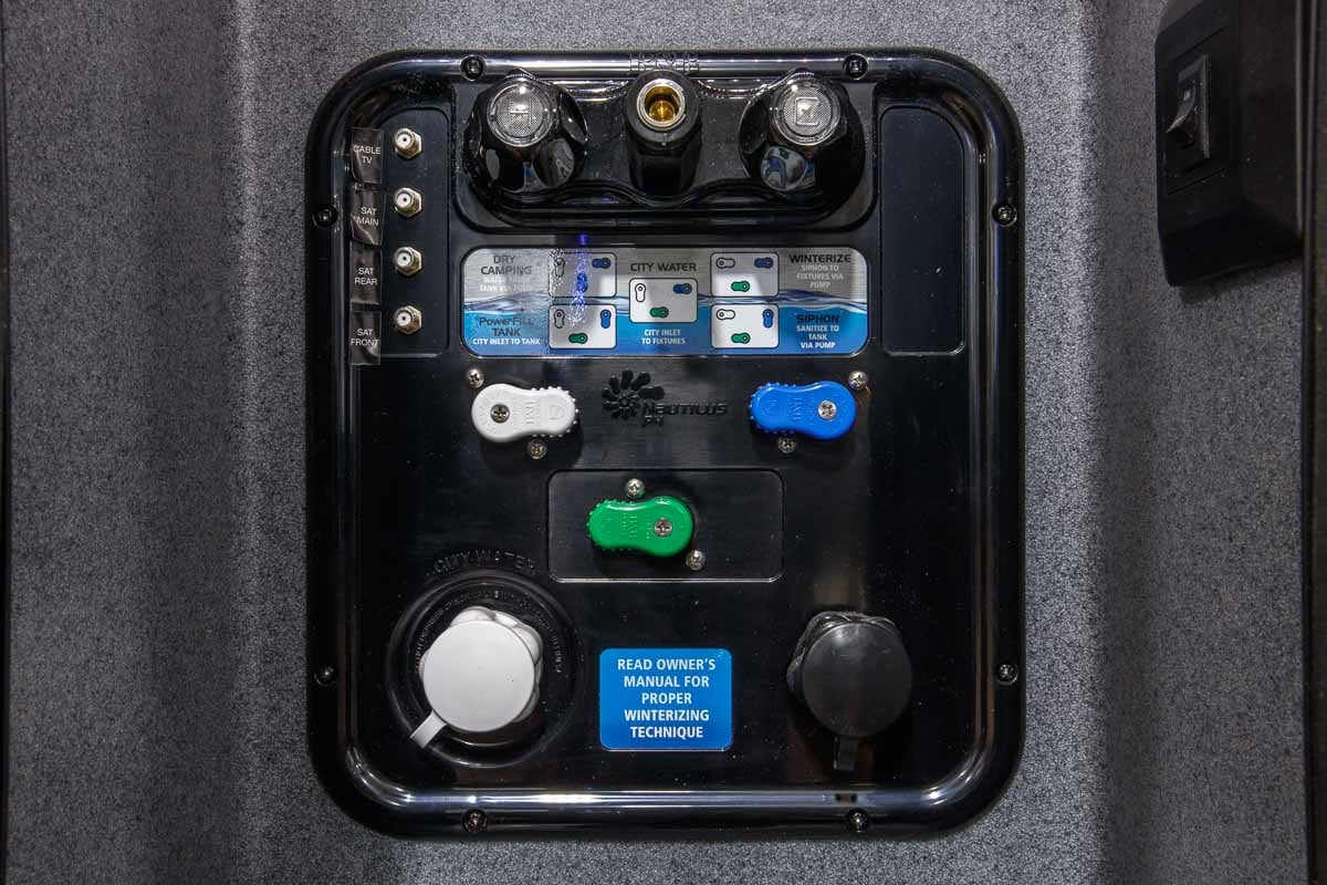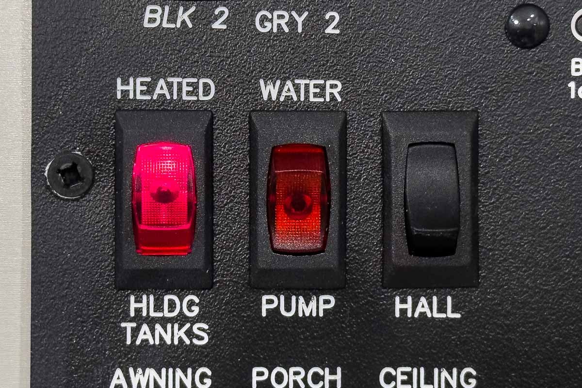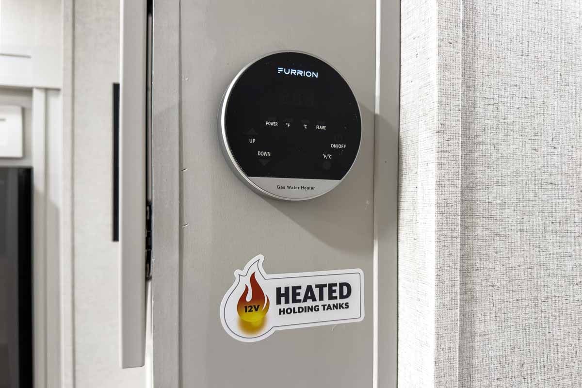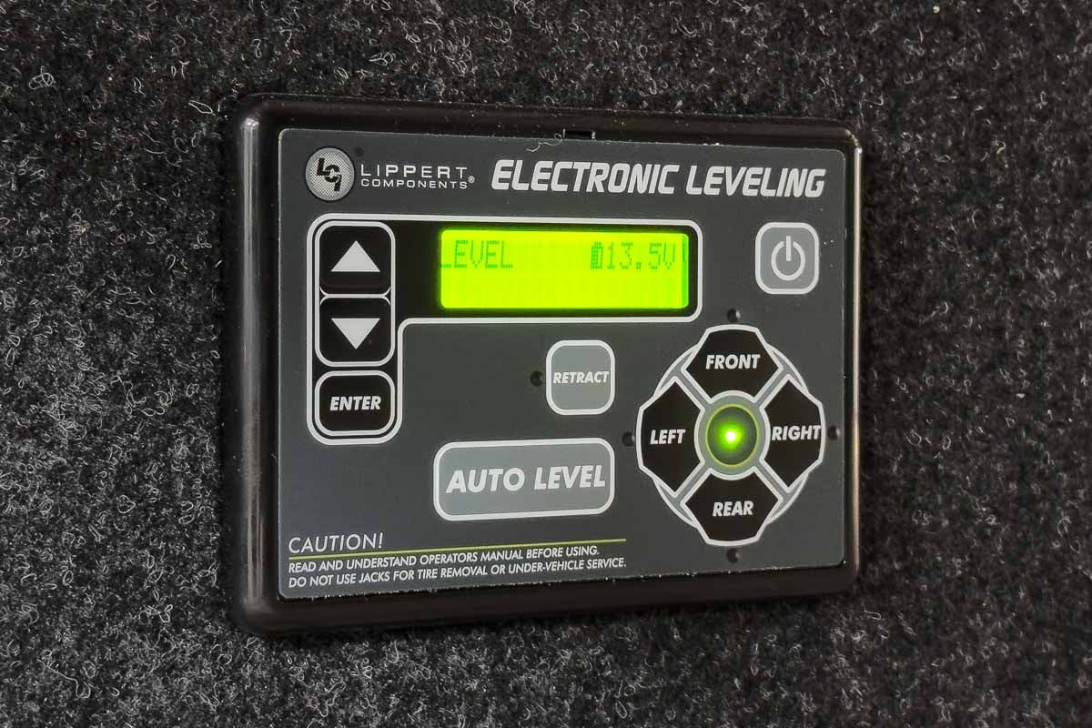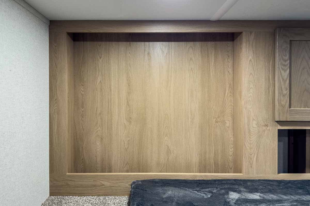 The wonderful island kitchen features beautiful residential-style two-tone cabinetry, solid surface countertops, a residential range with cast-iron grates, a residential microwave, 16 cu. ft. refrigerator, stainless apron sink with pull-out sprayer, and a counter extension. There’s ample storage, including a lighted pantry, a second hidden pantry behind the entertainment center, and numerous drawers and cabinets. You’ll also have a desk for your convenience! The living area has dual reclining theater seats and an entertainment center with a 50″ Smart LED TV, JBL Bluetooth stereo, and an electric fireplace with heat.