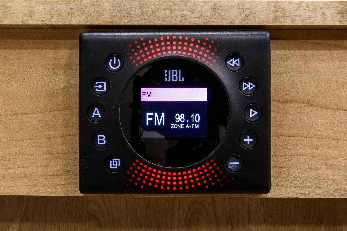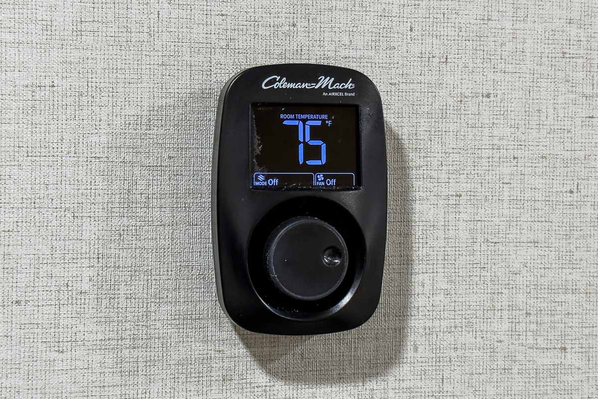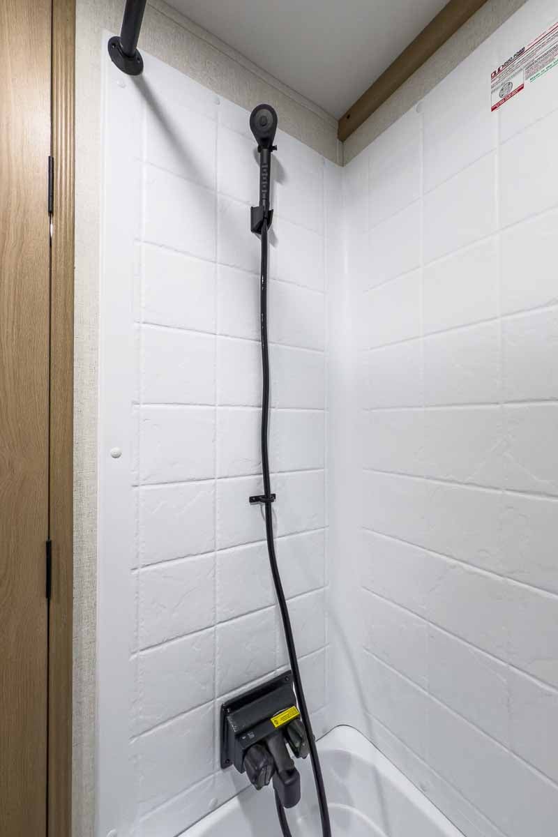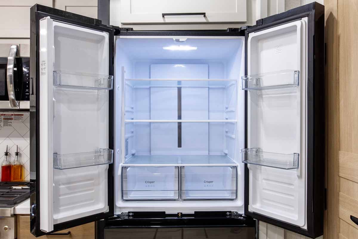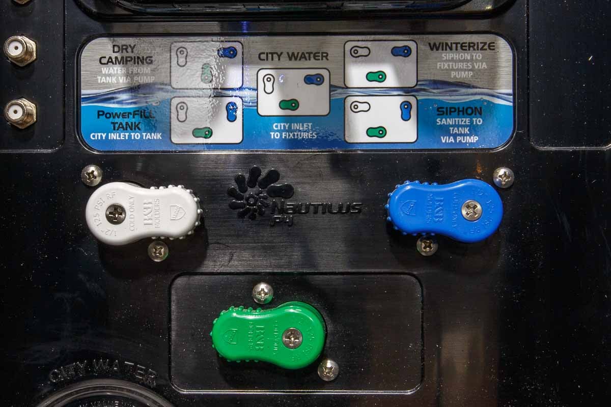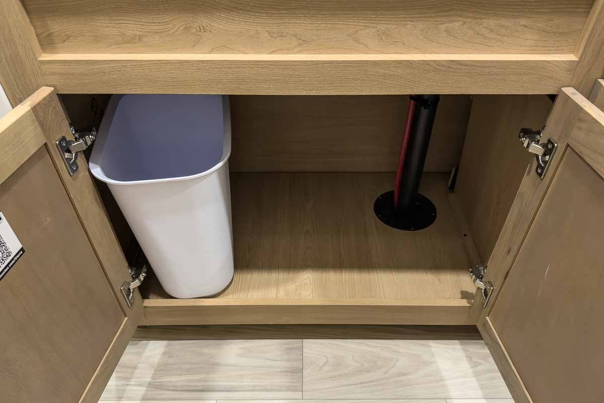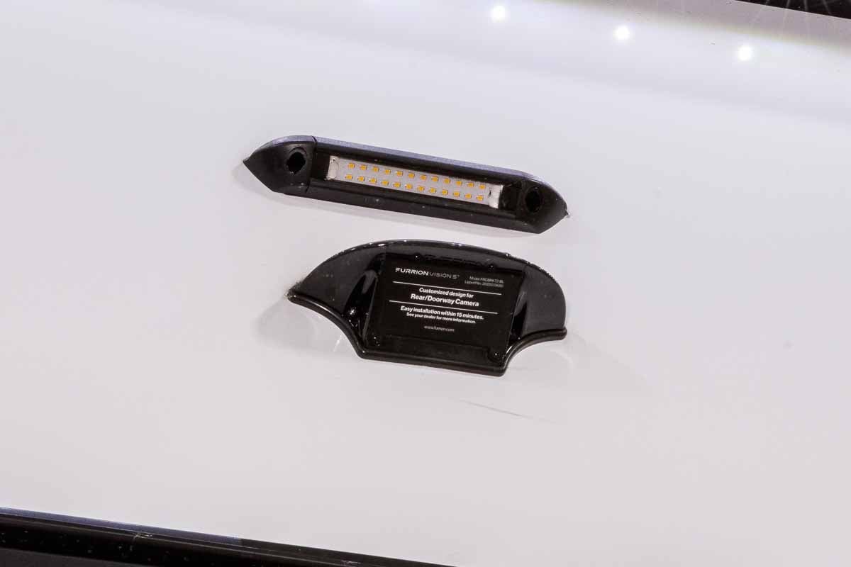 The wonderful island kitchen features beautiful residential-style two-tone cabinetry, solid surface countertops, a residential range with cast-iron grates, a residential microwave, 16 cu. ft. refrigerator, stainless apron sink with pull-out sprayer, and a counter extension. There’s ample storage, including a lighted pantry, a second hidden pantry behind the entertainment center, and numerous drawers and cabinets. You’ll also have a desk for your convenience! The living area has dual reclining theater seats and an entertainment center with a 50″ Smart LED TV, JBL Bluetooth stereo, and an electric fireplace with heat.