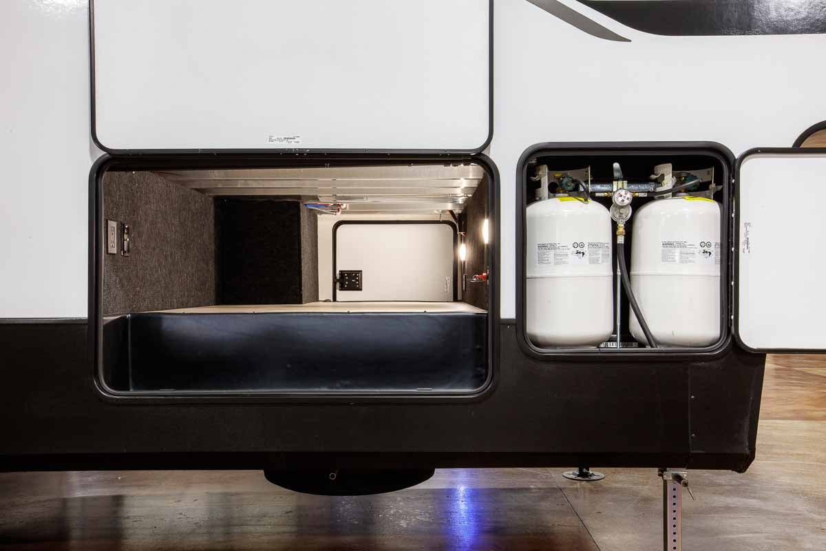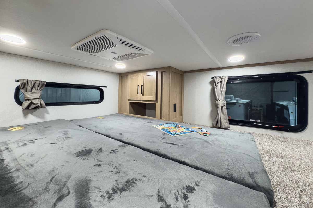 Other features include LED lighting, black tank flush, premium roller shades, enclosed and heated underbelly with heated tanks and dump valves, battery disconnect, two 15K air conditioners, WI-FI extender, one-year manufacturer’s warranty, and one-year roadside assistance. The Sierra 4002FB for sale at Cheyenne Camping Center is the ultimate two-bedroom fifth wheel, offering exceptional comfort, space, and luxury for families or guests on the road.