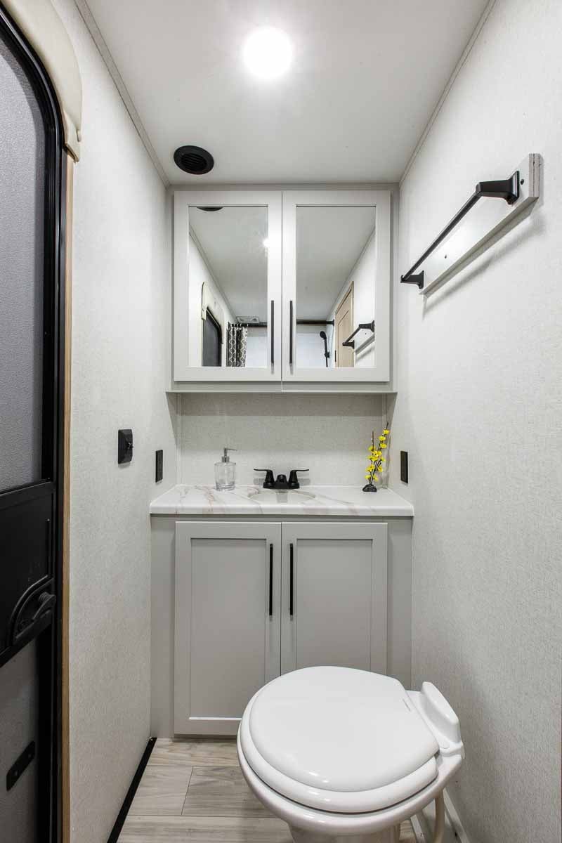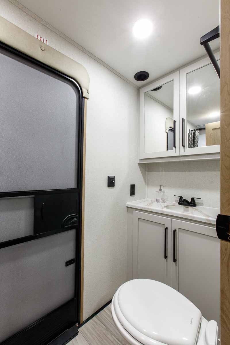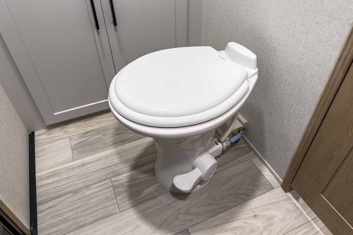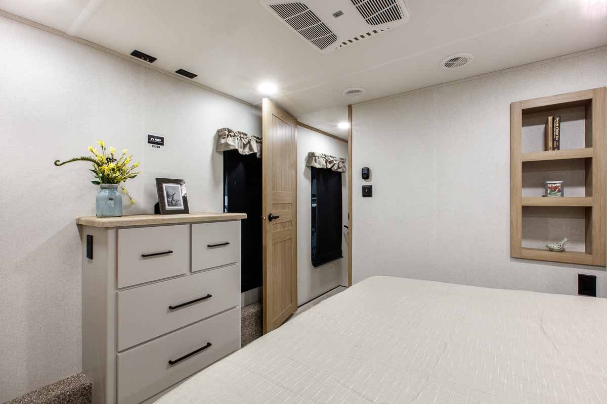 If you’re looking for a two-bedroom, two-bathroom fifth wheel with sleeping for six, the Sierra 4002FB for sale at Cheyenne Camping Center is a perfect choice! The primary bedroom features a slide-out queen bed, a spacious front wardrobe, washer/dryer prep, and a dresser. The primary bathroom has a large shower with a folding seat, porcelain bowl foot flush toilet, vanity, and good storage. The second rear bedroom has a queen bed, large wardrobes, a dresser, and a full bathroom with an exterior entry door! If that’s not enough, a loft above can sleep two additional people or be used for storage.