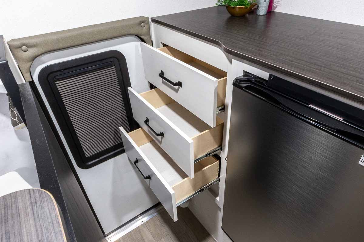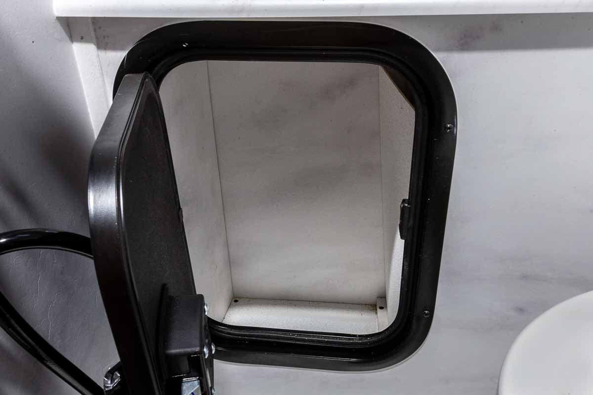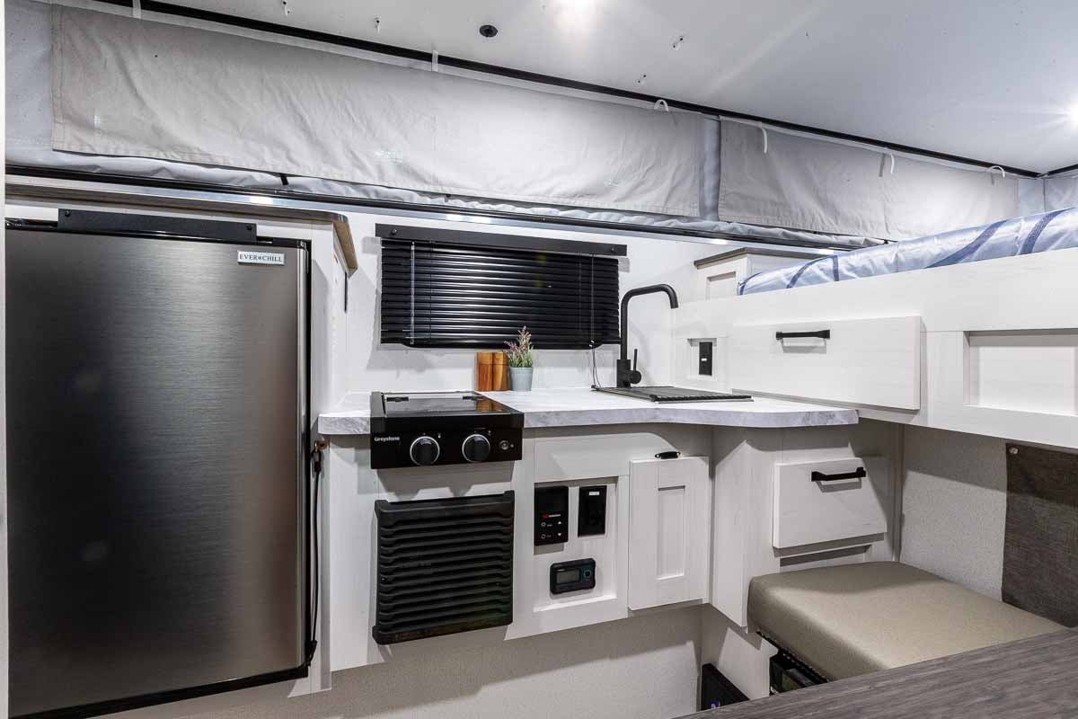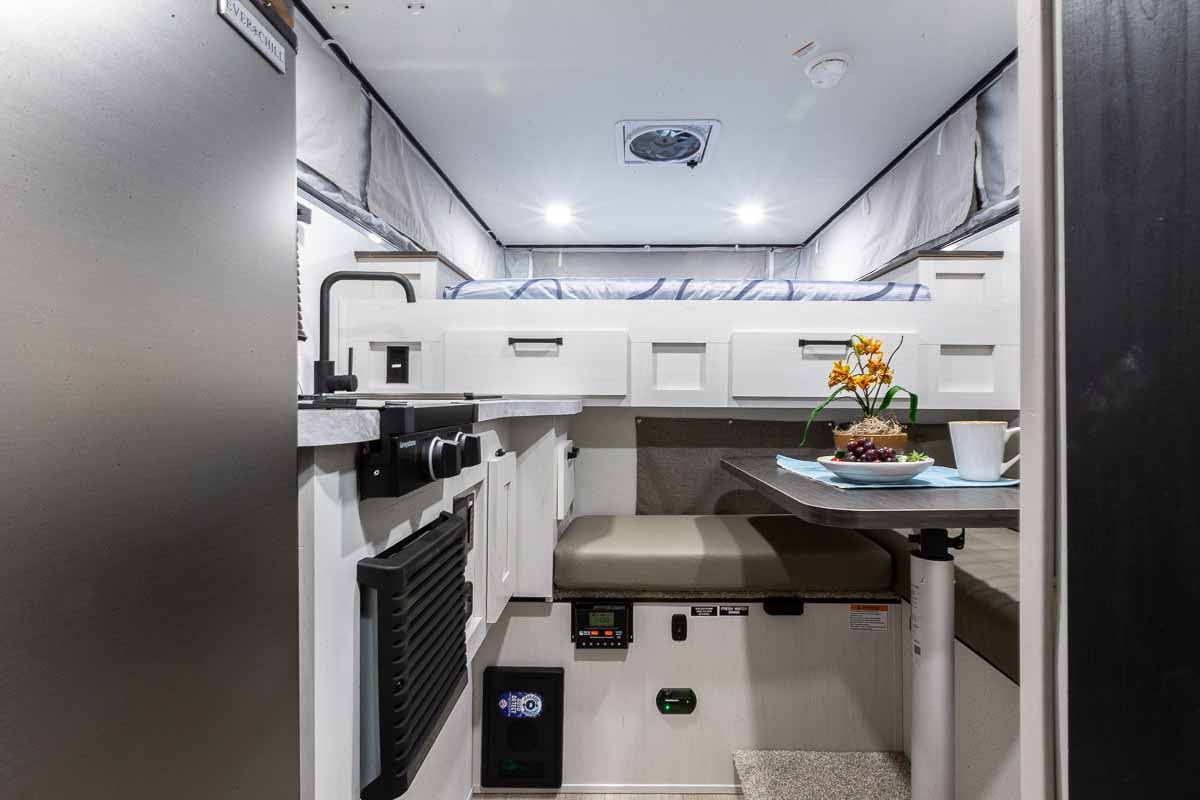 The Palomino BackPack SS-1251 for sale at Cheyenne Camping Center is very well equipped and includes a wet bath with shower and toilet, 400 watts of solar (two 200 watt panels), 100AH Lithium battery, cooktop, stainless sink with mix faucet, tankless water heater, 12V refrigerator/freezer, premium 3-speed power vent, 60″ x 80″ mattress, exterior battery charging port, shades/blinds, LED lighting, air conditioner prep, outside shower, ample storage including a closet, “foot locker” storage at the bed, wireless rear view camera prep, and much more! The Palomino SS-1251 truck camper will fit most full-size 6.5′ bed trucks.