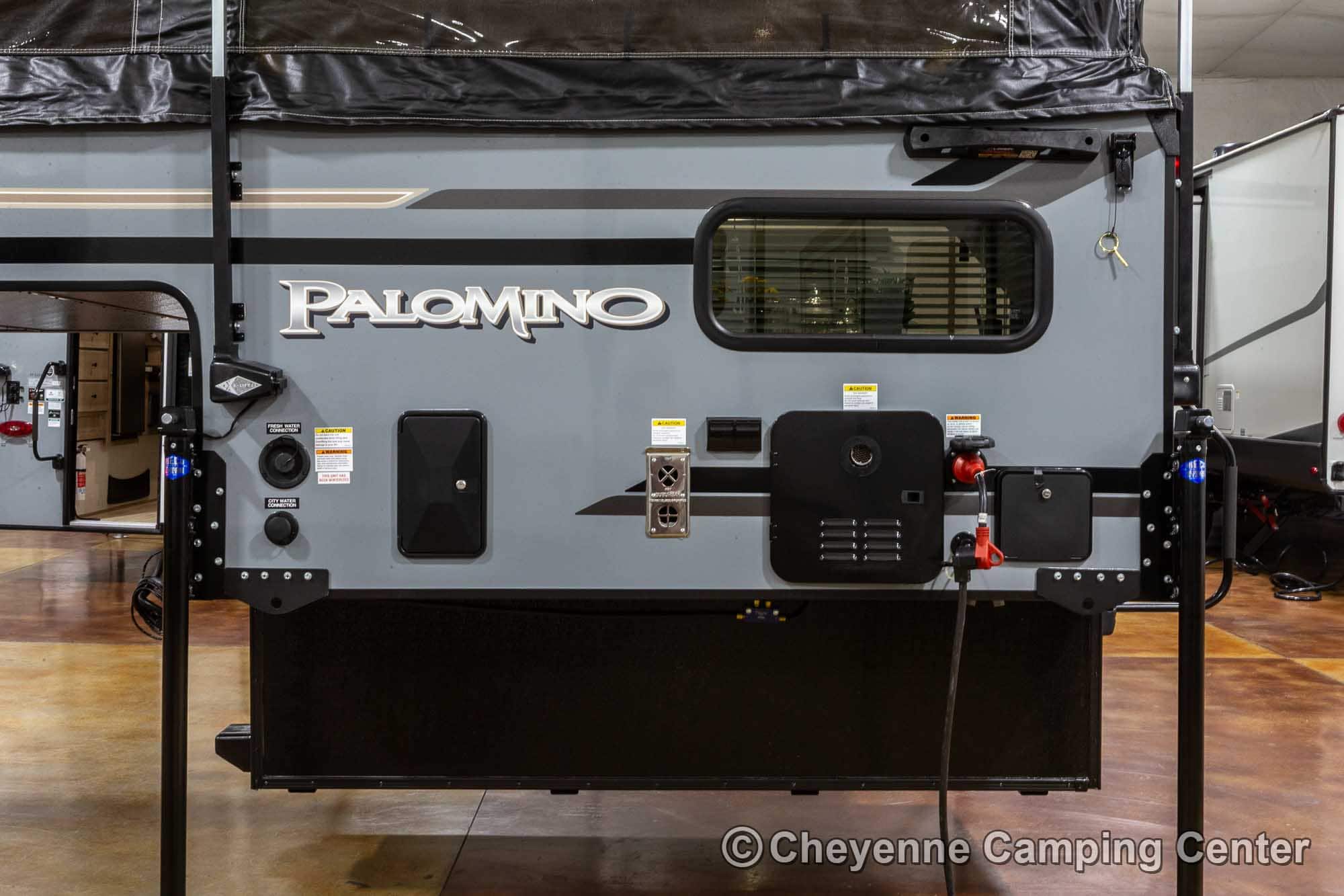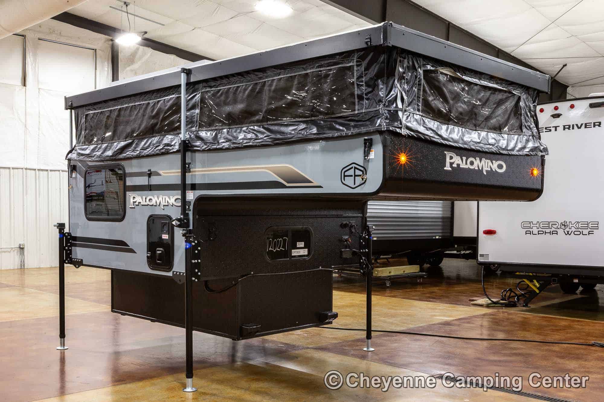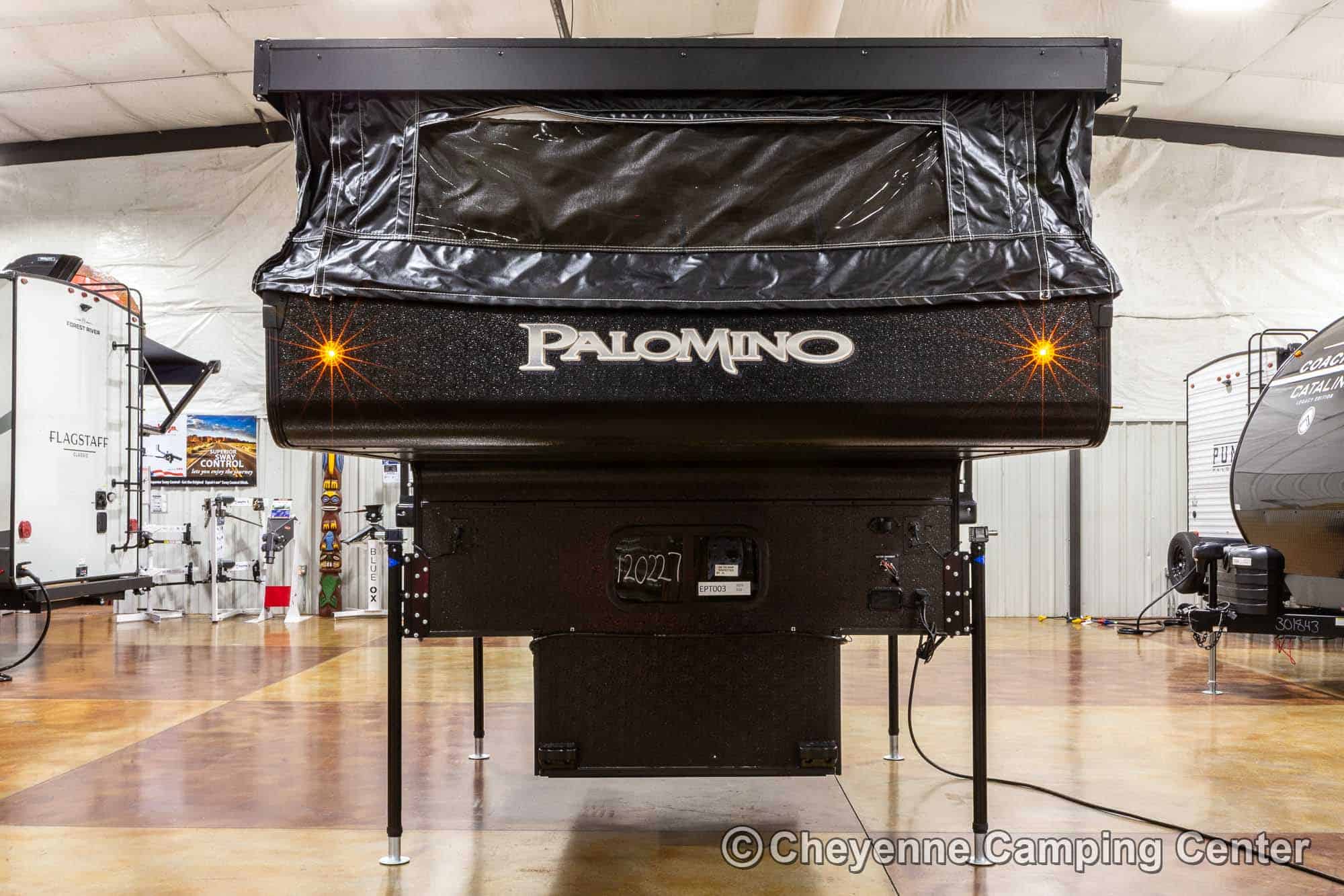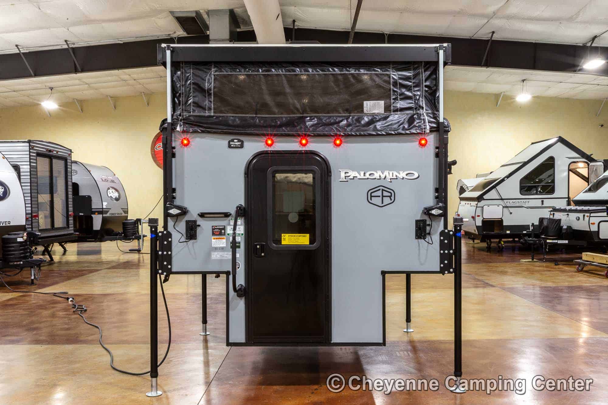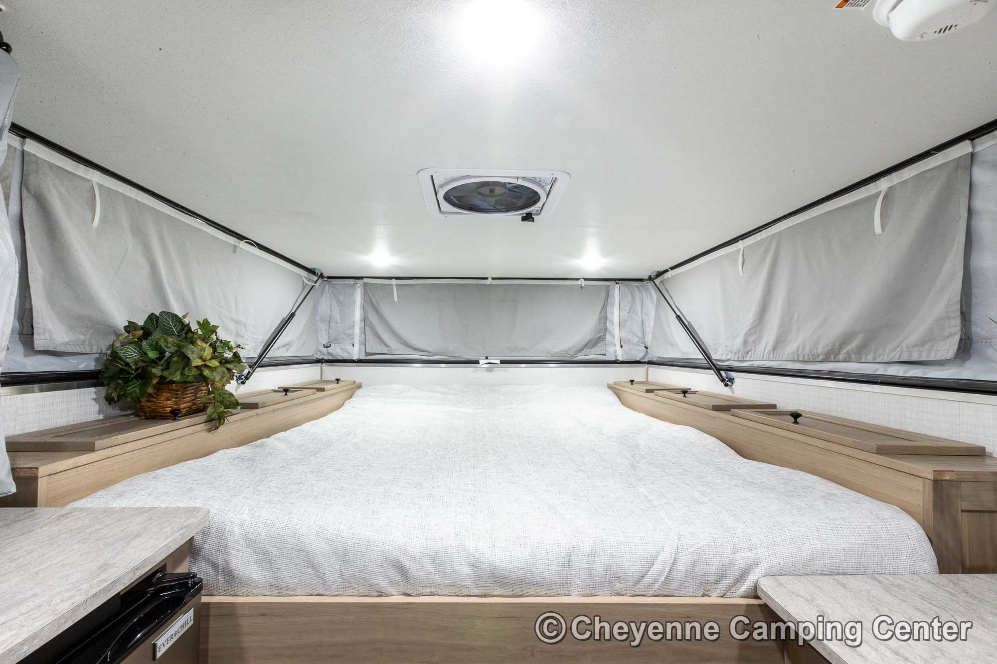 The SS-550 also includes a power lift roof, cooktop, large stainless steel sink with faucet, water pump, 12V refrigerator/freezer, an exterior battery charge port, a premium vent fan, an LP gas furnace, pre-wiring for air conditioning, LED interior lighting, USB charging port, shades, and a one-piece entry door. With an impressive 6′ 9″ interior height and smart storage throughout, this camper delivers comfort and functionality in a compact footprint. The 2026 Palomino BackPack SS-550 for sale at Cheyenne Camping Center is a smart, rugged choice for adventurers looking to explore.