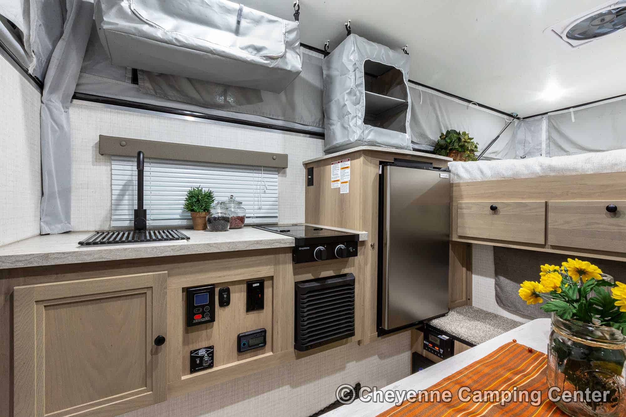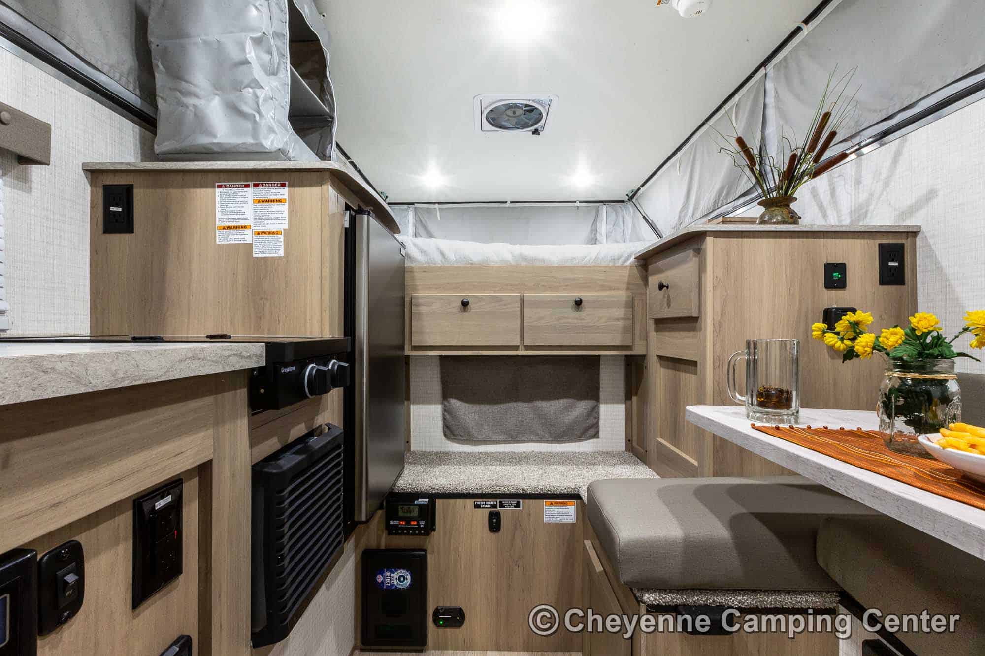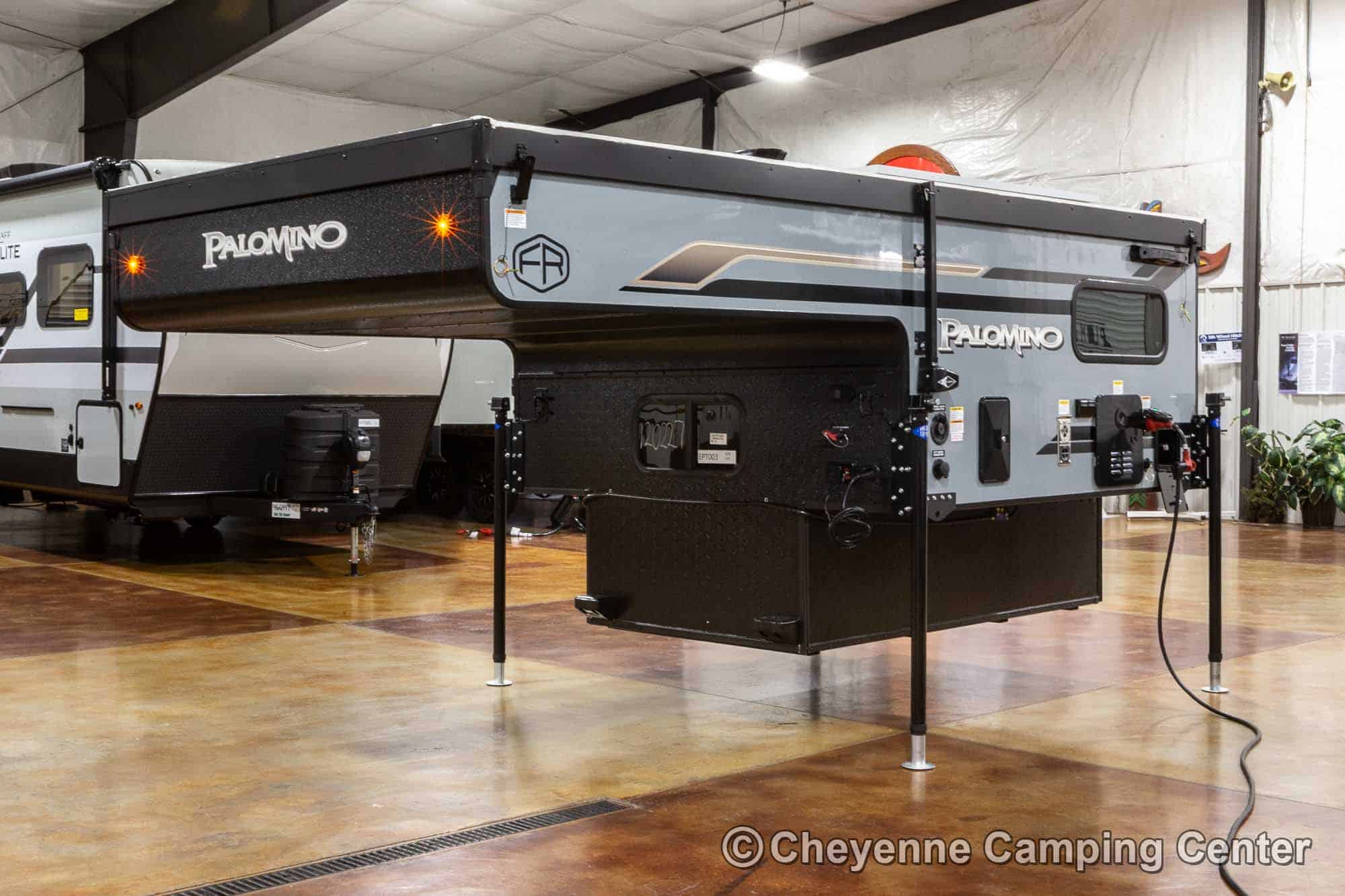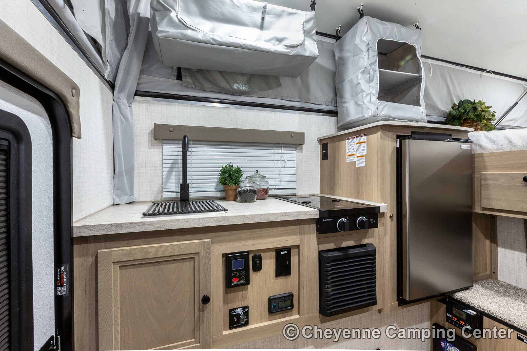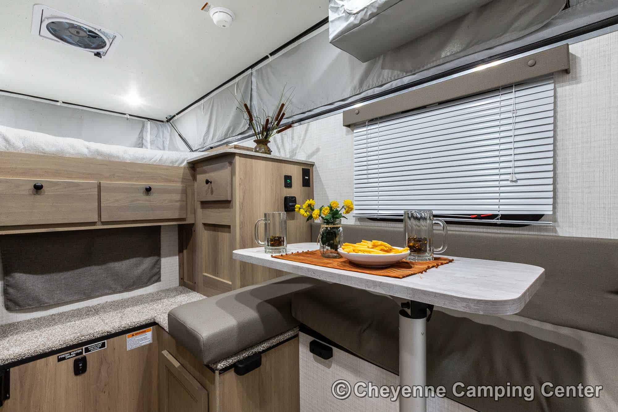 The SS-550 also includes a power lift roof, cooktop, large stainless steel sink with faucet, water pump, 12V refrigerator/freezer, an exterior battery charge port, a premium vent fan, an LP gas furnace, pre-wiring for air conditioning, LED interior lighting, USB charging port, shades, and a one-piece entry door. With an impressive 6′ 9″ interior height and smart storage throughout, this camper delivers comfort and functionality in a compact footprint. The 2026 Palomino BackPack SS-550 for sale at Cheyenne Camping Center is a smart, rugged choice for adventurers looking to explore.