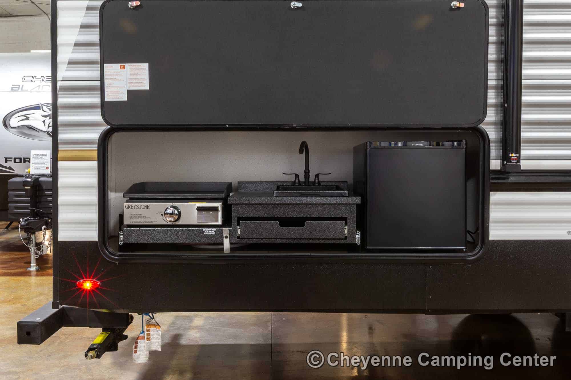 - Exterior Kitchen w/ 120V Refrigerator, LP Gas Griddle, and Sink