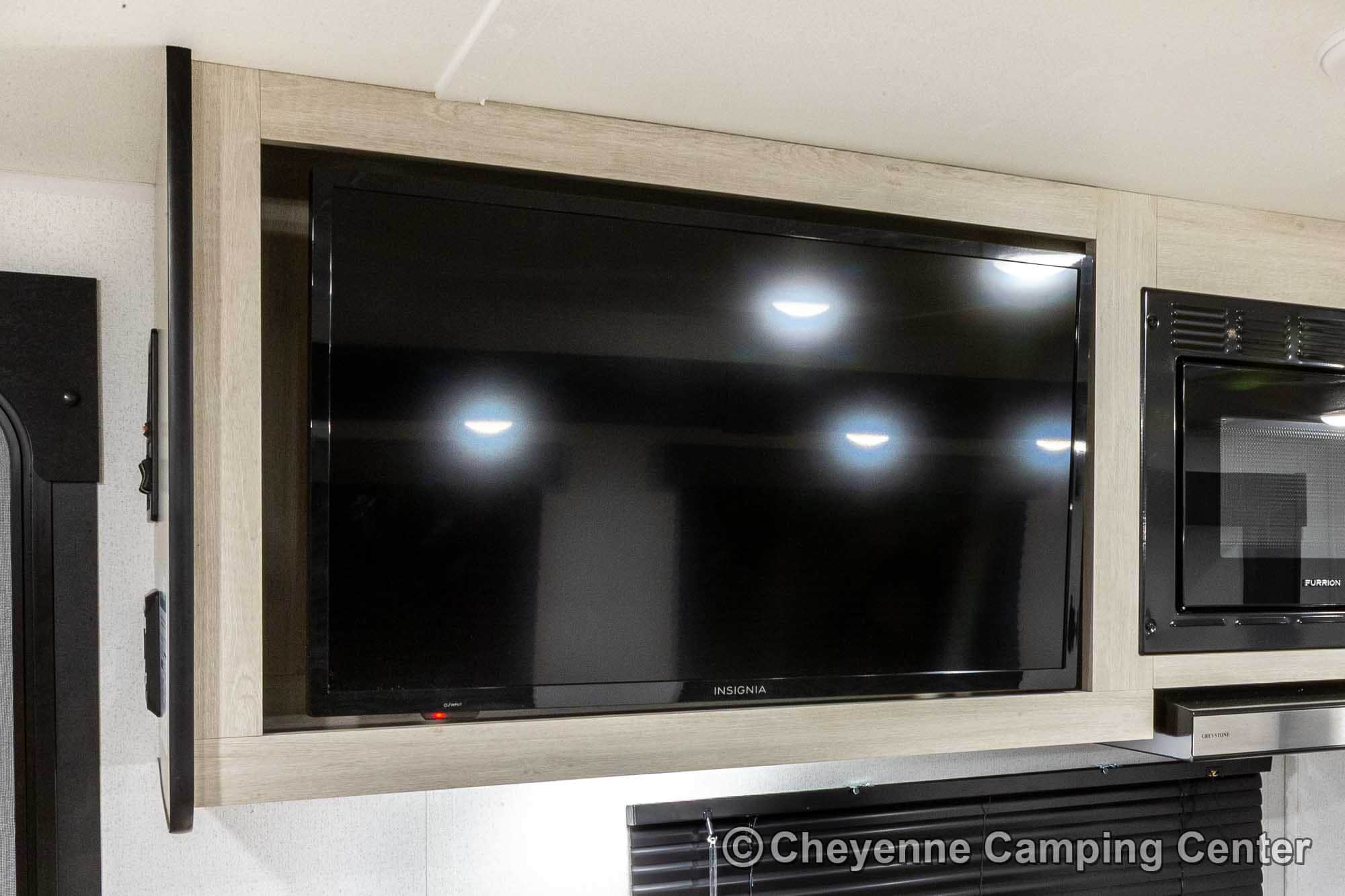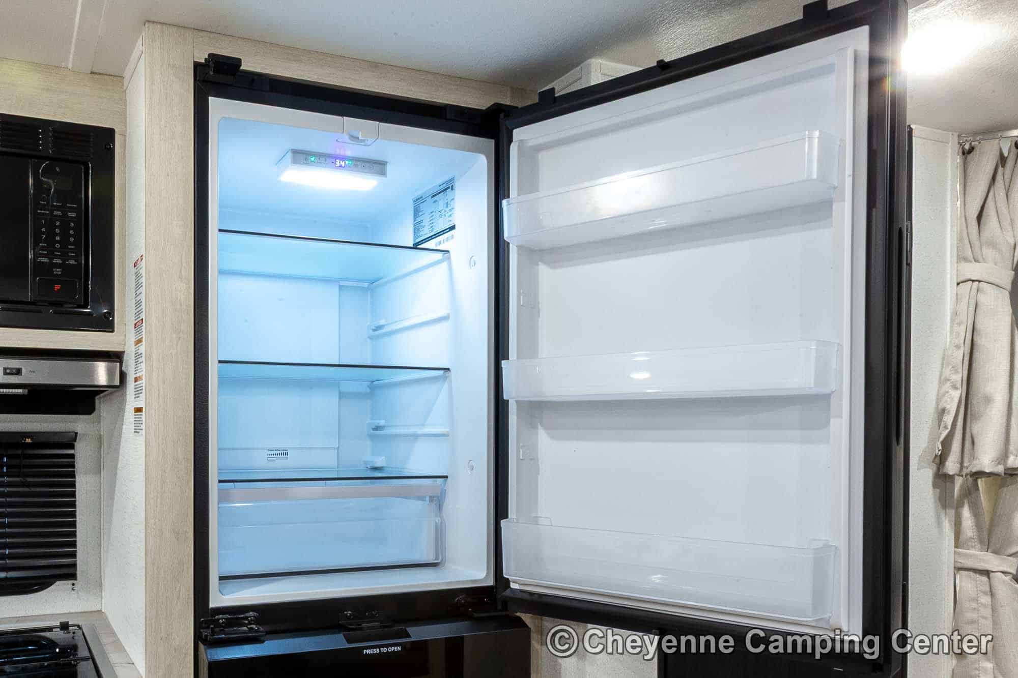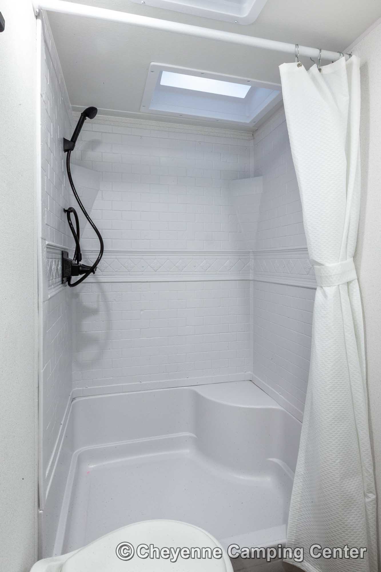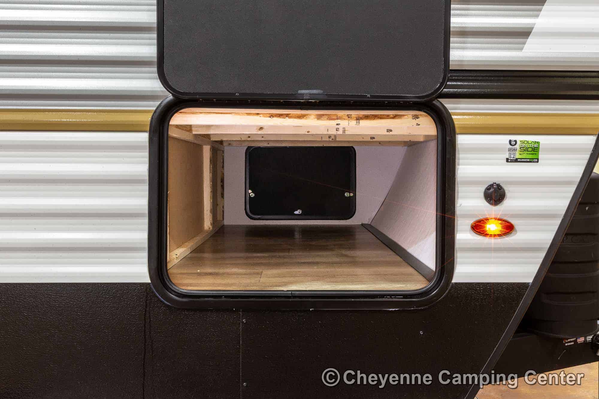 You’ll also have an AM/FM/HDMI/Bluetooth stereo, exterior marine-grade speakers, a 32” HD TV, a 10.7 cu. ft. 12V refrigerator, an outdoor shower, a roof-mounted RV A/C, a 15′ power awning with LED lighting, solar prep, a 12V RV battery, a one-year manufacturer’s warranty, one-year complimentary 24/7 roadside assistance, and much more.