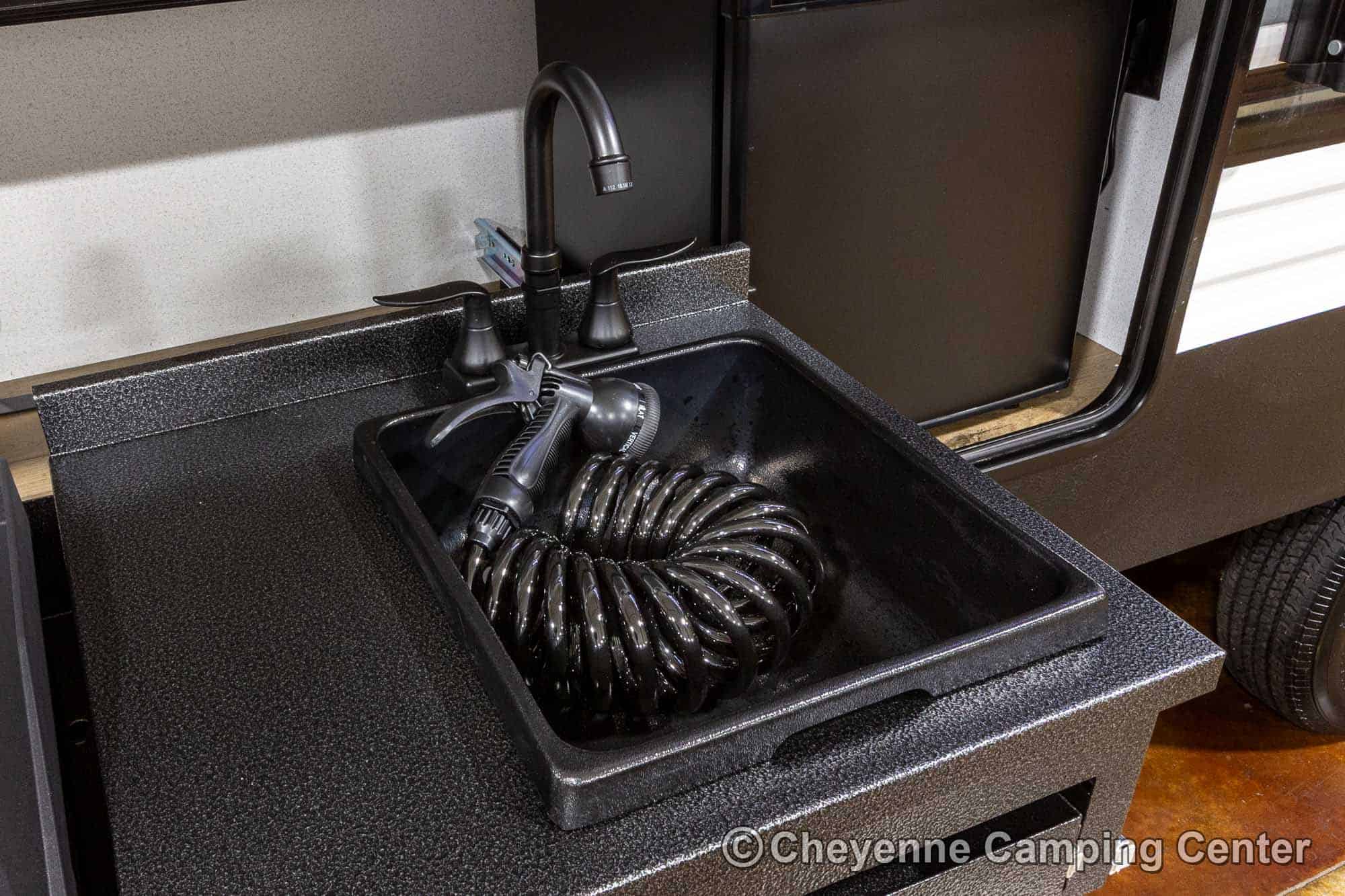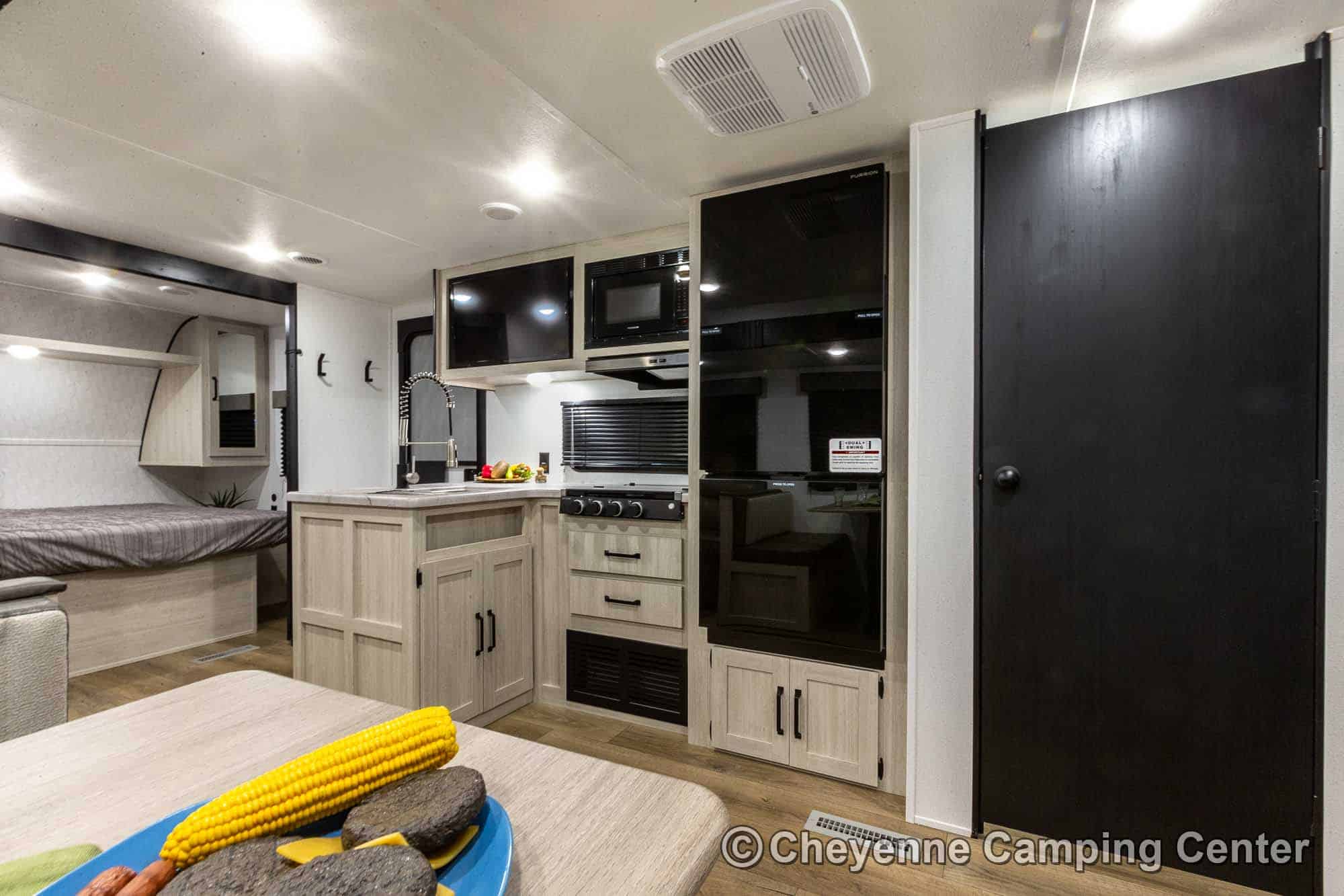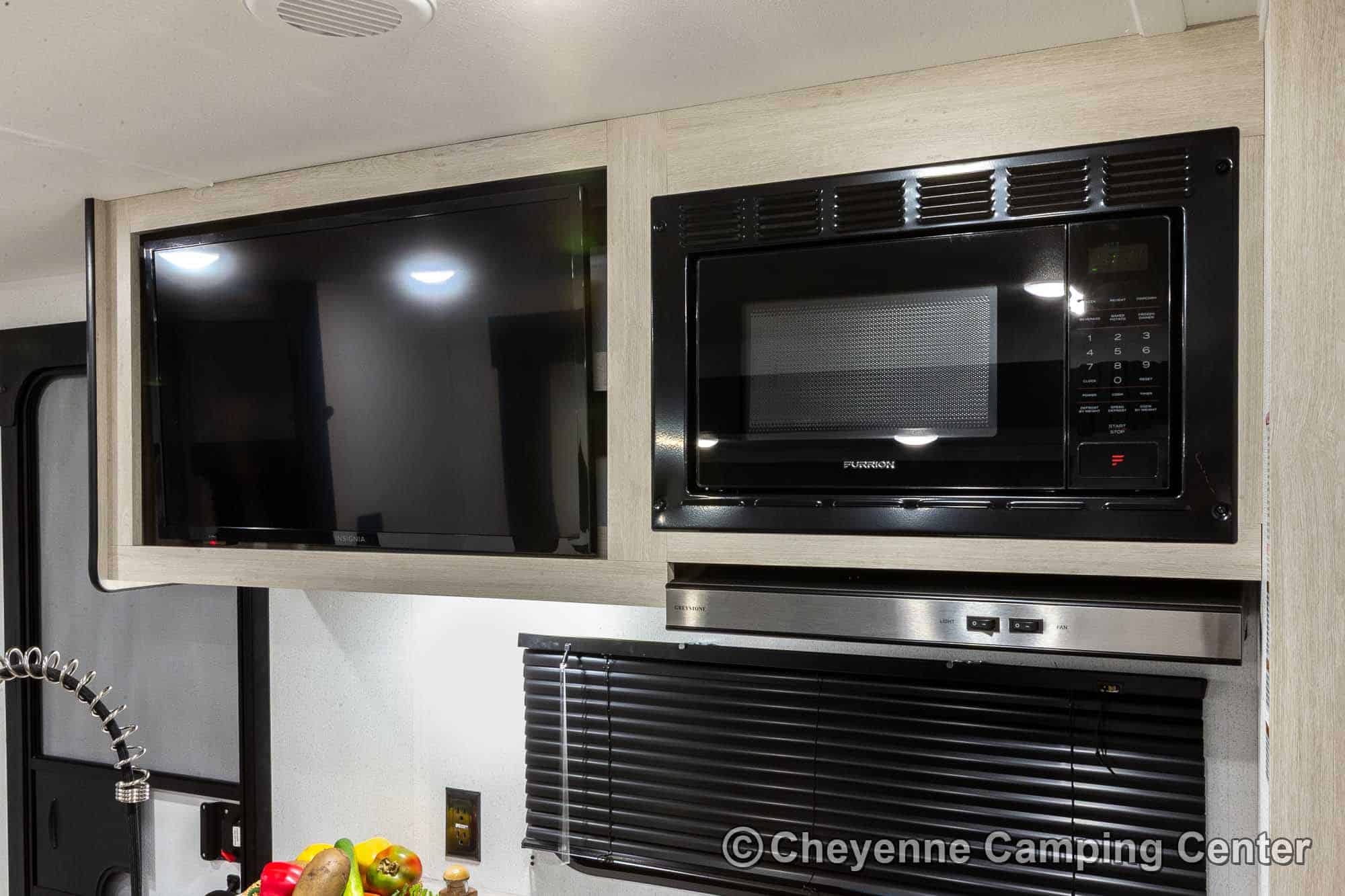 You’ll also have an AM/FM/HDMI/Bluetooth stereo, exterior marine-grade speakers, a 32” HD TV, a 10.7 cu. ft. 12V refrigerator, an outdoor shower, a roof-mounted RV A/C, a 15′ power awning with LED lighting, solar prep, a 12V RV battery, a one-year manufacturer’s warranty, one-year complimentary 24/7 roadside assistance, and much more.
