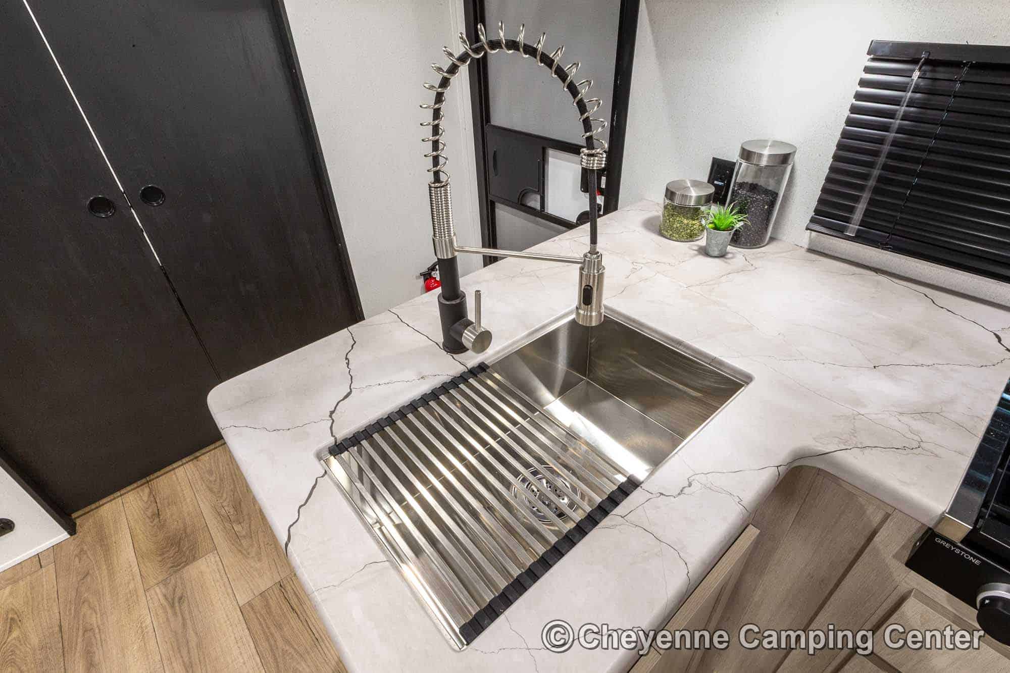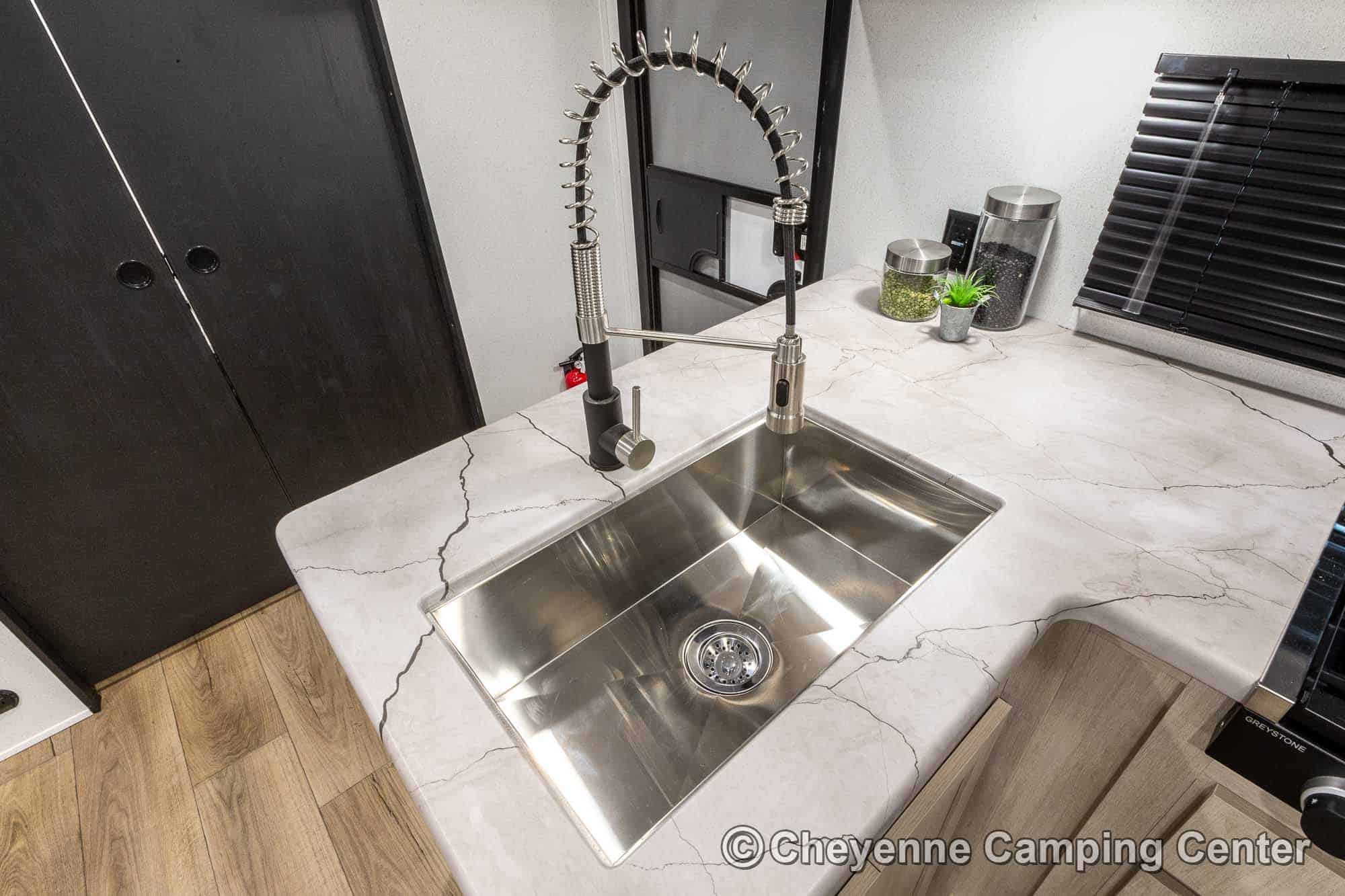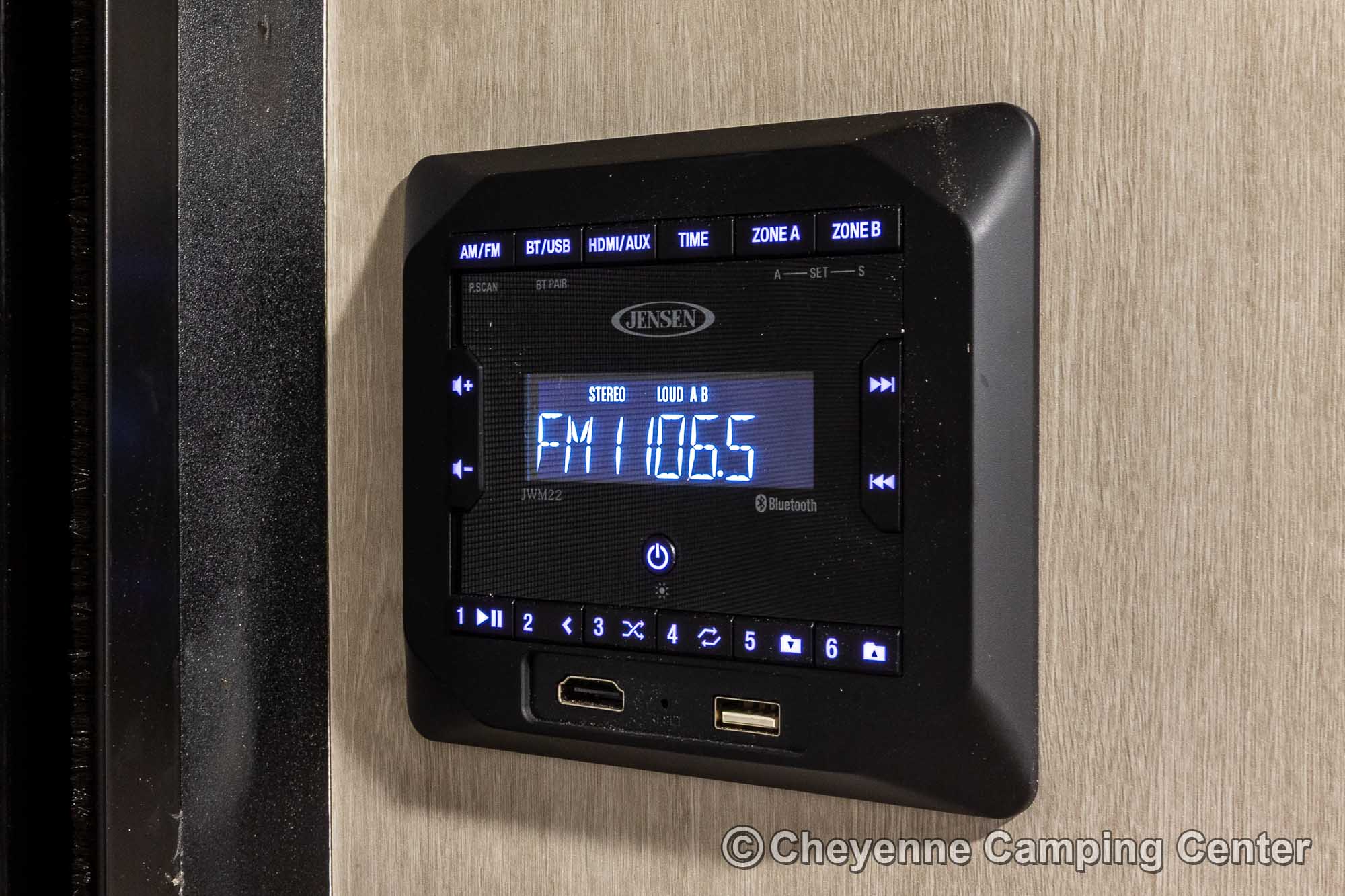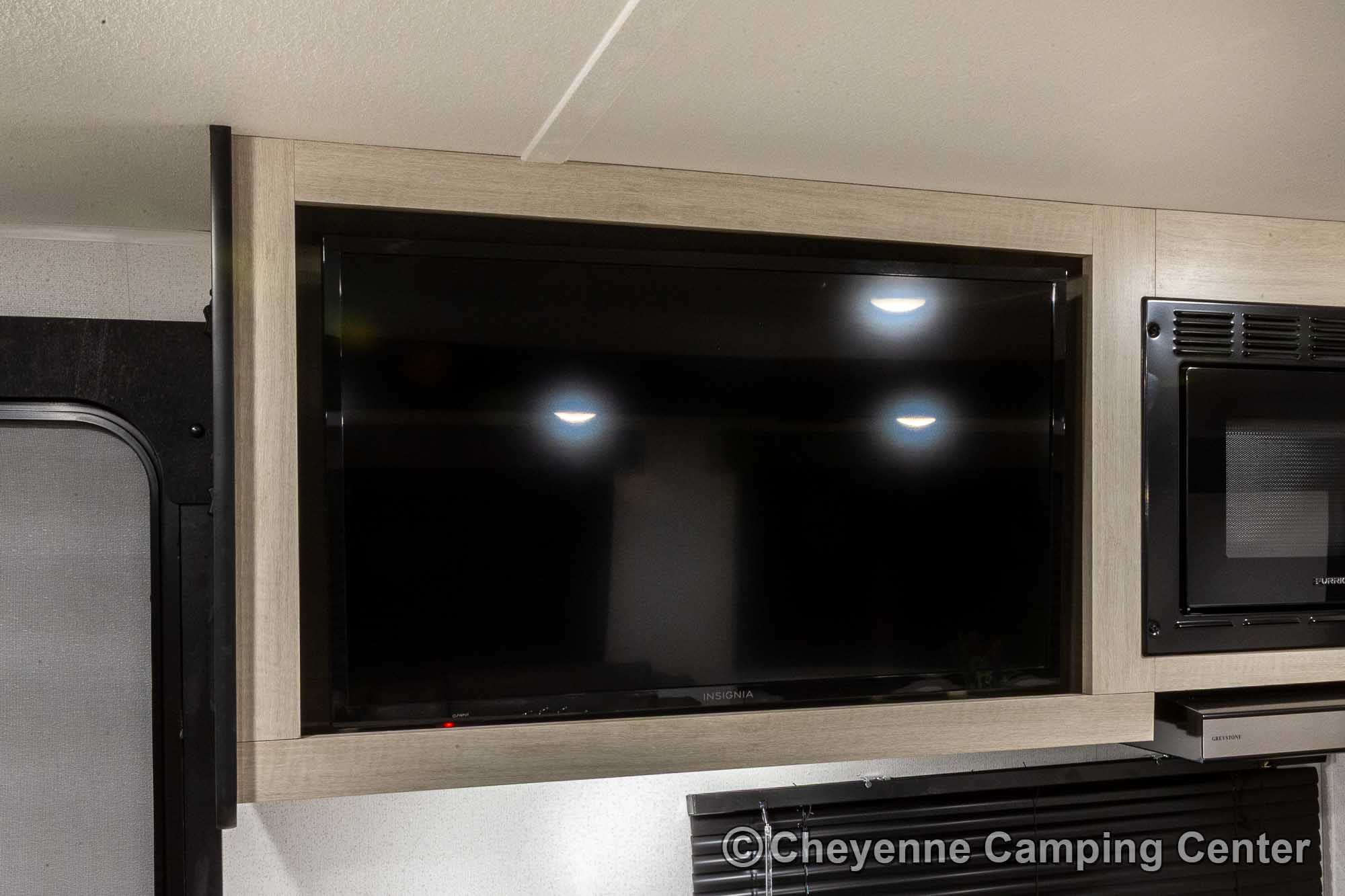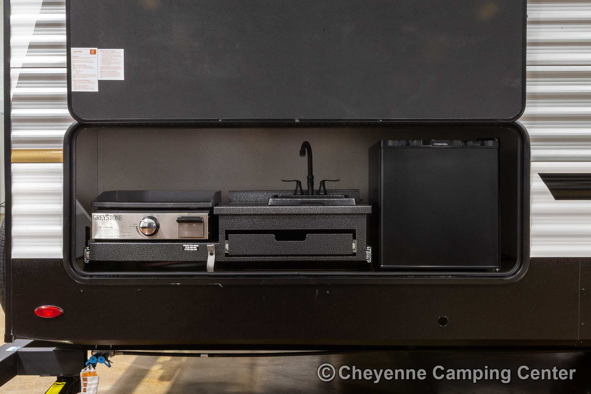 You’ll also have an AM/FM/HDMI/Bluetooth stereo, exterior marine grade speakers, a 32” HD TV, 10.7 cu. ft. 12V refrigerator, outdoor shower, a roof-mounted RV A/C, a 15′ power awning with LED lighting, solar prep, a 12V RV battery, one year manufacturer’s warranty, one year complimentary 24/7 roadside assistance, and much more.