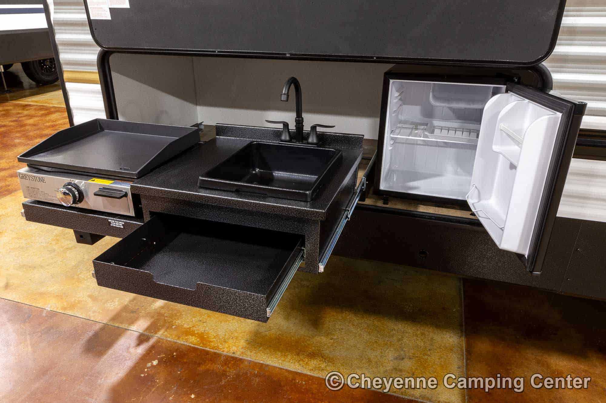 - Exterior Kitchen w/ 120V Refrigerator, LP Gas Griddle, and Sink